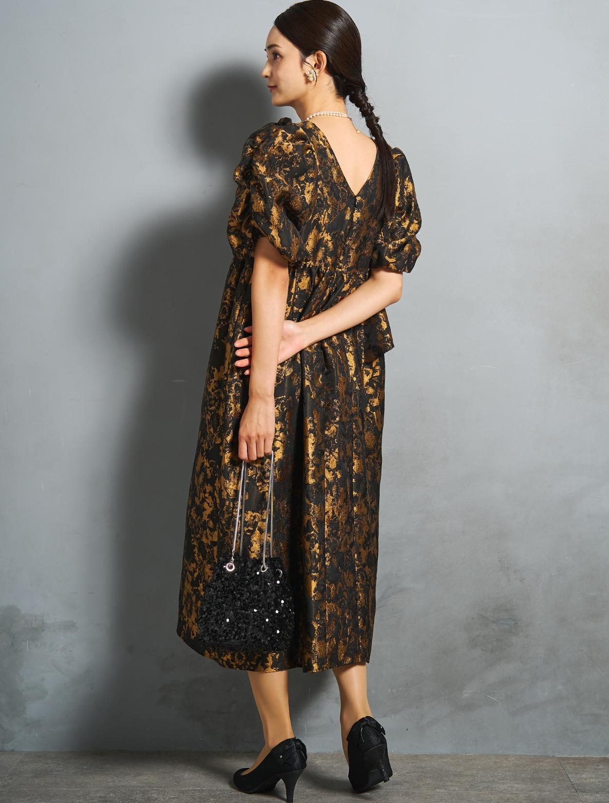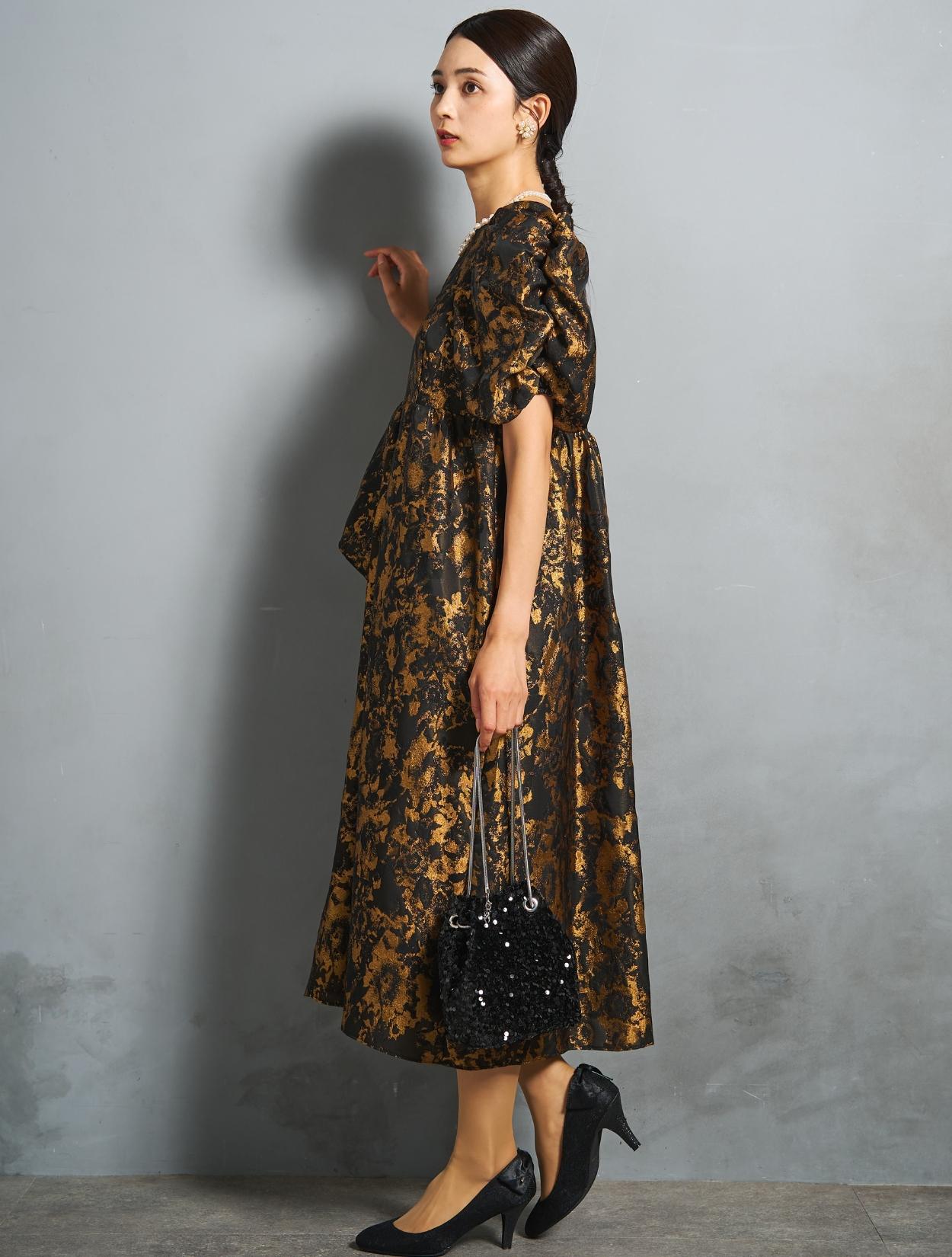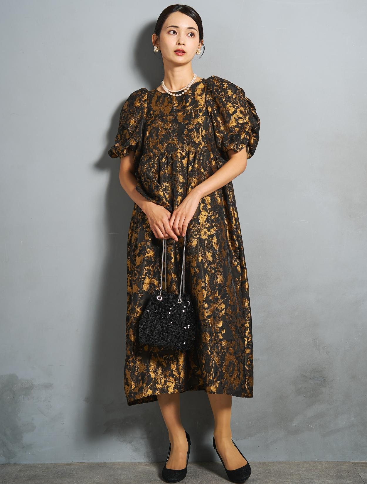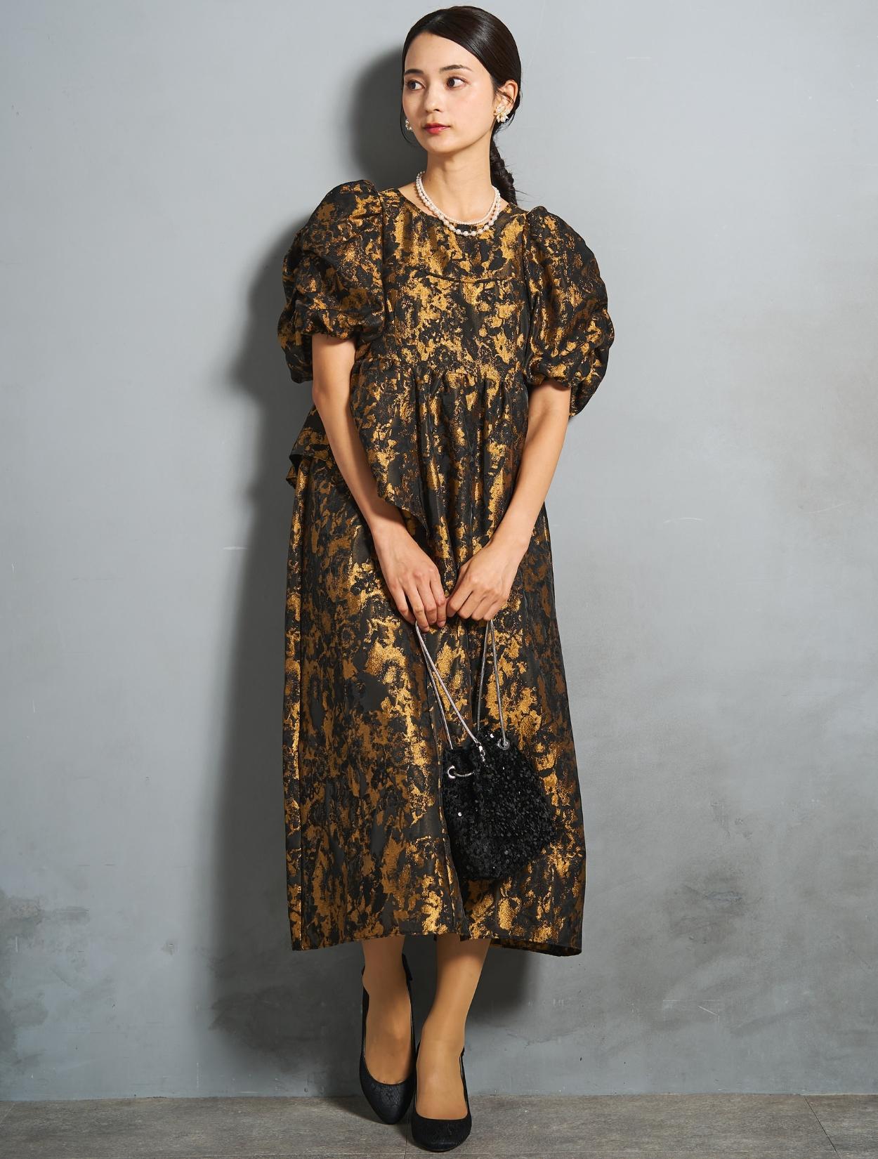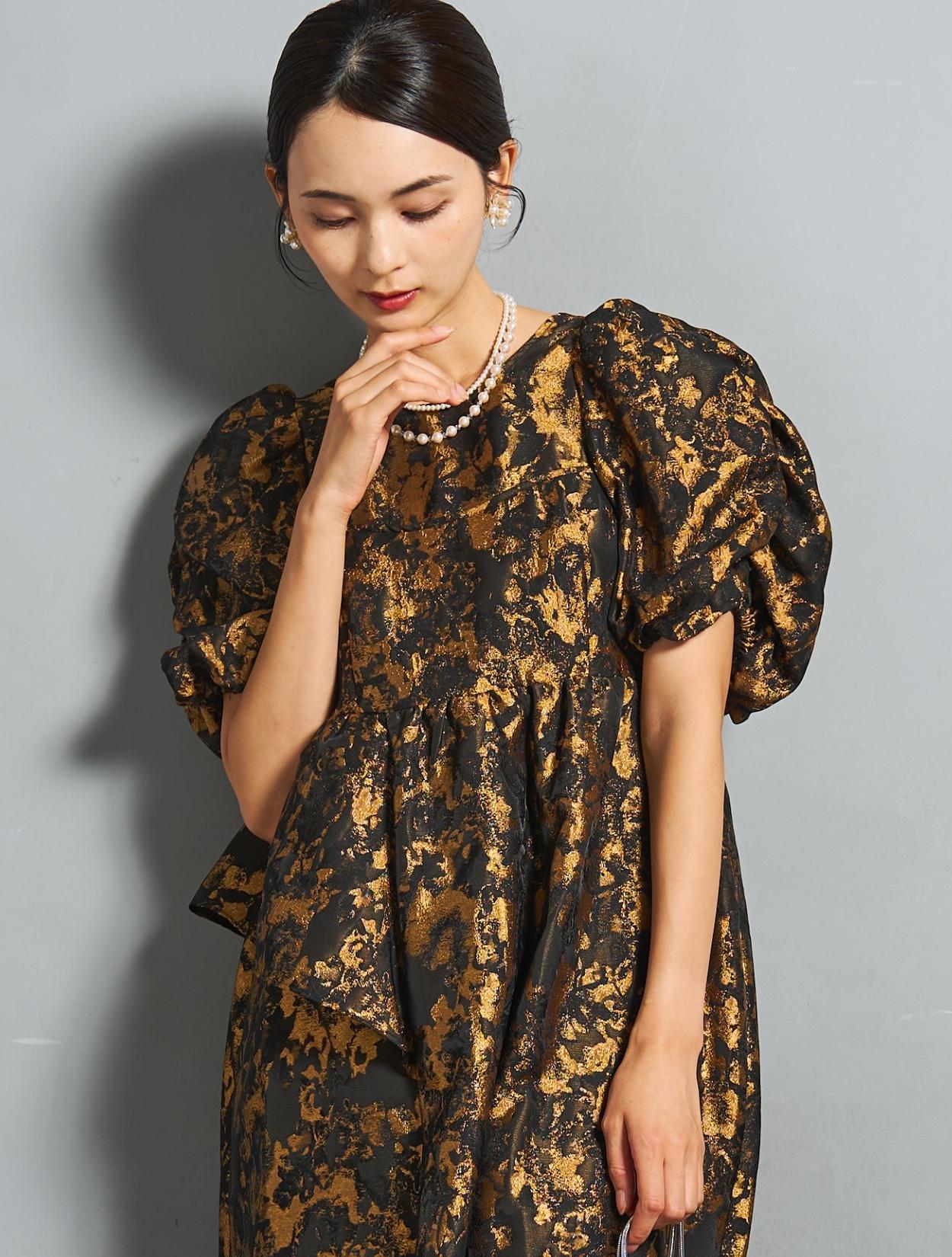 光沢のある糸を織り交ぜた、高級感と立体感のあるジャガード生地がポイントのドレス。上品な生地のフォーマル感と、オーバーシルエットのボリューム感のバランスが絶妙。今っぽくもクラシカルな印象で着こなせます。