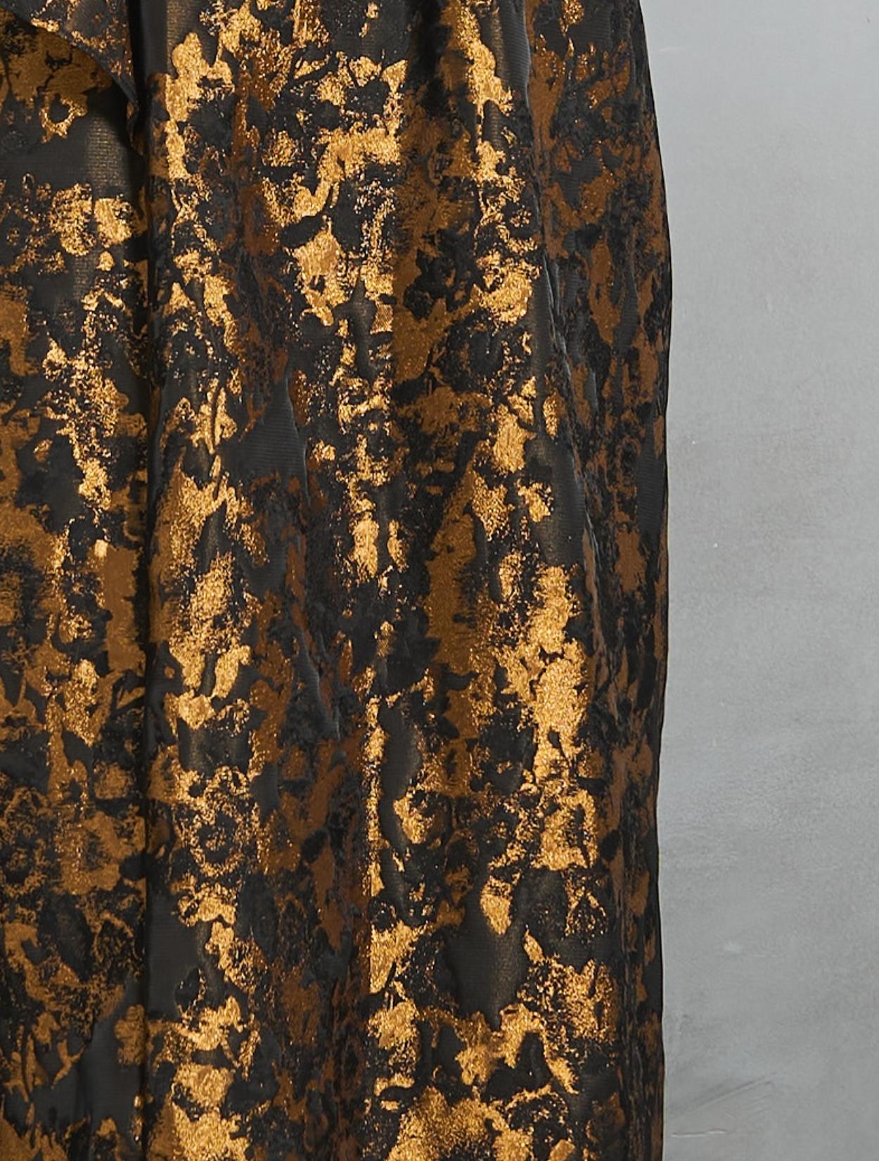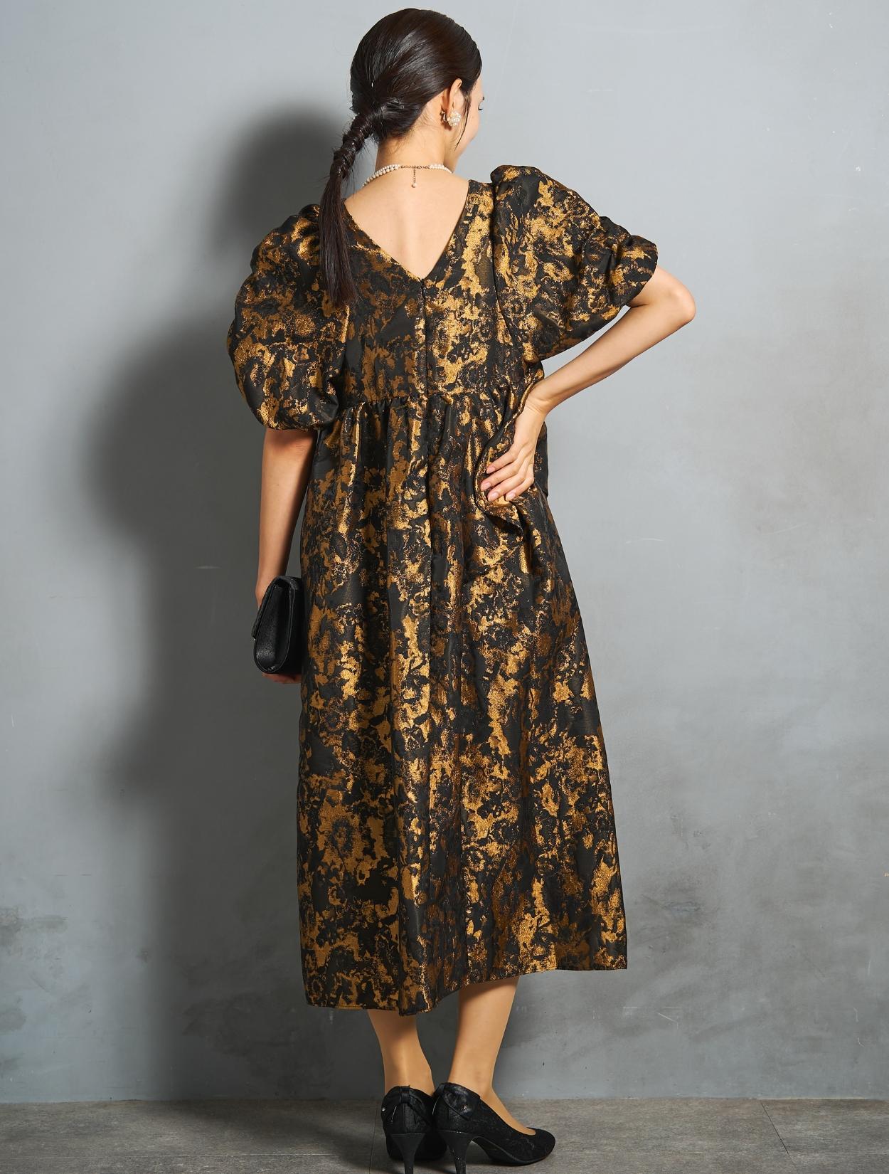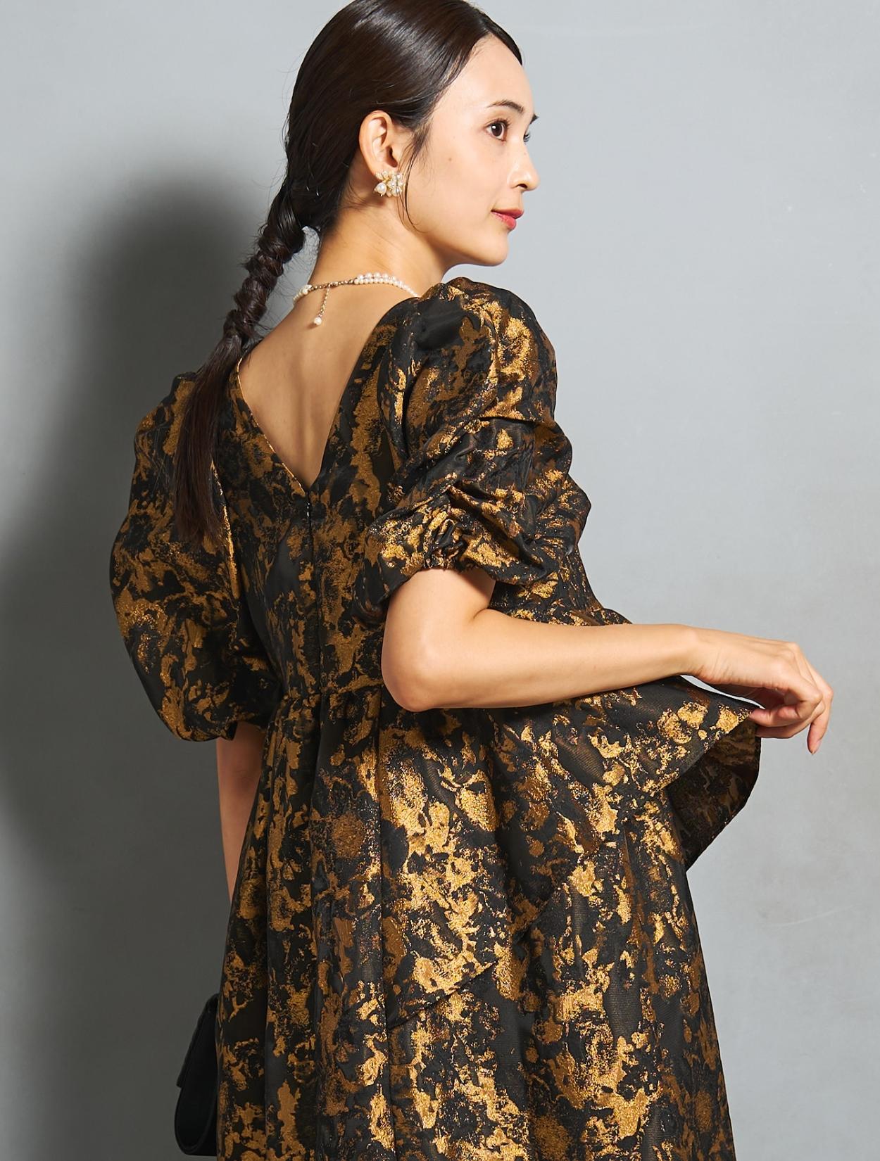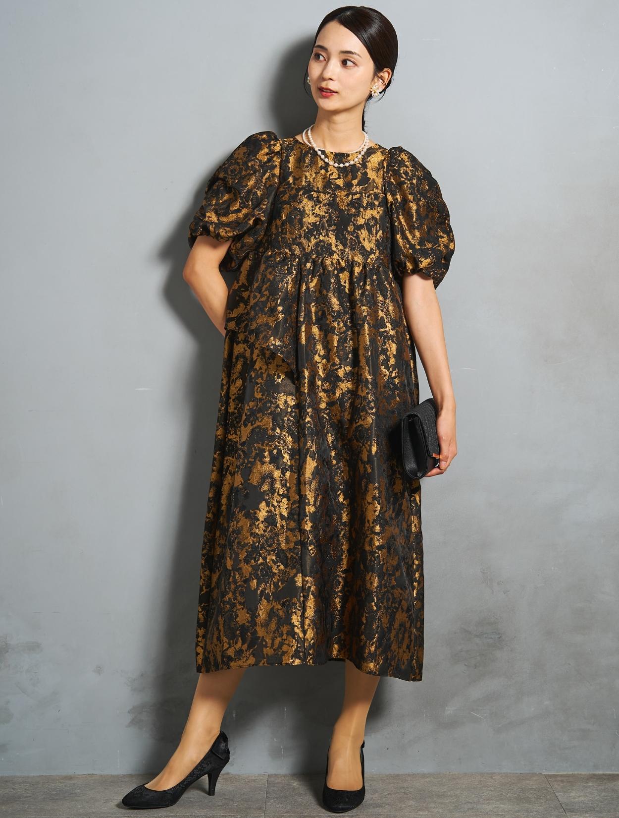 光沢のある糸を織り交ぜた、高級感と立体感のあるジャガード生地がポイントのドレス。上品な生地のフォーマル感と、オーバーシルエットのボリューム感のバランスが絶妙。今っぽくもクラシカルな印象で着こなせます。