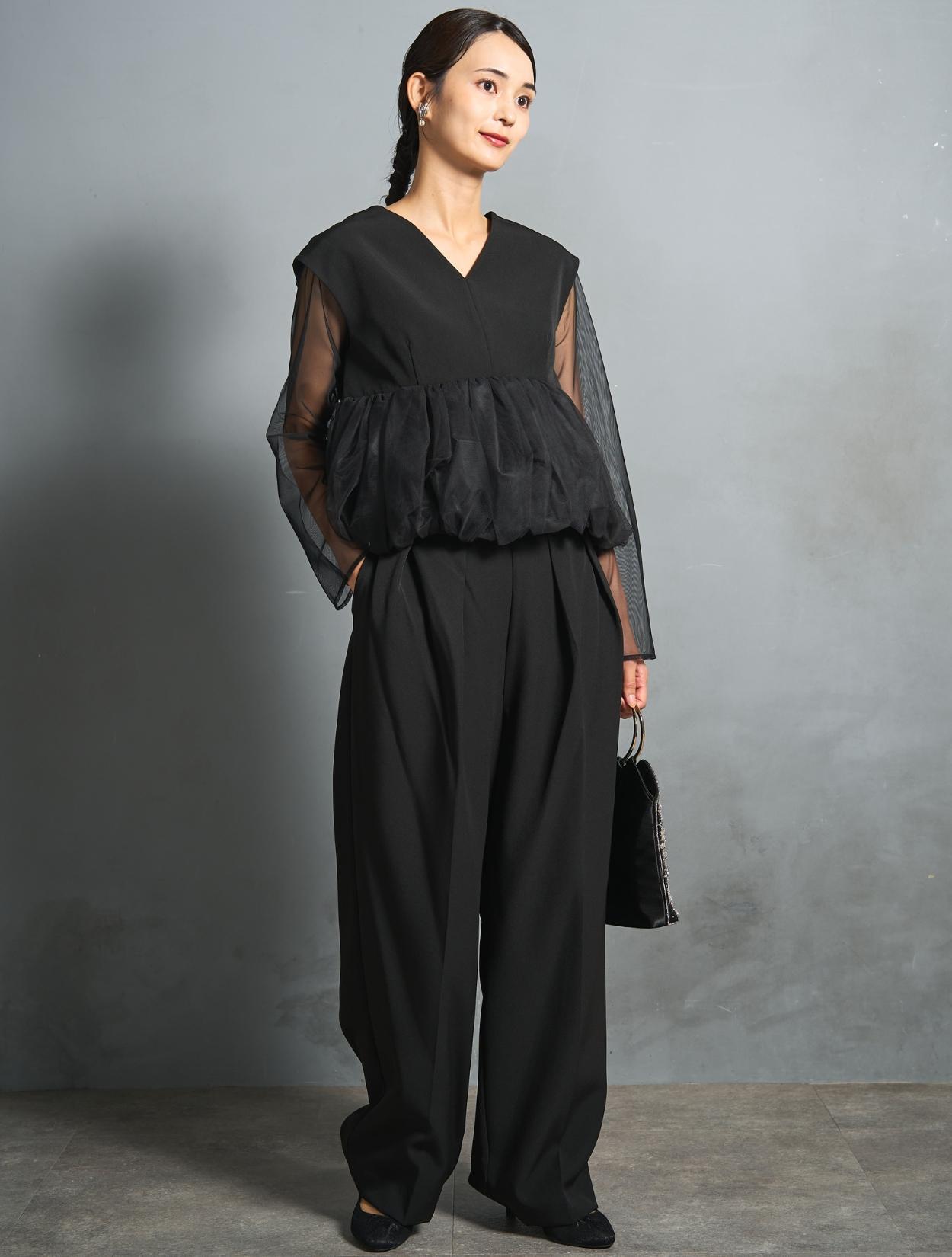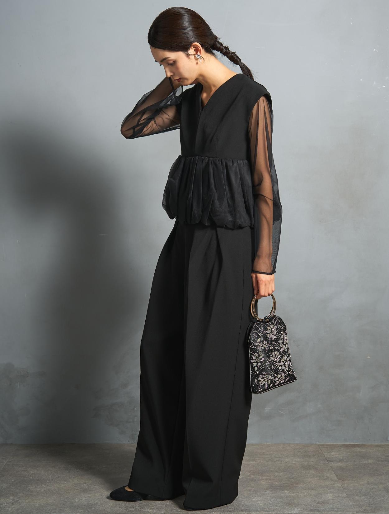 チュールのボリュームペプラムがポイントのパンツドレス。かっこいいパンツスタイルに、大人かわいいディテールを入れたこなれ感のある着こなしができます。高い位置での切り替えは脚長効果も抜群。