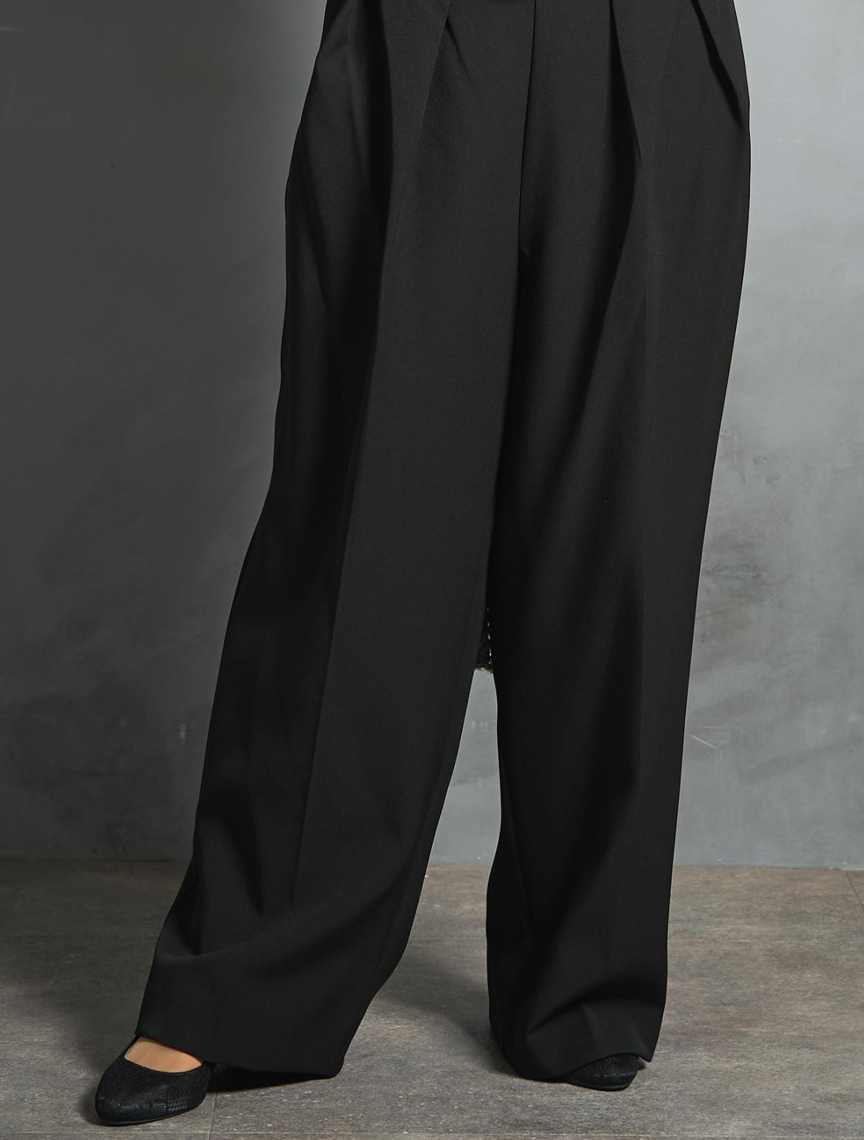 ワイドなシルエットのパンツには、センタークリースが入っていてきちんと感もあり。しっかりヒールパンプスで合わせると、フォーマル度がアップします。