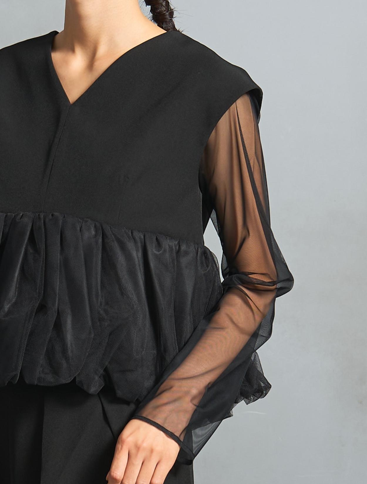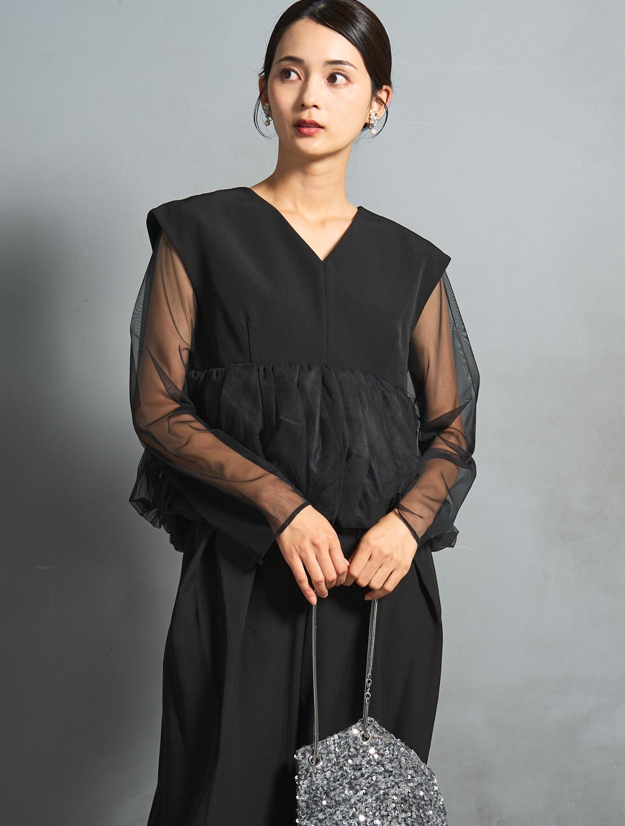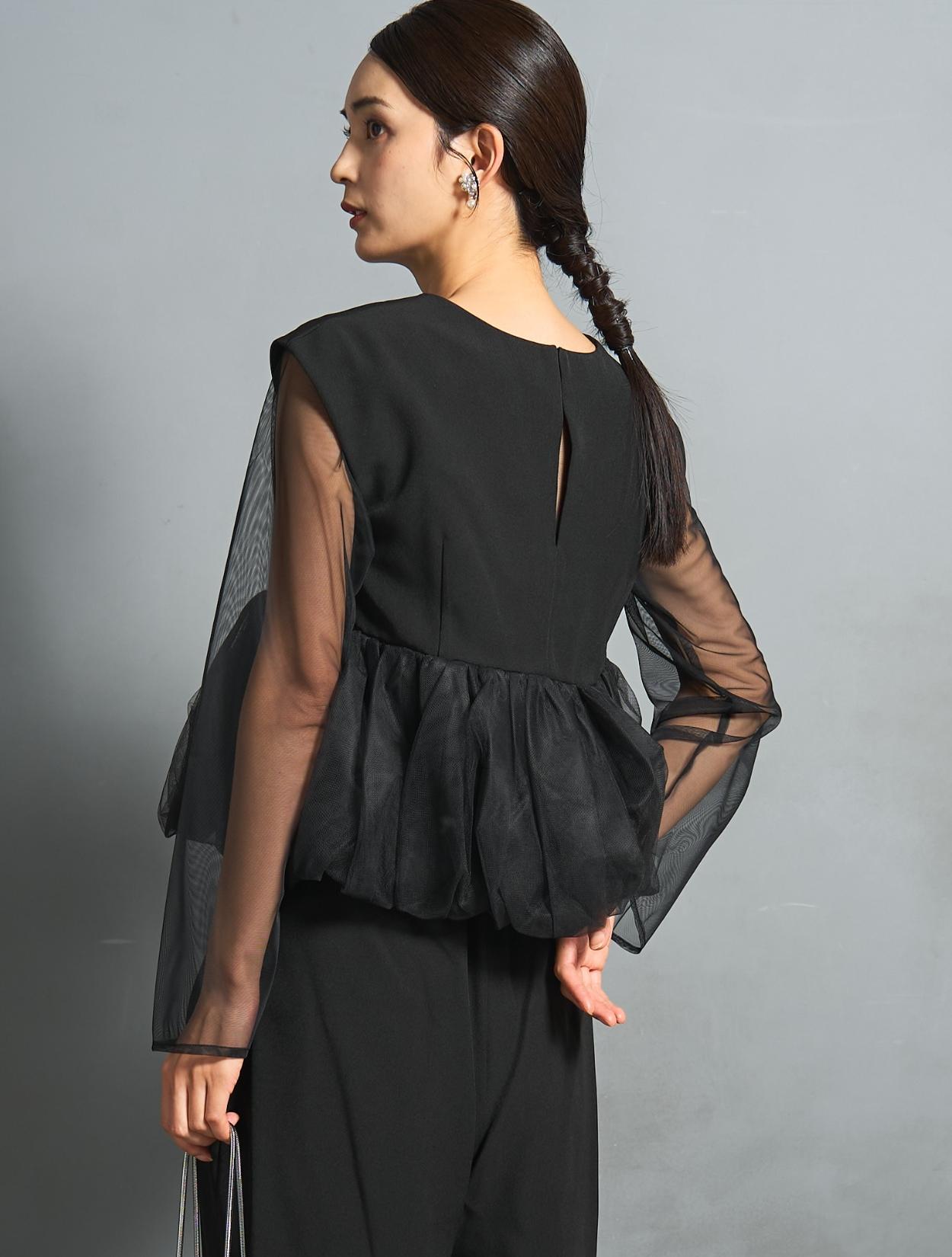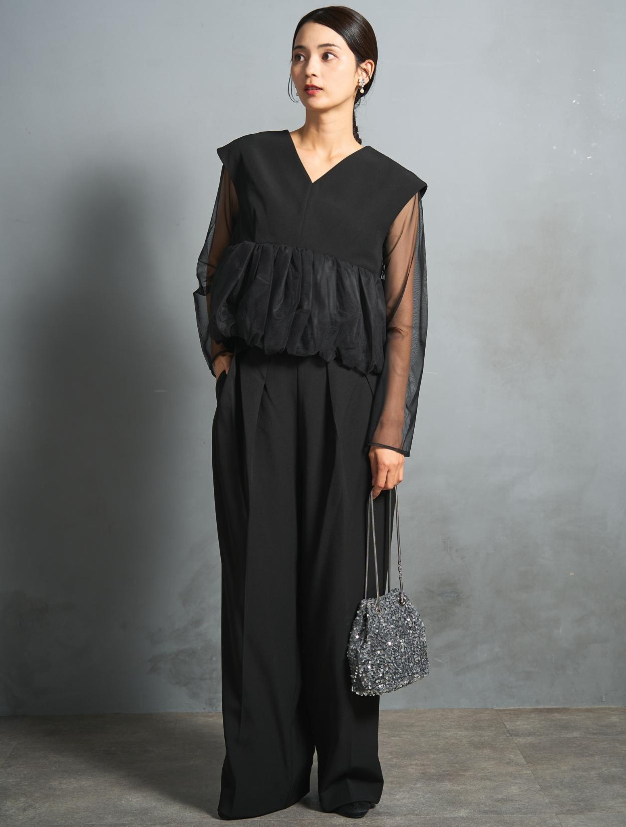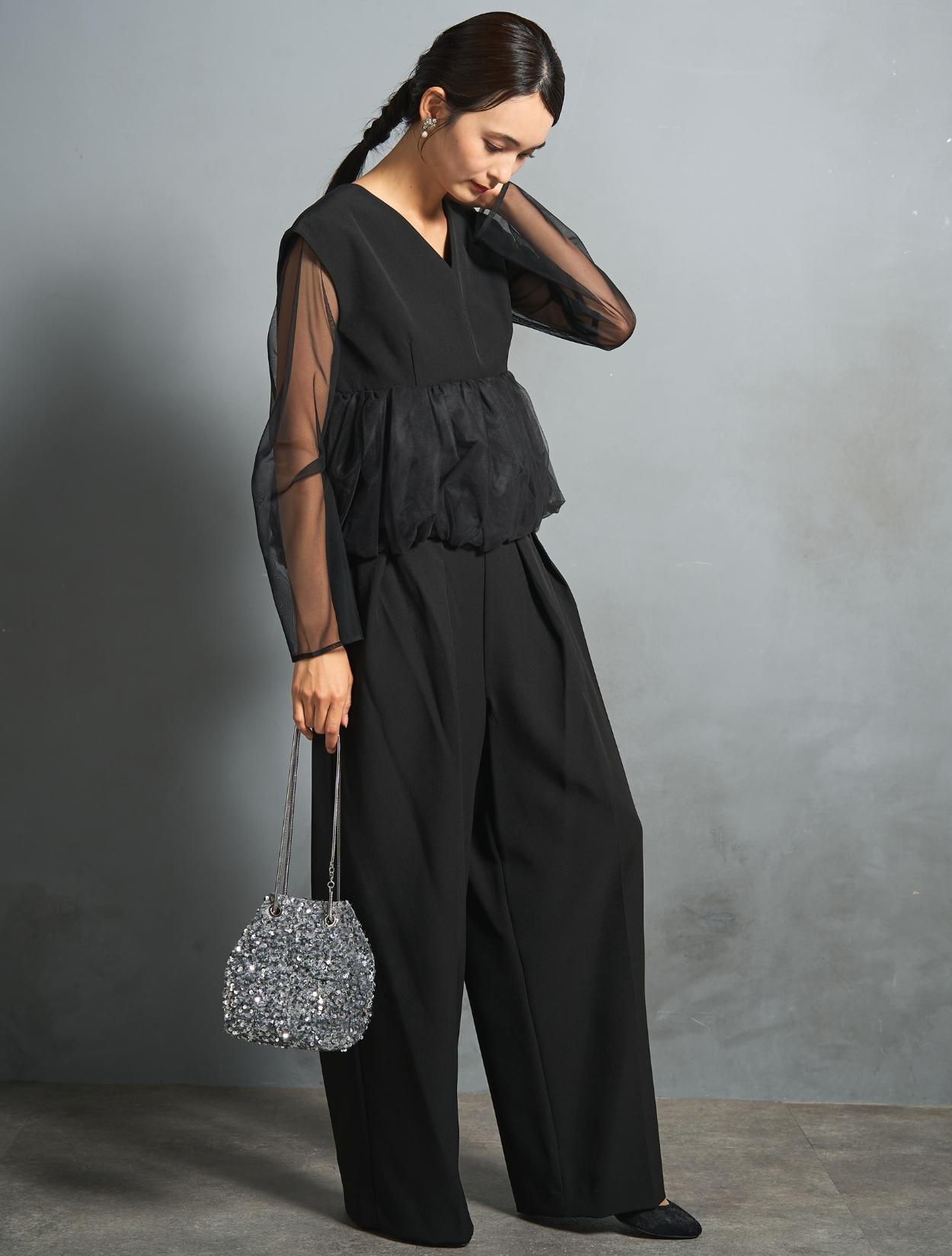 チュールのボリュームペプラムがポイントのパンツドレス。かっこいいパンツスタイルに、大人かわいいディテールを入れたこなれ感のある着こなしができます。高い位置での切り替えは脚長効果も抜群。