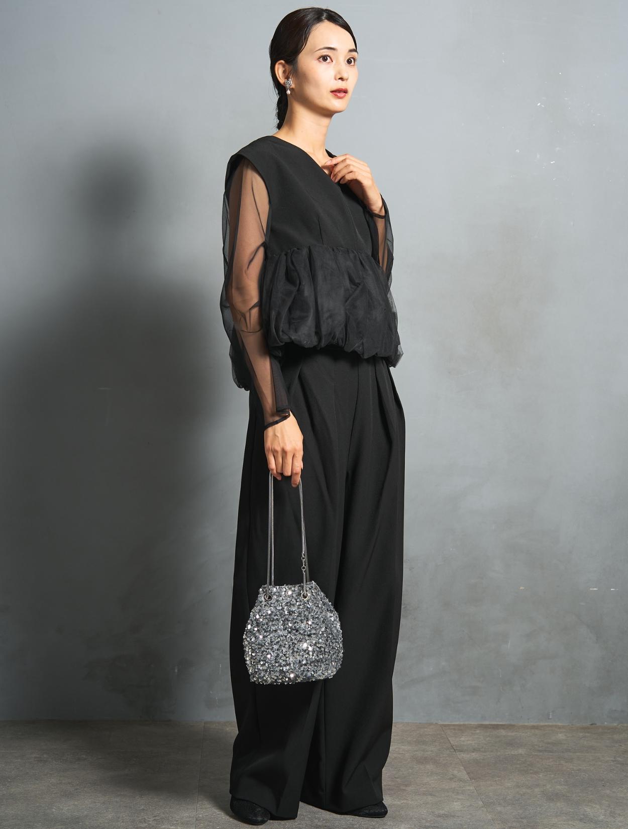 ブラックのパンツドレスにシルバーのスパンコールバッグが映えるトレンドコーデ。巾着バッグのいい意味での程よいラフさは、大人の頑張りすぎないスタイルに。バッグはショルダーにもなるので、両手を空けたいお子様連れにもおすすめです。Vネックのデザインを生かすために、ネックレスではなくイヤリングをセレクト。華やかさとフォーマル感のあるパールとクリスタルビジューのイヤリングは、パンツドレスをパーティー仕様にアップデートしてくれます。