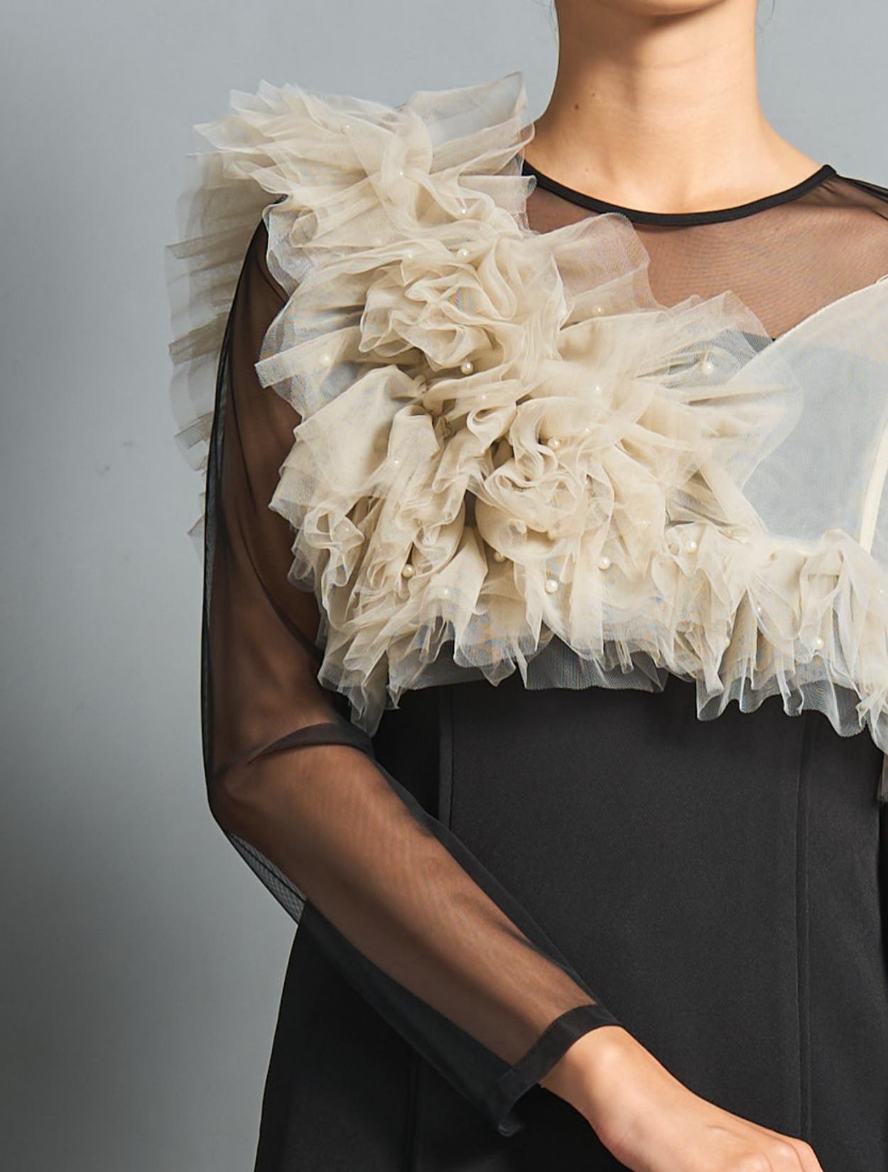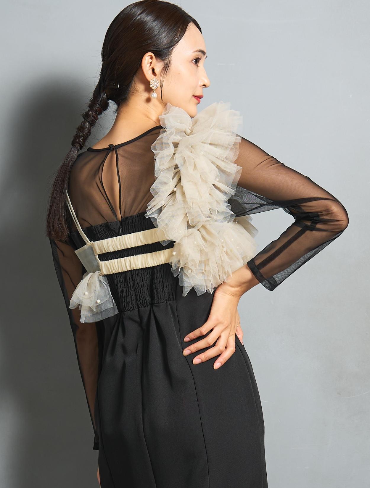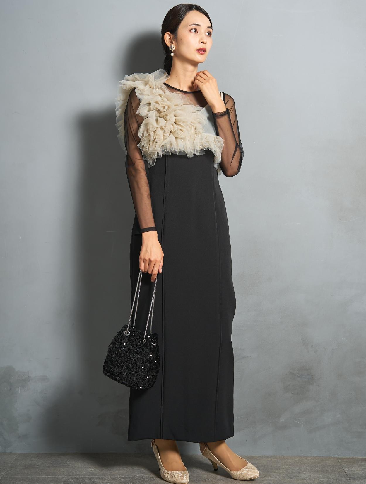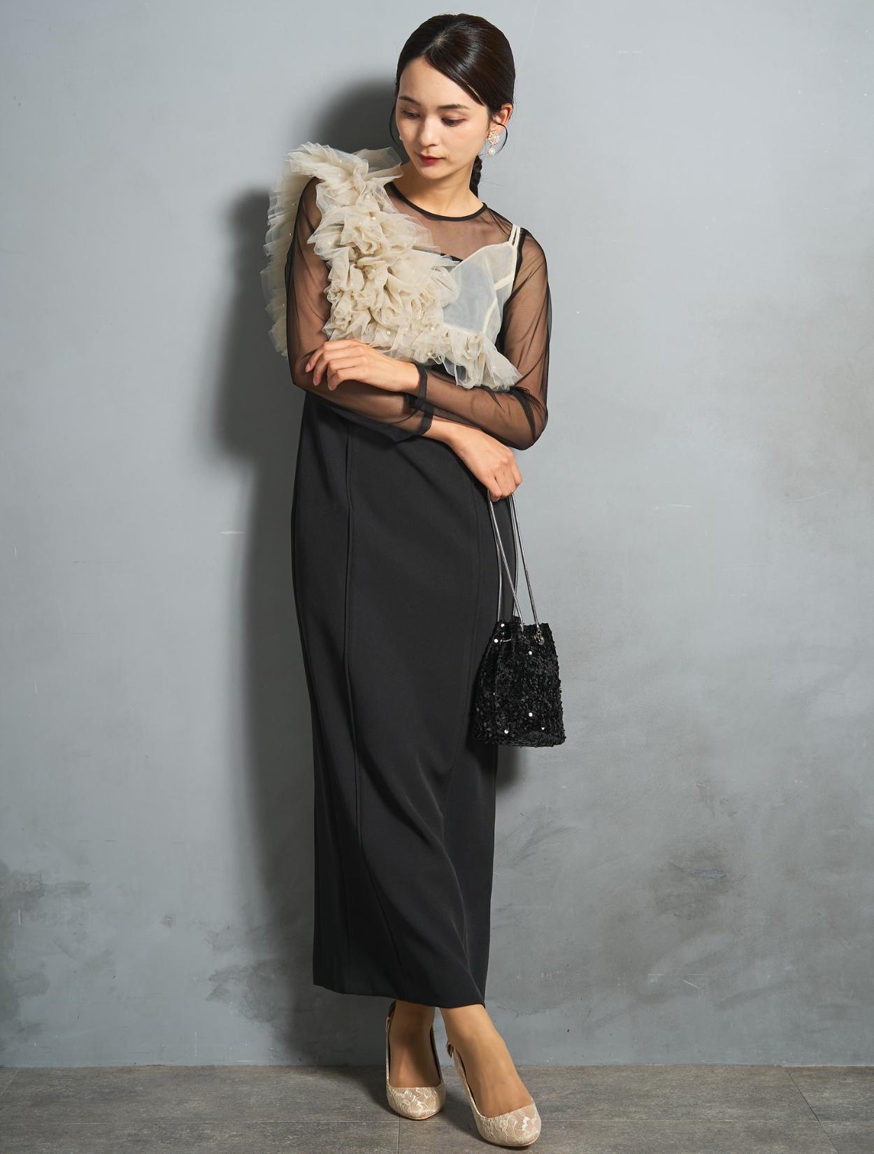 シアー素材をドッキングしたワンピースと、チュールビスチェがセットになったトレンド感のあるドレス。モードな印象もありつつ、マットなチュールを贅沢に使った「大人かわいい」がポイントです。