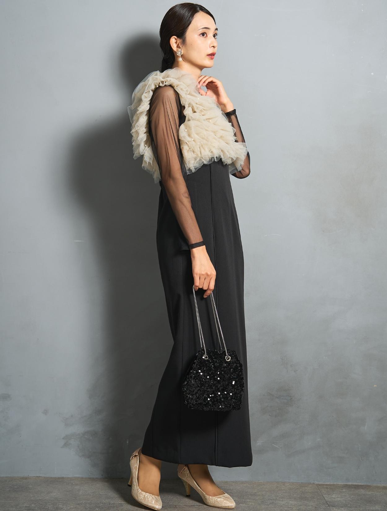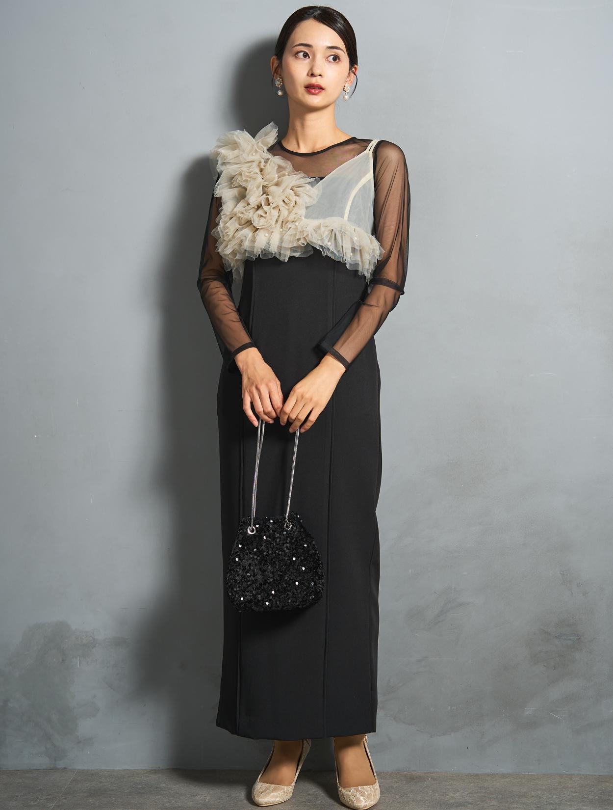 トップのチュールビスチェを引き立てるブラックコーデ。バッグは人気のスパンコール巾着バッグ。モードな印象のドレスを思いっきりトレンド感のある着こなしで楽しめます。スパンコールなのでブラックコーデでもさみしく見えないのもポイント。上半身にボリュームのあるデザインなので、アクセサリーは敢えてイヤリングをチョイス。ブラックのドレスに映えるフラワーモチーフの華やかさのある人気のイヤリングです。
