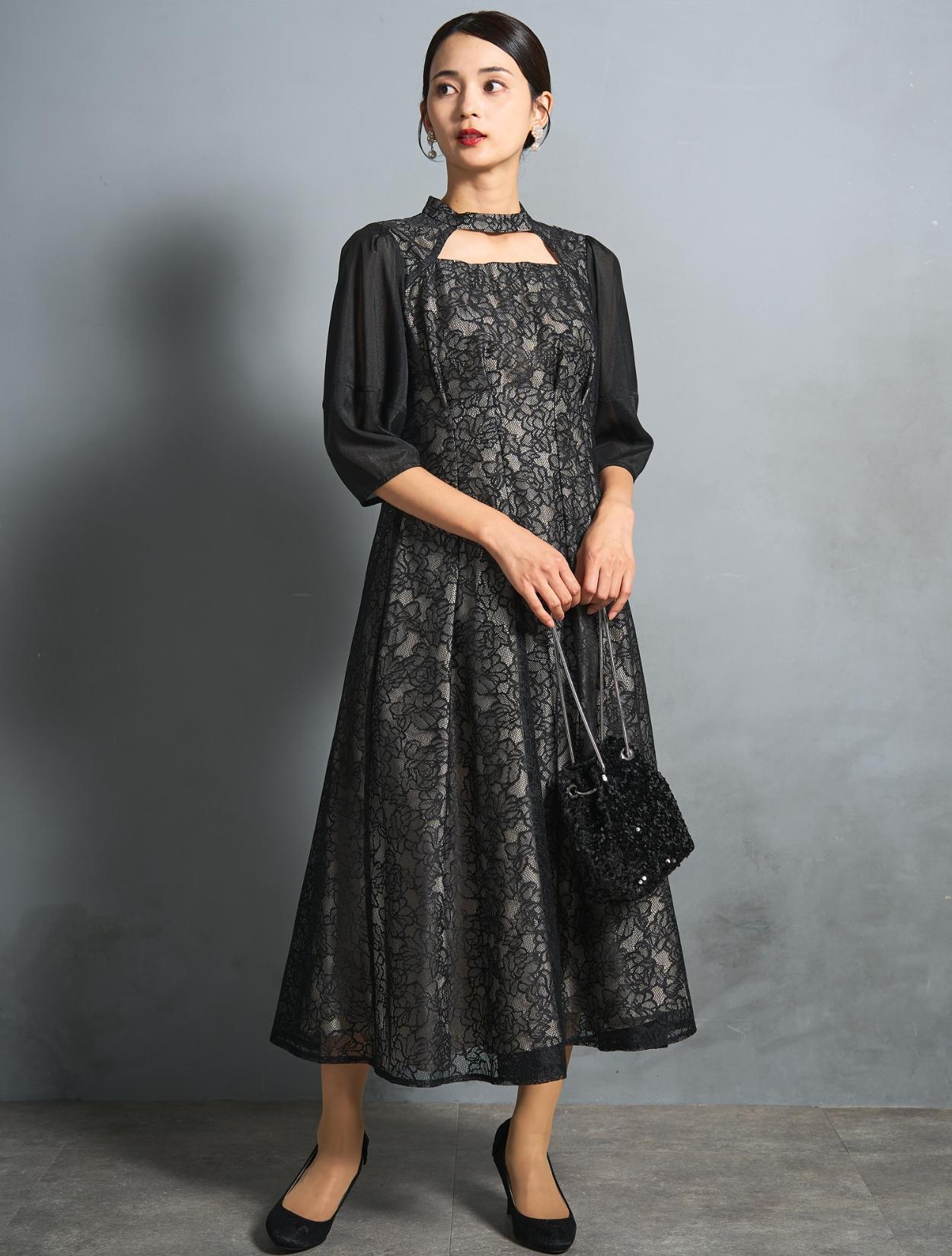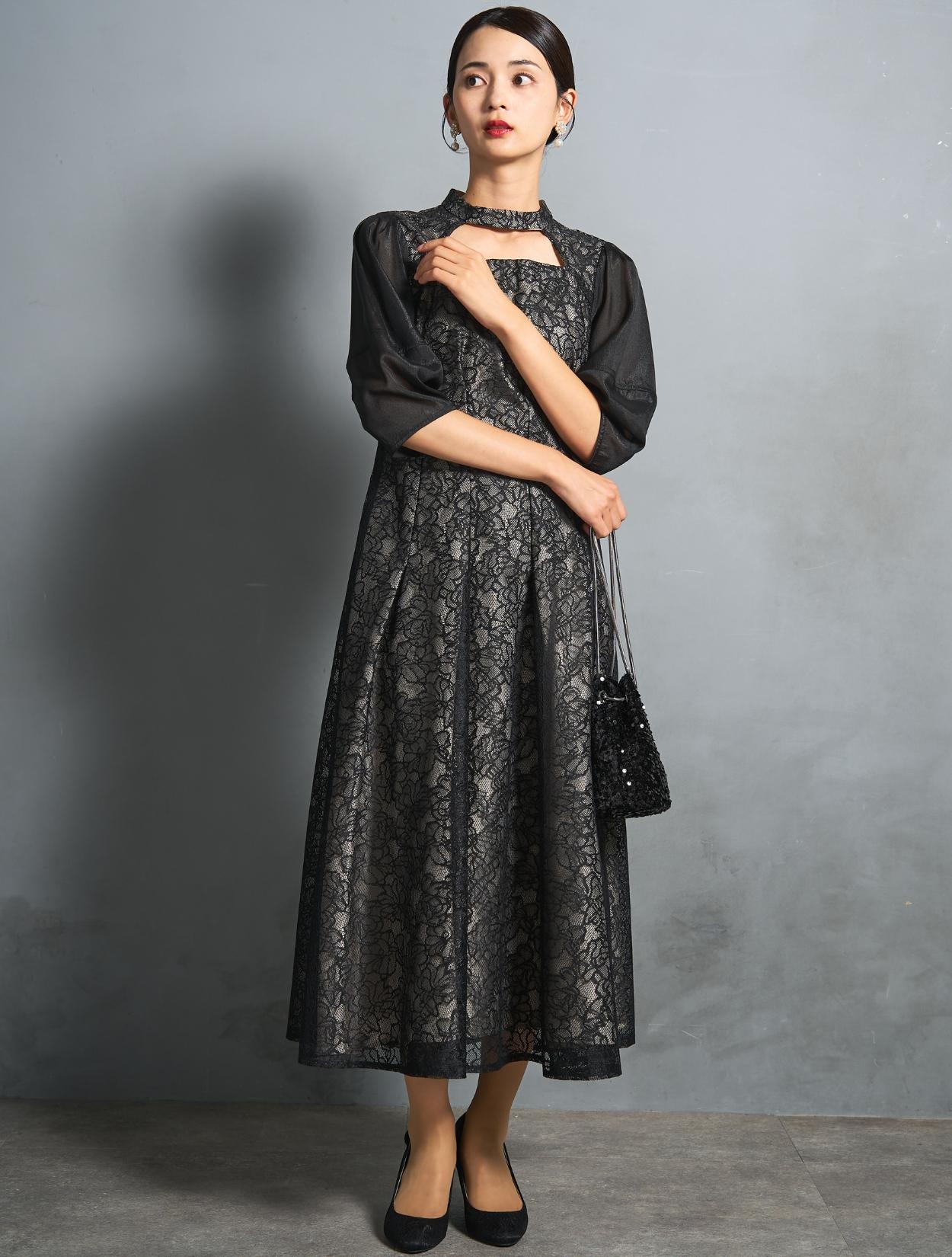 キュッと詰まった首元に、デコルテのカットアウトがポイントのドレス。クラシカルなフラワーレースにモードなテイストが入った、甘辛MIXな着こなしが楽しめます。デコルテの抜け感や、程よい肌感のあるオーガンジースリーブが、全体の印象を軽やかに見せてくれます。