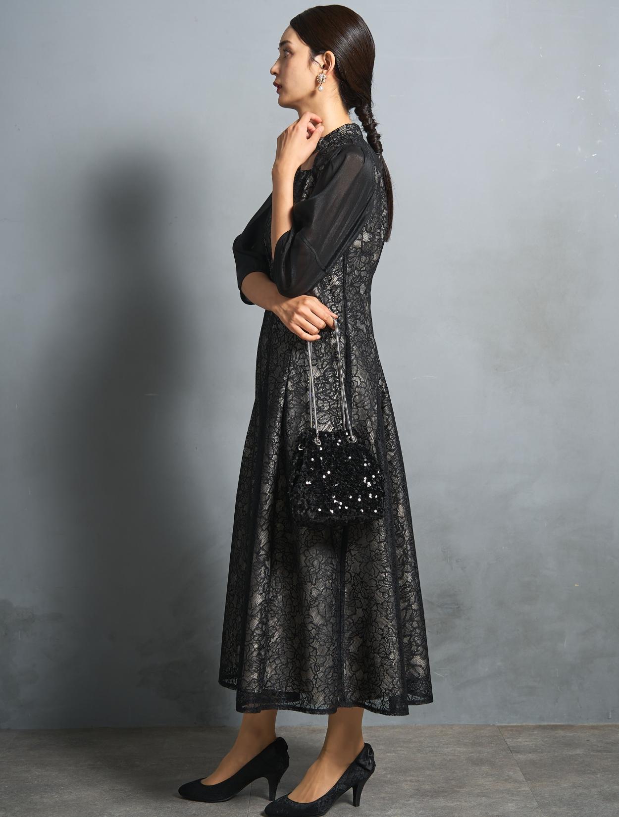 ブラックのレースに、レースから透けるインナーワンピースは上品なベージュゴールド。ブラックドレスでも柄が良く見えて華やかな印象に。シックな印象なブラックカラーですが、程よく華やかさもありパーティーシーンにぴったりです。