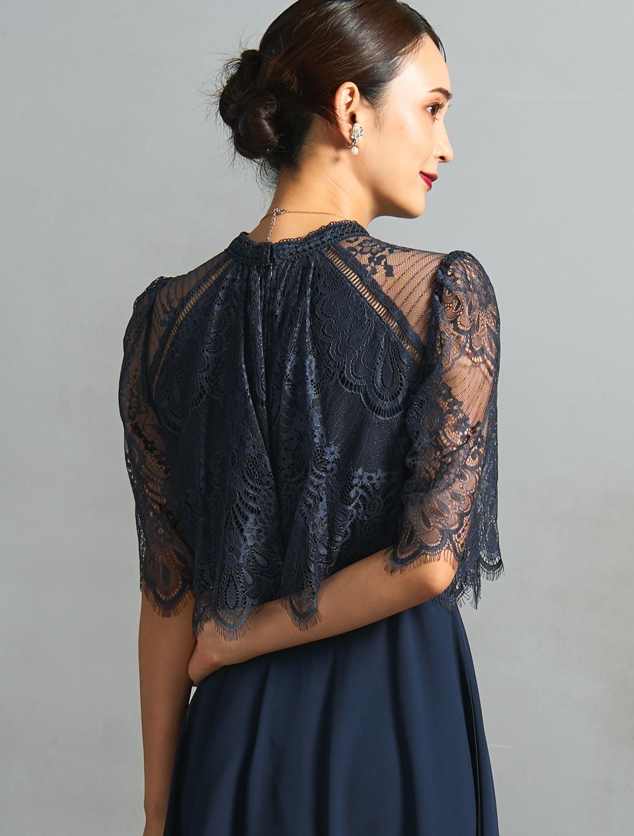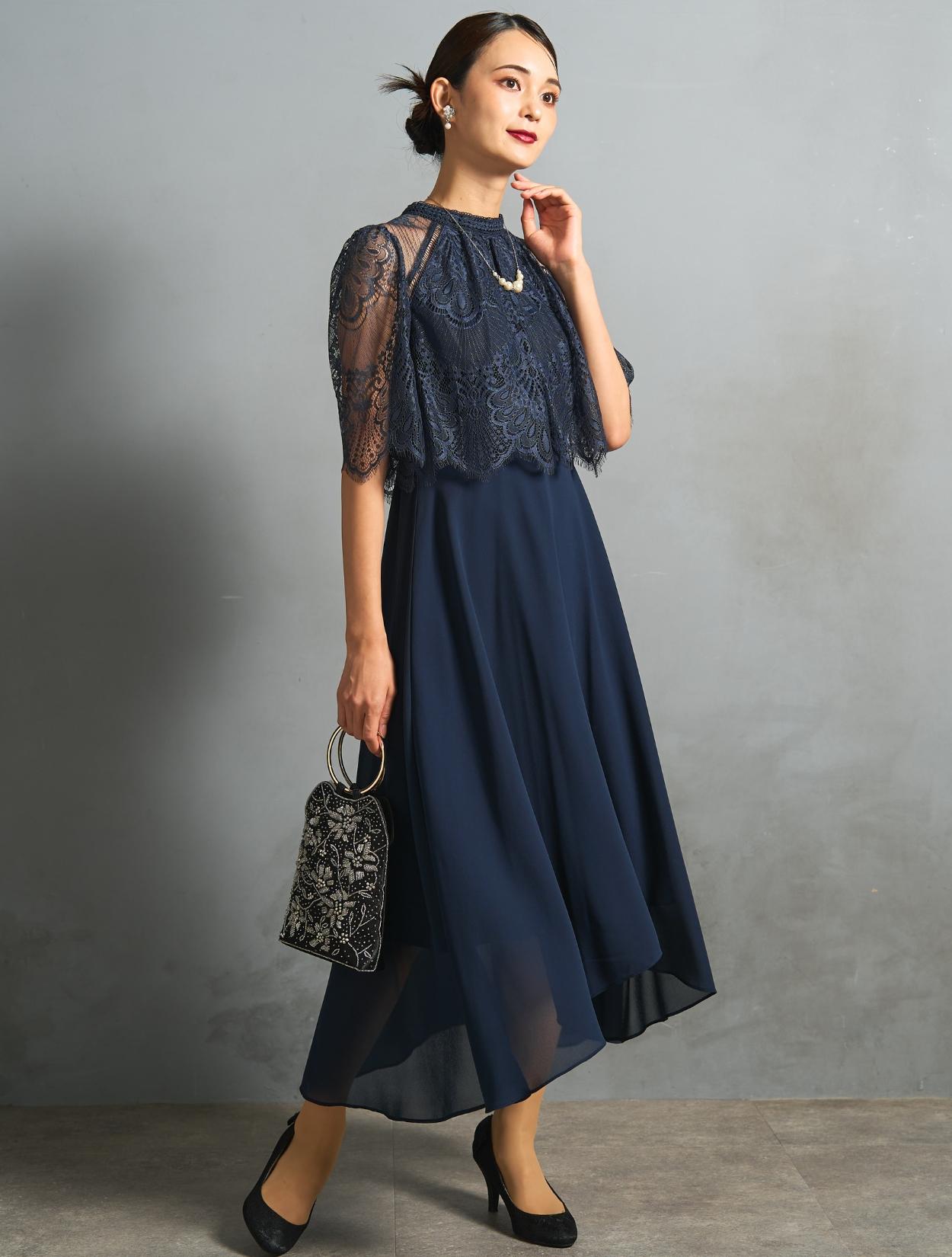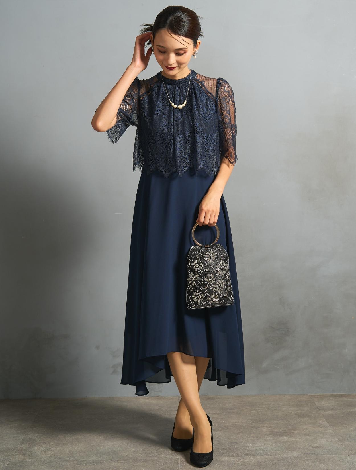 ヘム裾スカートが華やかなデザインのドレス。長すぎない丈感は、低身長の方にもおすすめです。ウエストの切り替えは、表からは見えないですが高めに設定されているので脚長効果抜群。低身長の方でもバランスよく着こなせます。フワッとしたオーバーブラウス風レースが、ウエストや腰周りをすっきり見せてくれる人気のデザイン。着痩せ効果がかなり期待できます。ウエストは背中部分のみゴム仕様で、着心地も◎。ミニスタンドネックが上品でクラシカルな印象。結婚式などのフォーマルな場面にぴったりです。肩から袖は透け感がありますが、デコルテ部分は透けないので幅広い年代が安心して着られます。