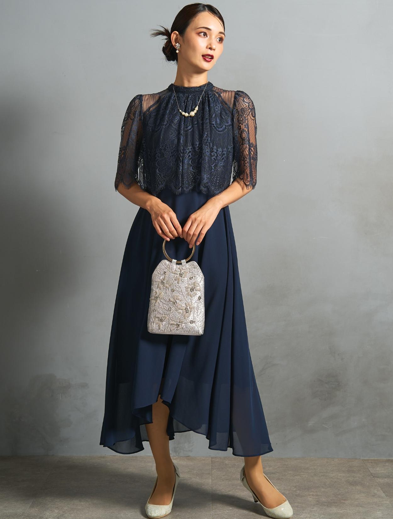 ヘム裾スカートが華やかなデザインのドレス。長すぎない丈感は、低身長の方にもおすすめです。ウエストの切り替えは、表からは見えないですが高めに設定されているので脚長効果抜群。低身長の方でもバランスよく着こなせます。フワッとしたオーバーブラウス風レースが、ウエストや腰周りをすっきり見せてくれる人気のデザイン。着痩せ効果がかなり期待できます。ウエストは背中部分のみゴム仕様で、着心地も◎。ミニスタンドネックが上品でクラシカルな印象。結婚式などのフォーマルな場面にぴったりです。肩から袖は透け感がありますが、デコルテ部分は透けないので幅広い年代が安心して着られます。