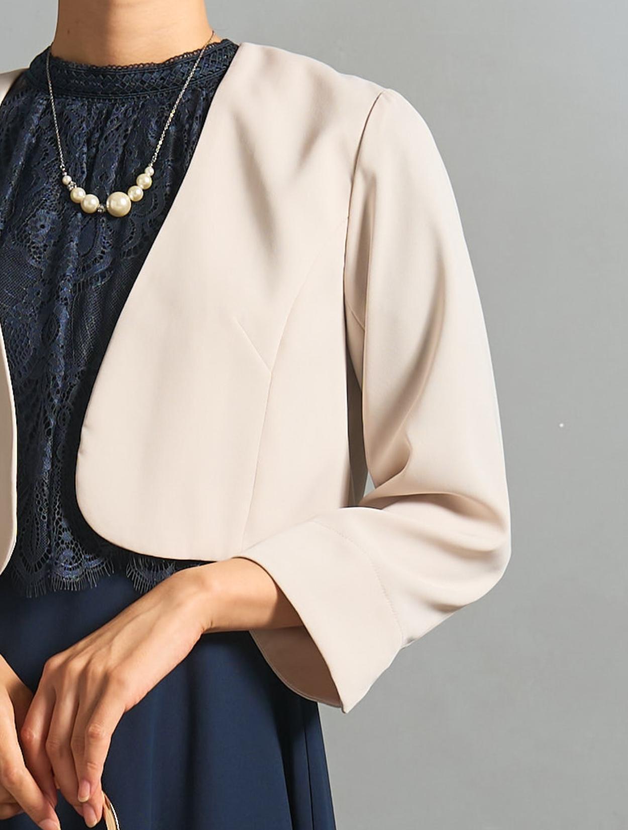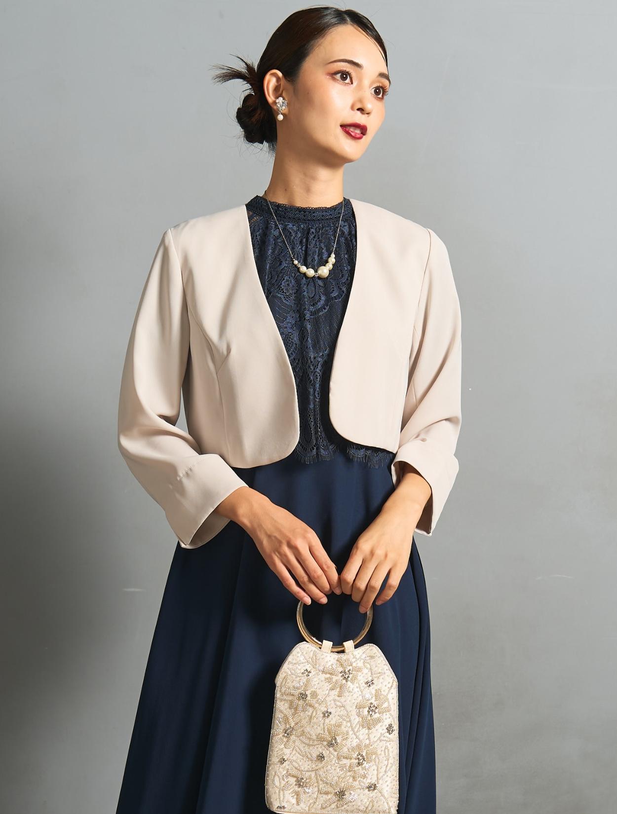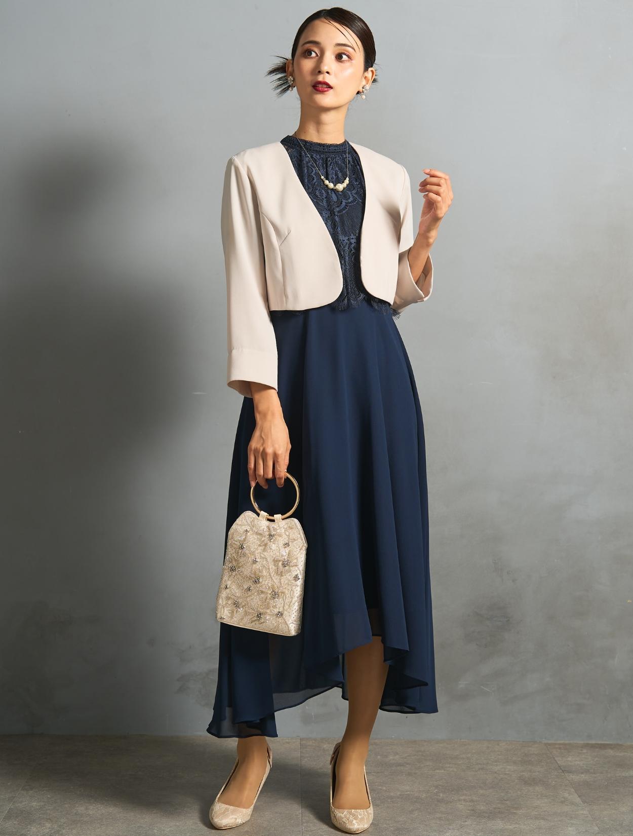 ネイビーのドレスに馴染みの良いグレージュのジャケットを合わせたきちんと感のあるコーディネート。ネイビードレスのジャケットコーデですが、明るい印象で着こなせるのがポイントです。バッグはシルバーグレーで色味を揃えてえいるので、フォーマルなシーンでも安心感があります。ネックレスは、敢えて長めのネックレスをセレクト。プチハイネックのデザインを邪魔せず、首回りをスッキリ見せてくれる長さです。シンプルなネックレスで、主張し過ぎず親族にもおすすめです。