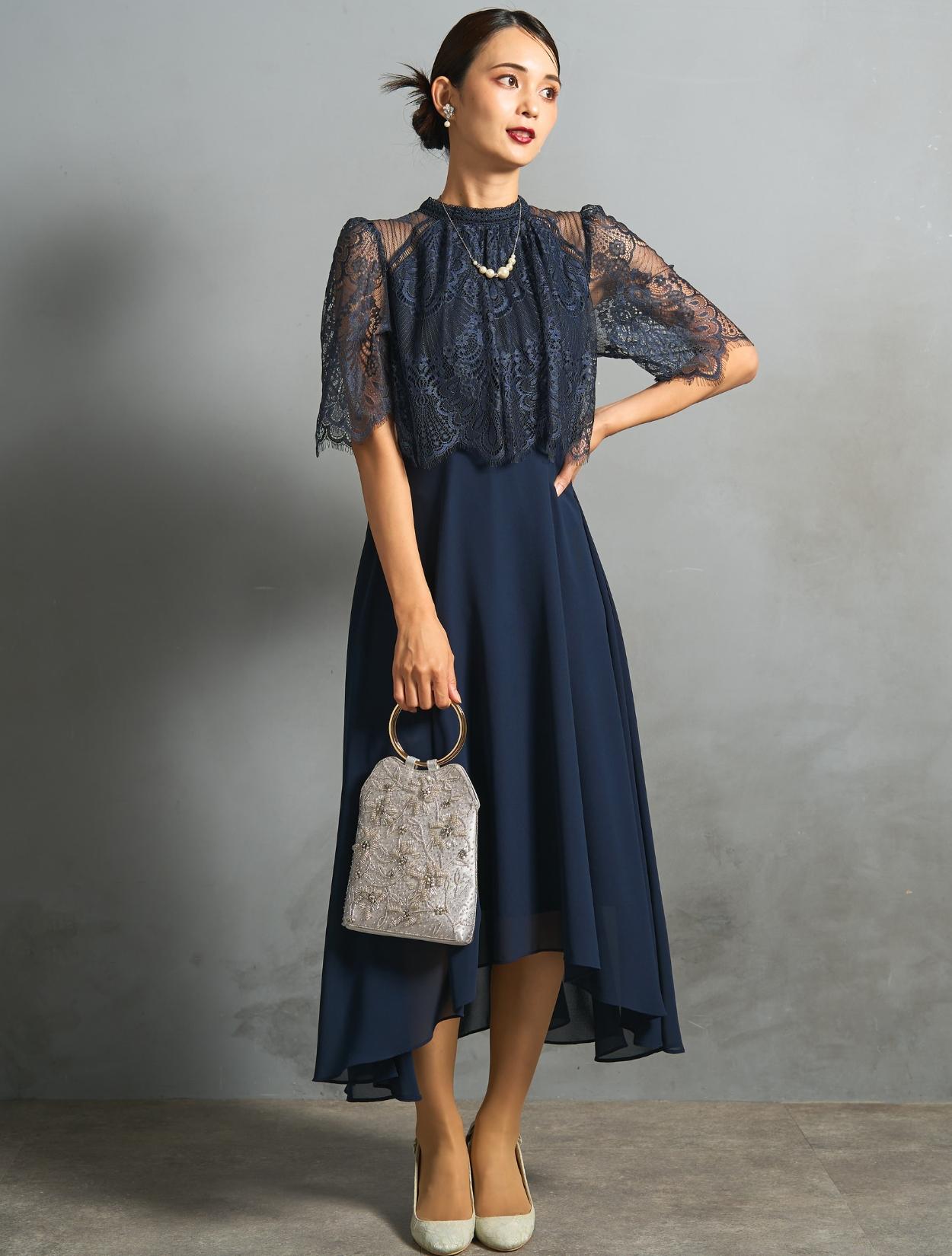ヘム裾スカートが華やかなデザインのドレス。長すぎない丈感は、低身長の方にもおすすめです。ウエストの切り替えは、表からは見えないですが高めに設定されているので脚長効果抜群。低身長の方でもバランスよく着こなせます。フワッとしたオーバーブラウス風レースが、ウエストや腰周りをすっきり見せてくれる人気のデザイン。着痩せ効果がかなり期待できます。ウエストは背中部分のみゴム仕様で、着心地も◎。ミニスタンドネックが上品でクラシカルな印象。結婚式などのフォーマルな場面にぴったりです。肩から袖は透け感がありますが、デコルテ部分は透けないので幅広い年代が安心して着られます。