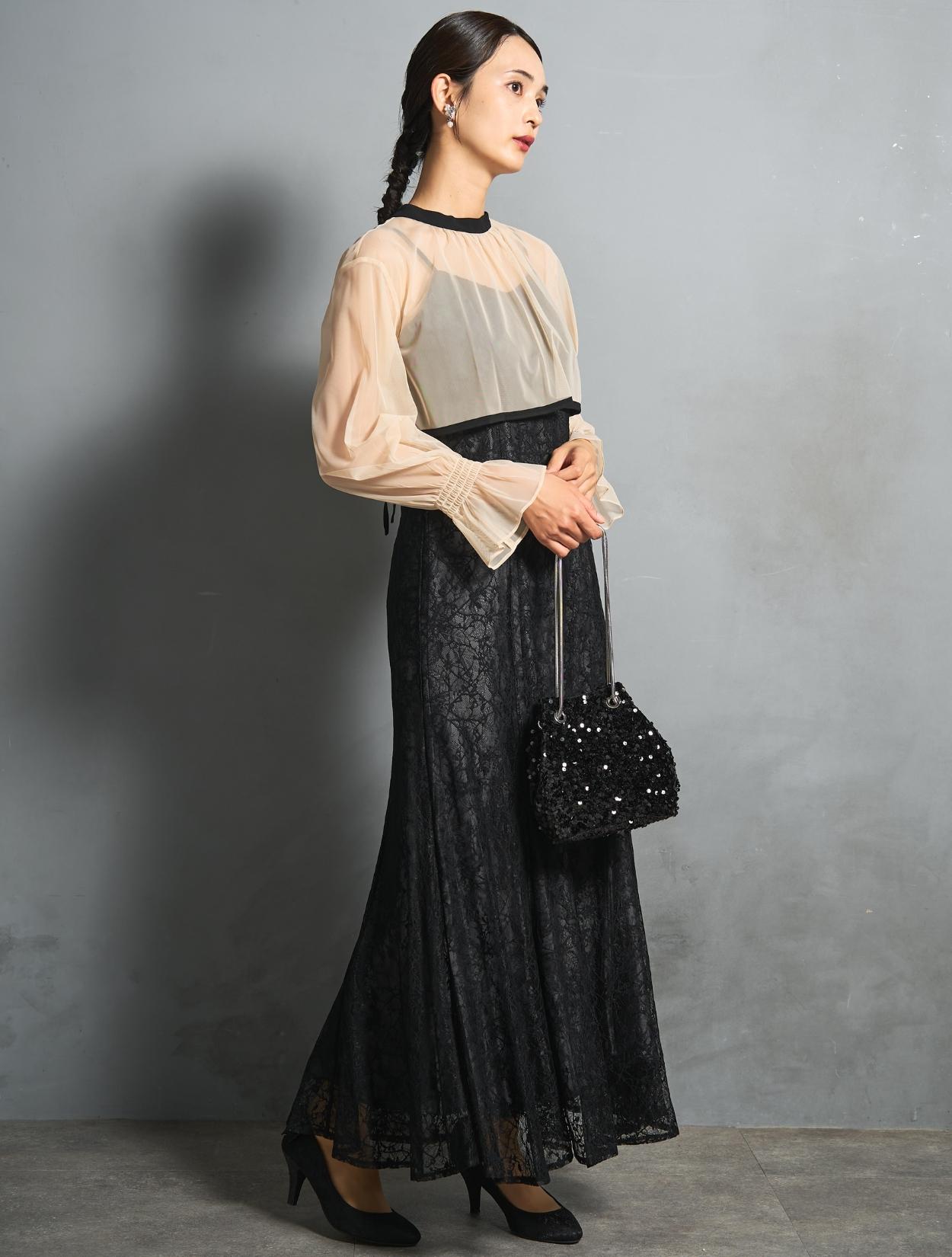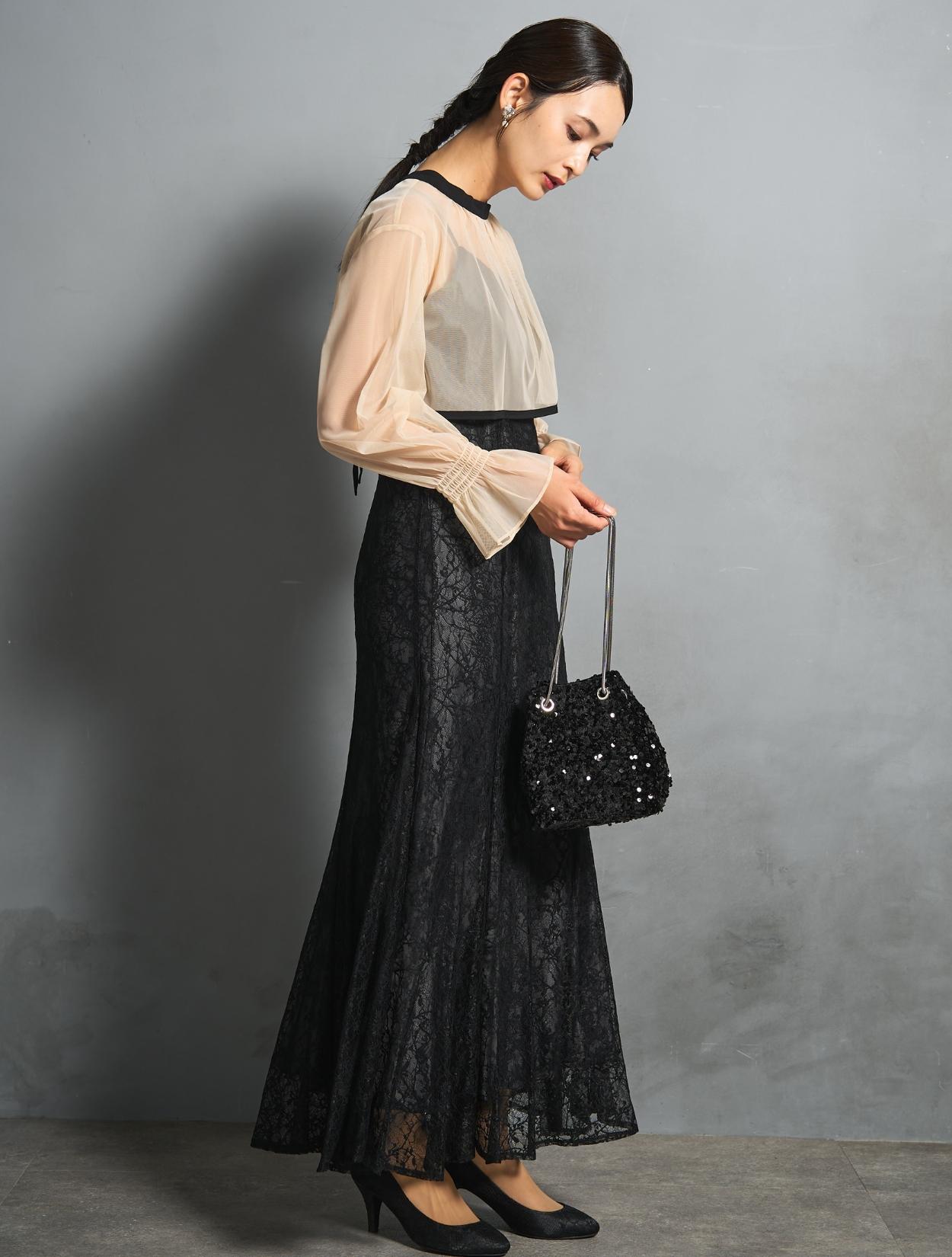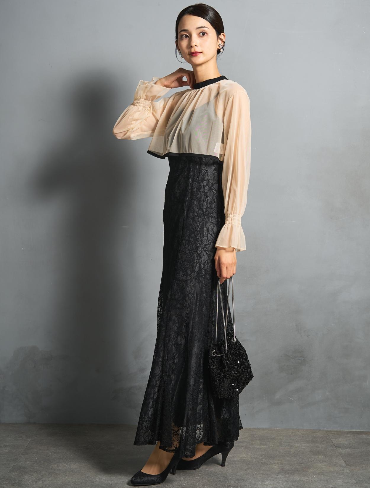 ブラックの総レースにアイボリーのシアーブラウス。レースには程よく光沢があり、ブラックでも華やかに見えるのがポイント。癖のない爽やかなアイボリーは、お顔映りを明るくトーンアップしてくれます。