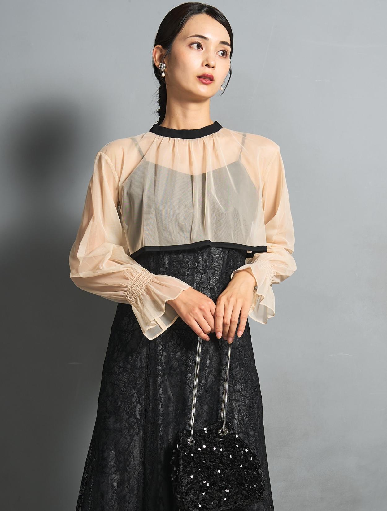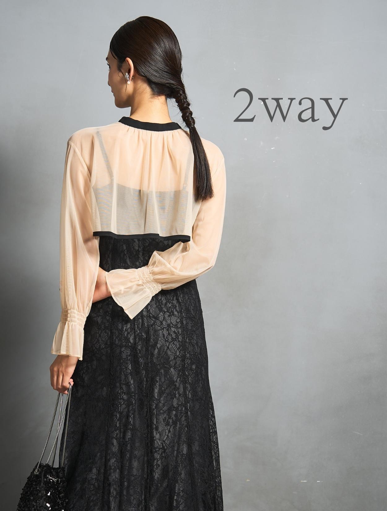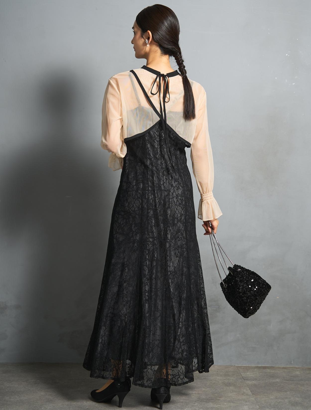 トレンドのレイヤードスタイルのドレス。シアーブラウスとレースのキャミワンピがセットになっています。シアーブラウスは、前後2wayで着られるデザイン。クロスしたデザインをフロントにすると、ひと癖あるおしゃれな着こなしに。シンプルなデザインを前にすると、ワンピースのレースを引き立たせるスッキリとした着こなしに。長めのリボン紐は、程よく可愛さを抑えた大人ナチュラルな印象に。しっかりとした長袖ですが、シアー素材なのでどんな季節でも着こなしやすいのもポイントです。