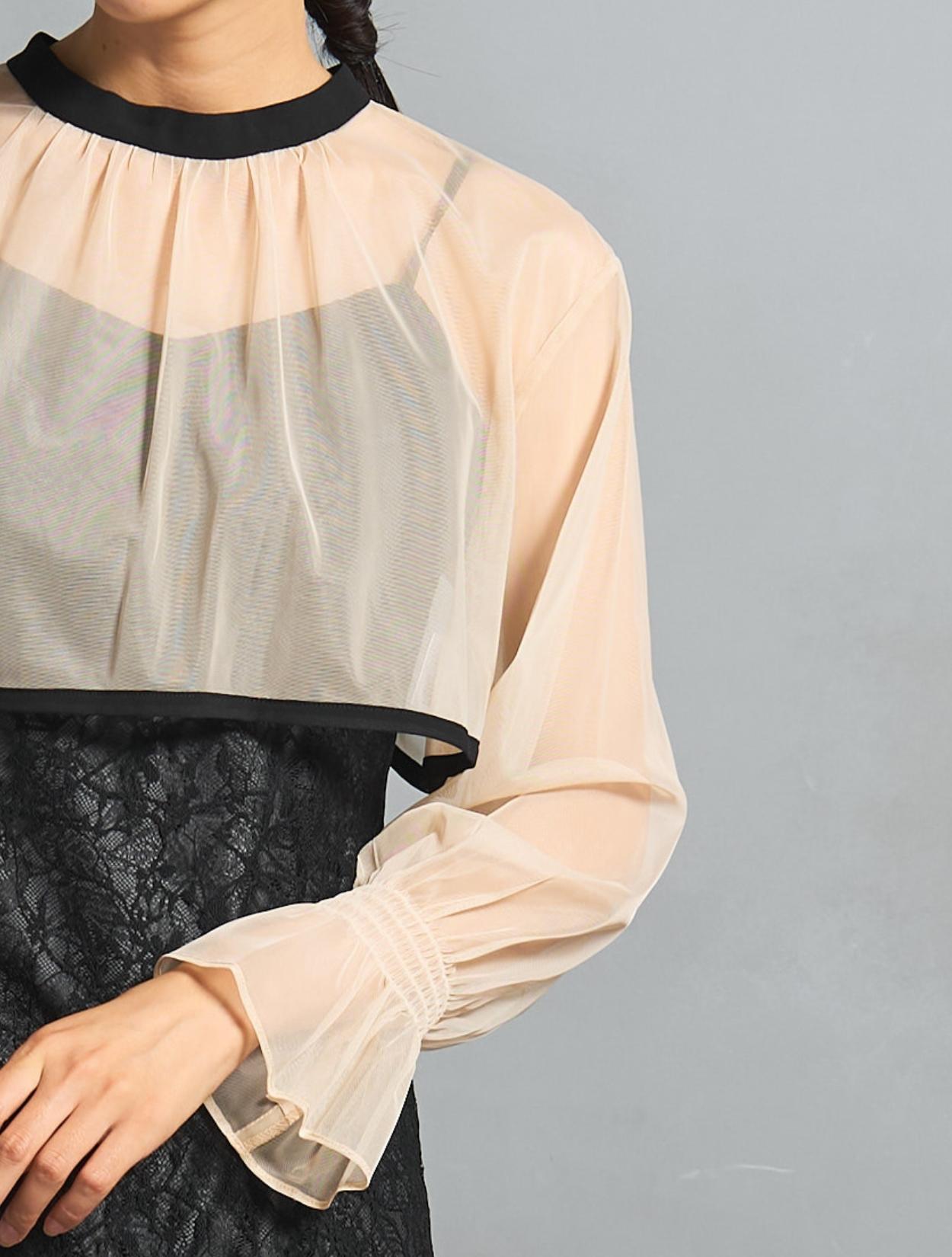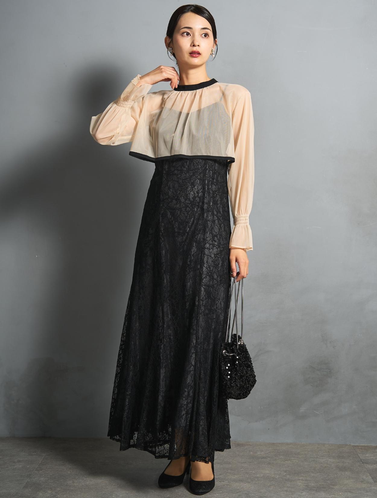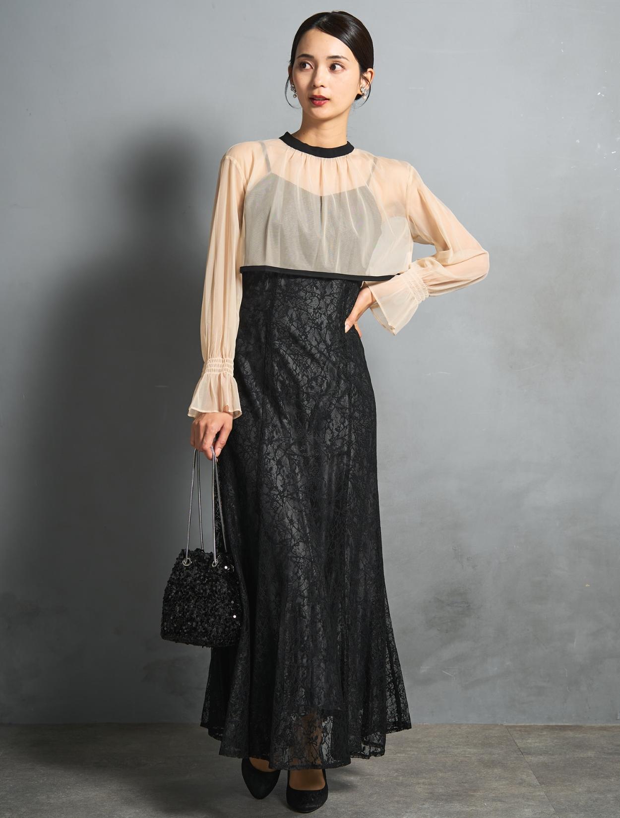 トレンドのレイヤードスタイルのドレス。シアーブラウスとレースのキャミワンピがセットになっています。シアーブラウスは、前後2wayで着られるデザイン。クロスしたデザインをフロントにすると、ひと癖あるおしゃれな着こなしに。シンプルなデザインを前にすると、ワンピースのレースを引き立たせるスッキリとした着こなしに。長めのリボン紐は、程よく可愛さを抑えた大人ナチュラルな印象に。しっかりとした長袖ですが、シアー素材なのでどんな季節でも着こなしやすいのもポイントです。