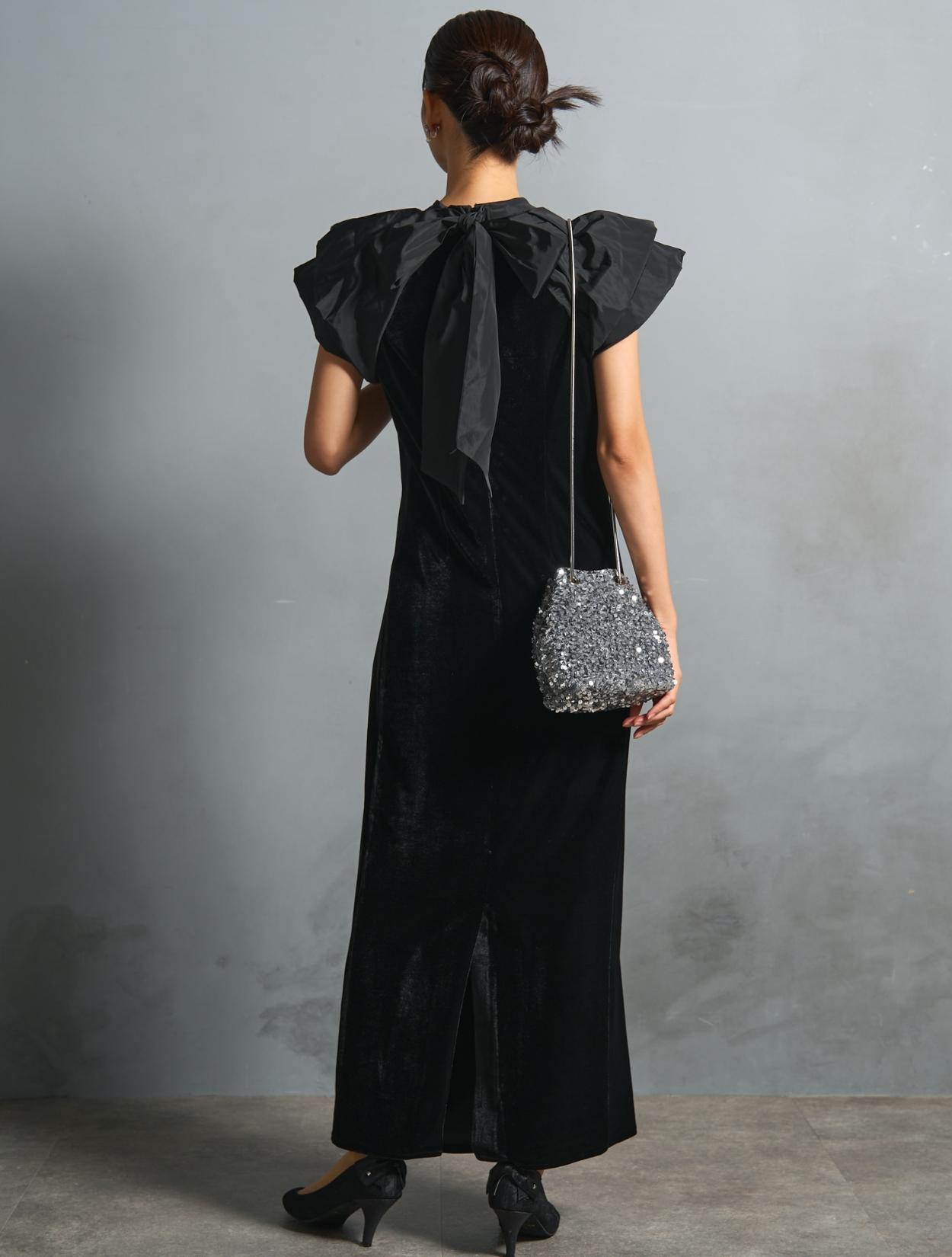モード感たっぷりのおしゃれで大人っぽいロングドレスにシルバーのスパンコールバッグが映えるコーディネート。シックながらも華やかなパーティー感があります。首元にデザインがあるドレスなので、アクセサリーはネックレスよりイヤリングがおすすめ。キラリと光るパールビジューのイヤリングをセレクトしました。パールのアクセサリーは上品でフォーマル感もあります。