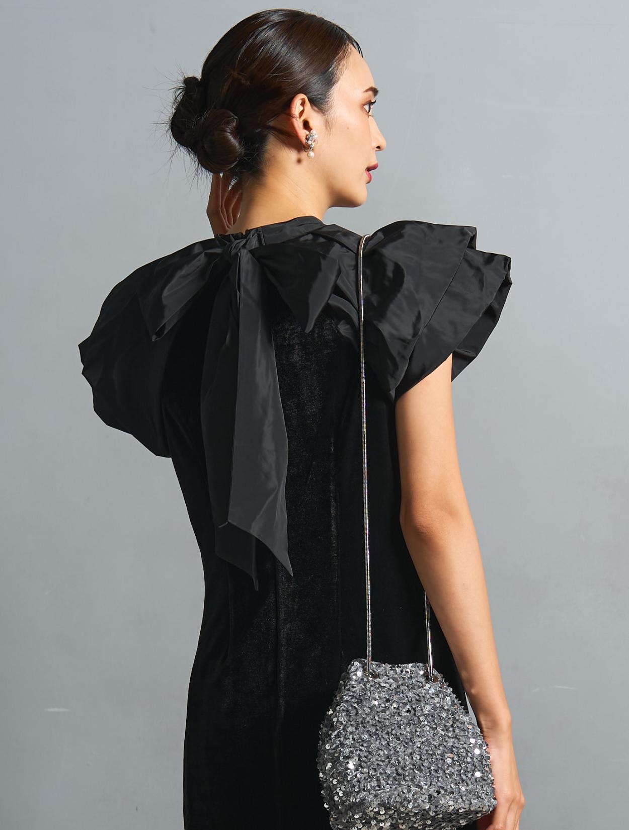 後ろ姿も抜かりのないビッグリボンのデザイン。袖と同じタフタ生地で、シンプルなIラインドレスのでも後ろ姿に存在感があります。