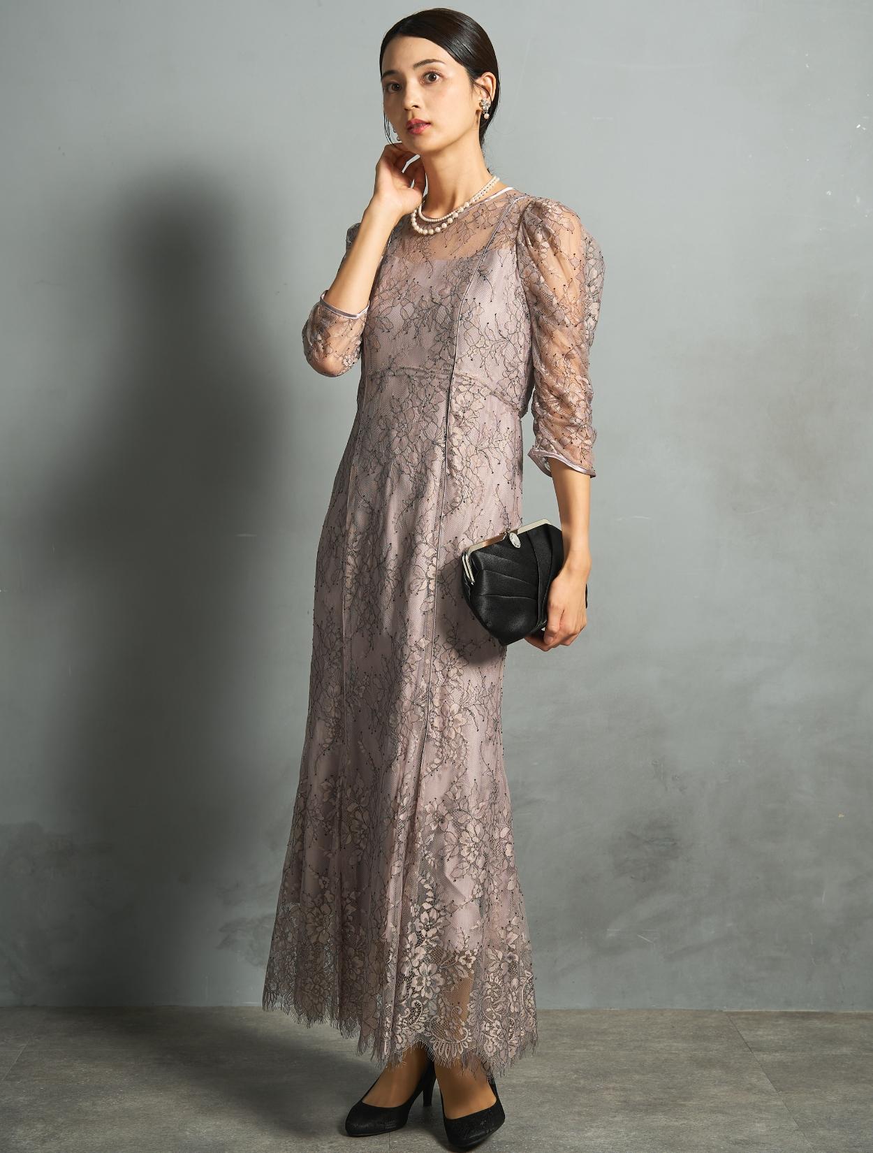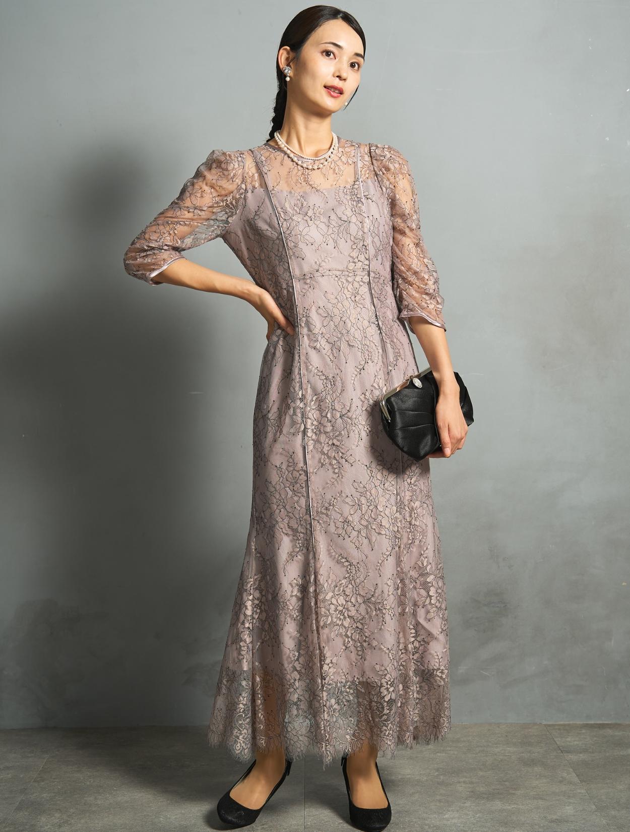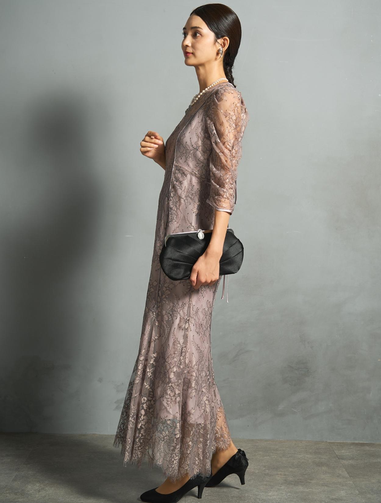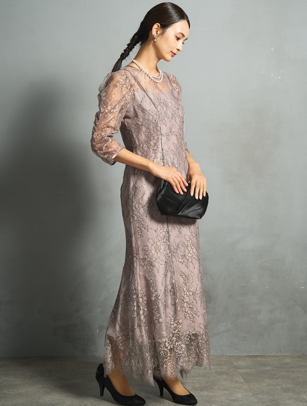 エレガントで大人っぽいマーメイドラインがポイントのロングドレス。すっきりスタイルを良く見せてくれるドレスです。フラワー柄の総レースなので華やかさもあり。スカラップ調にレースがカットされた裾は、動くと目を引くキレイめなデザイン。透け感がありロング丈でも軽やかに着こなせます。
