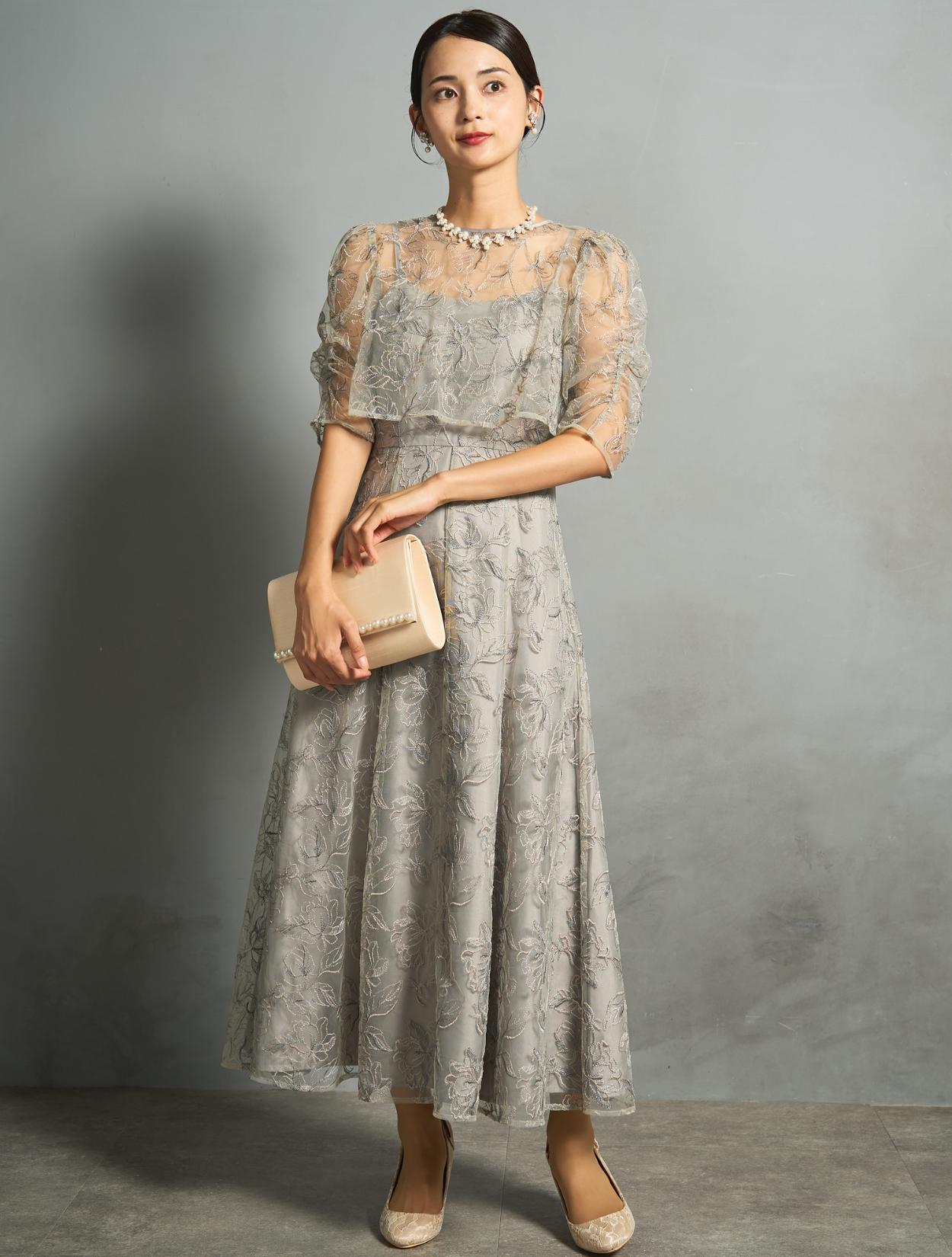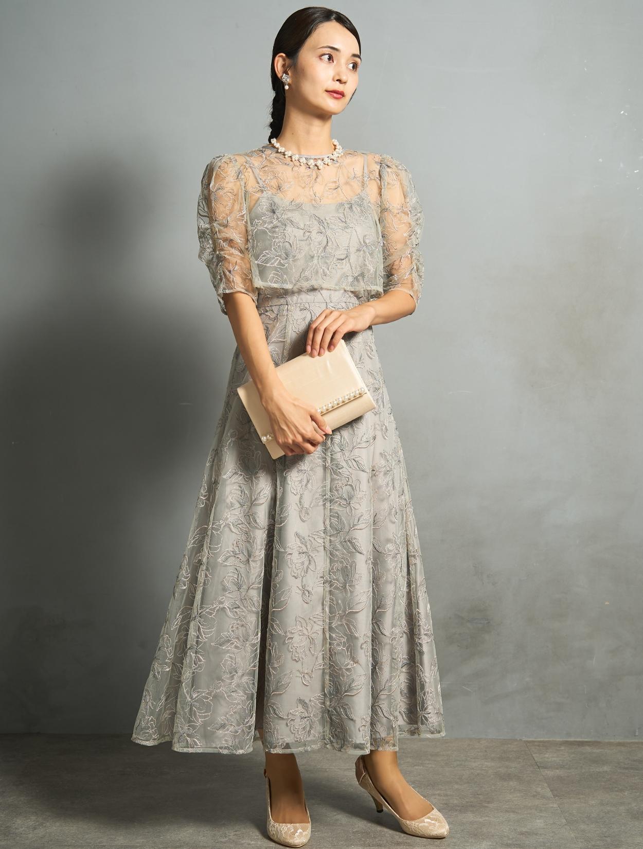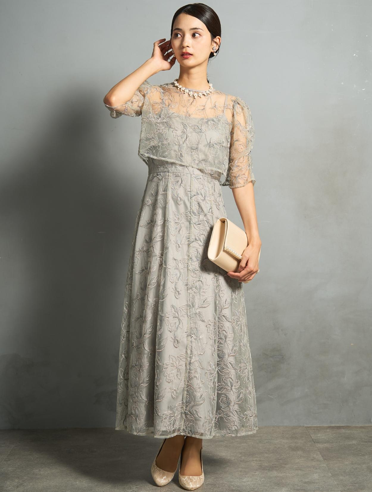 トレンド感のある総レースのレイヤードドレスは、20代30代におすすめです。チャコールグレーは華やかなドレスをお探しの40代にも◎。