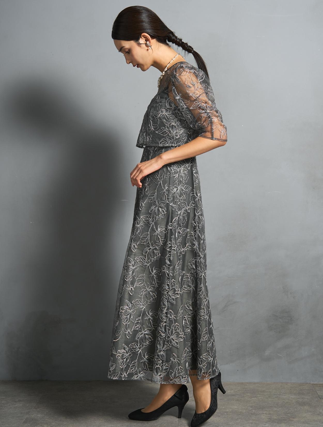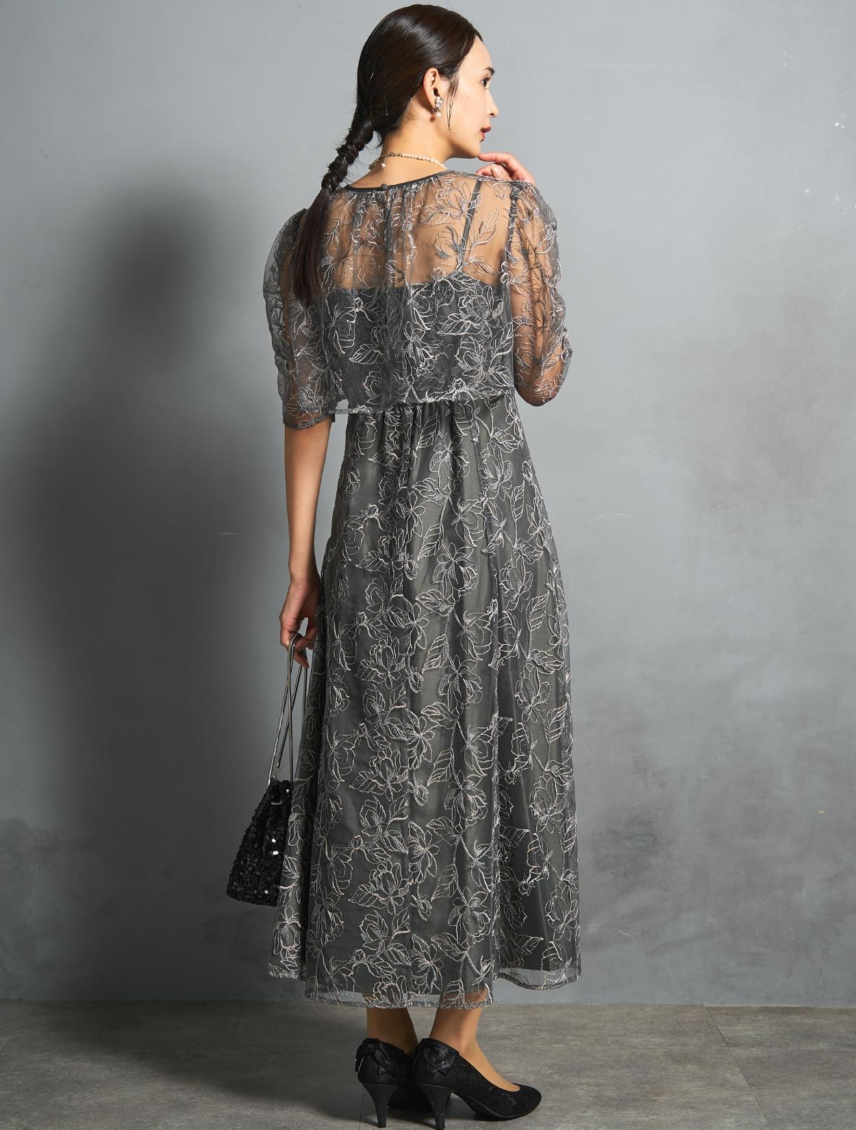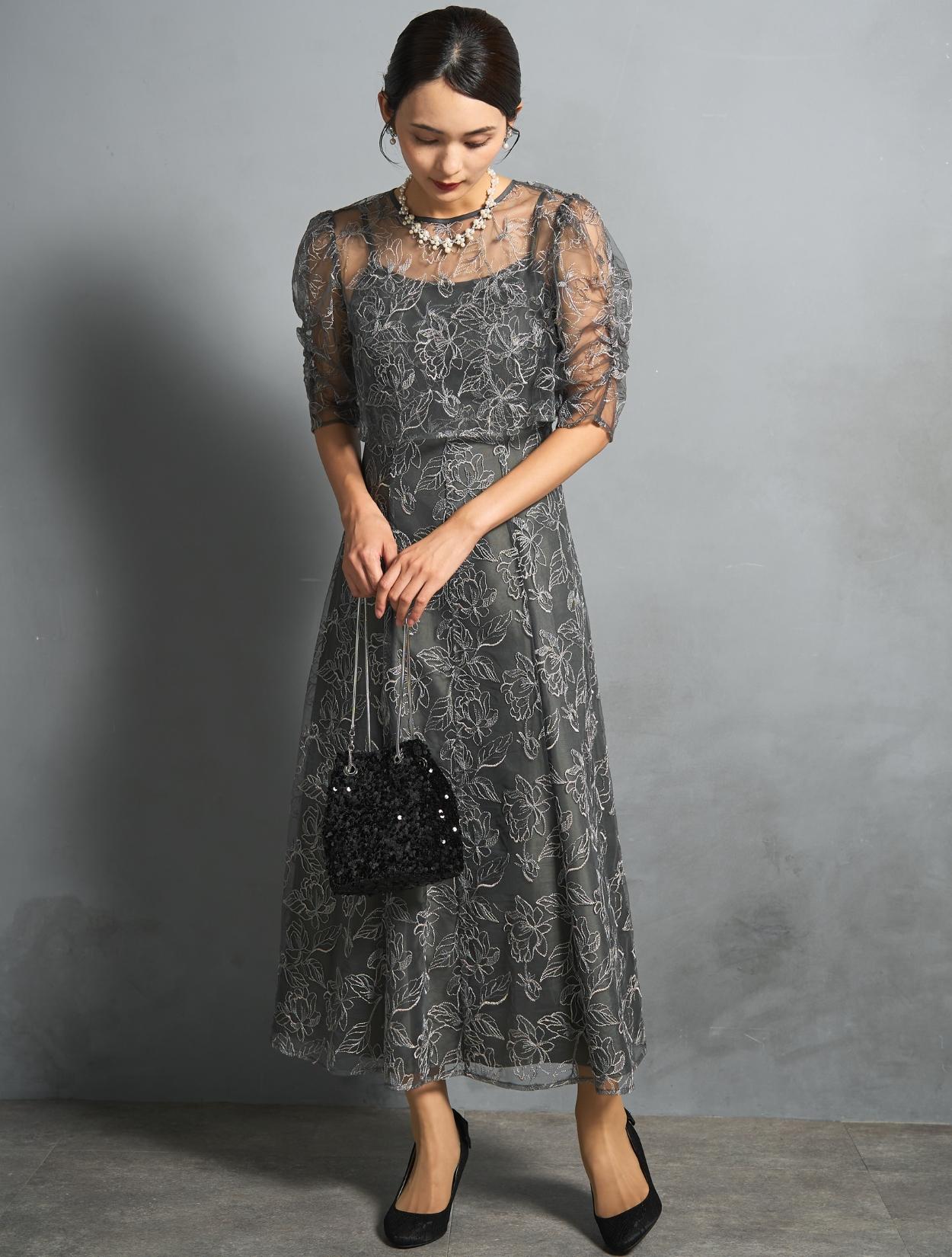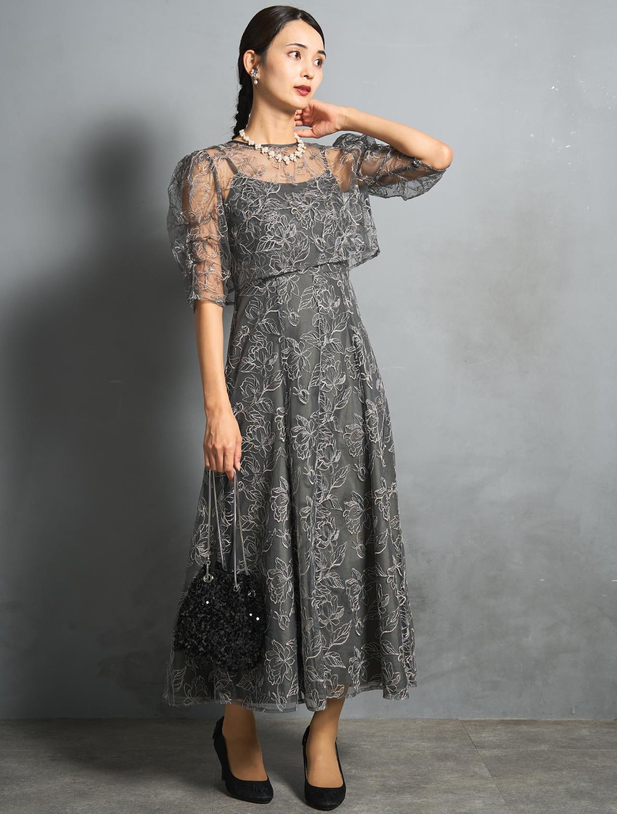トレンド感のある総レースのレイヤードドレスは、20代30代におすすめです。チャコールグレーは華やかなドレスをお探しの40代にも◎。