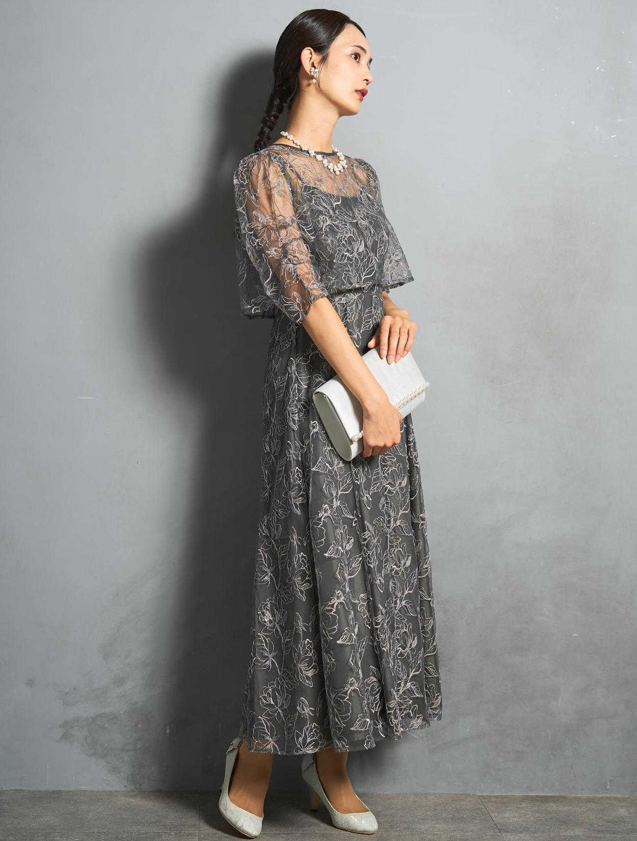 トレンド感のある総レースのレイヤードドレスは、20代30代におすすめです。チャコールグレーは華やかなドレスをお探しの40代にも◎。