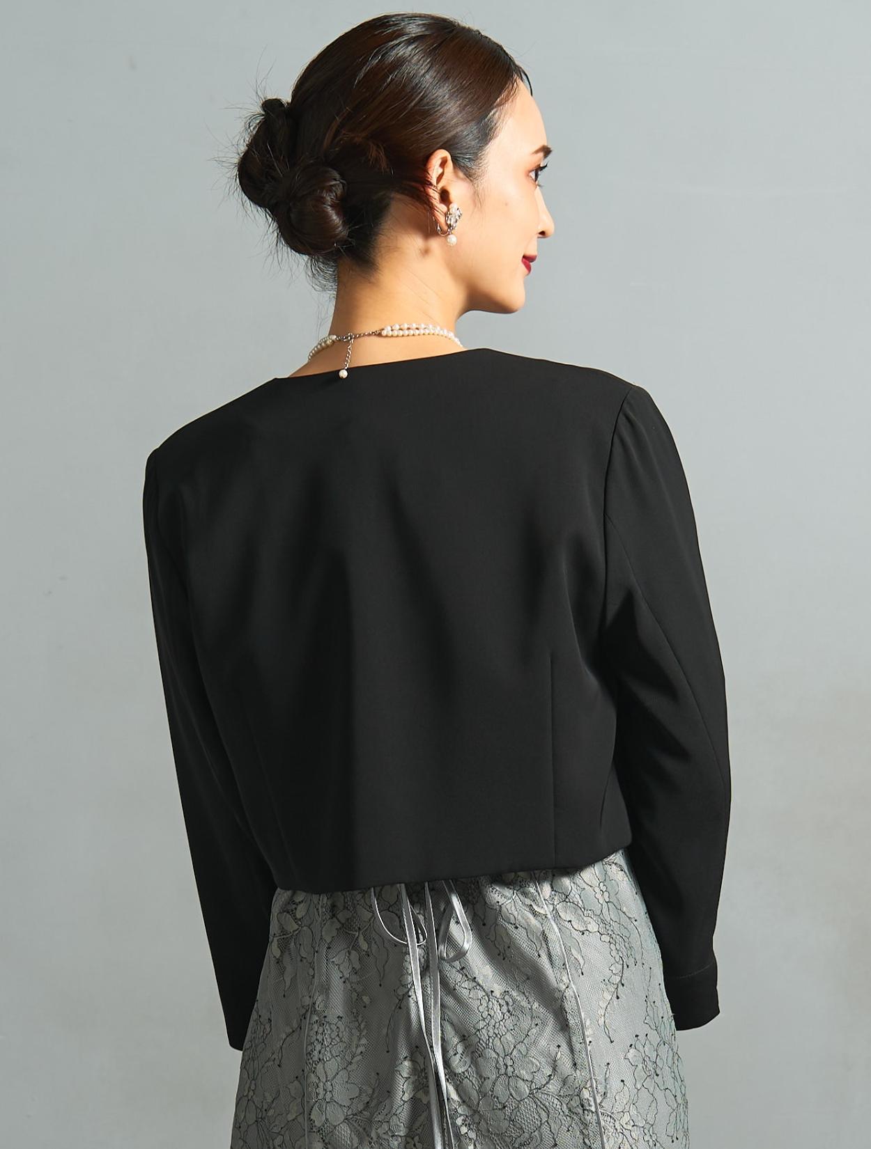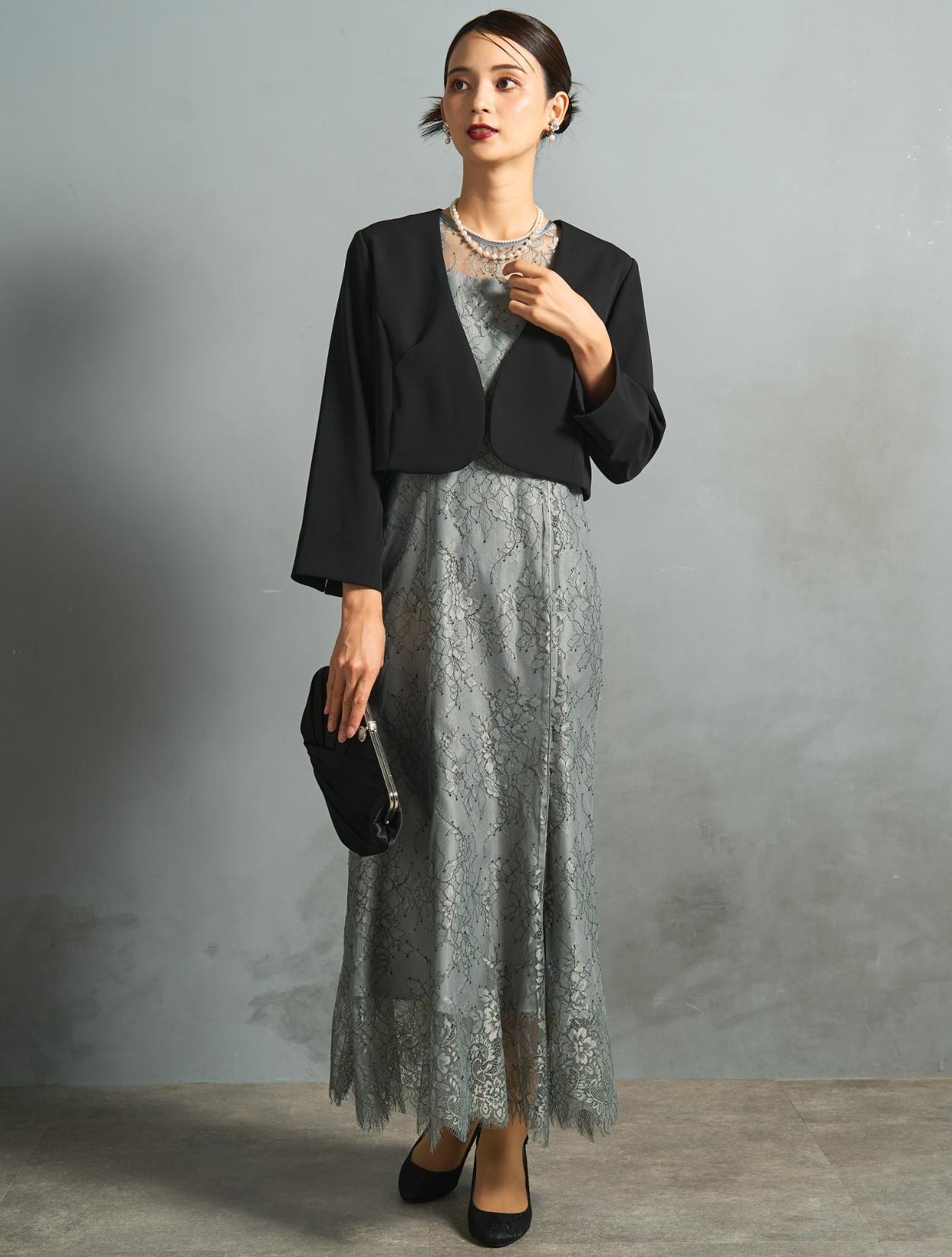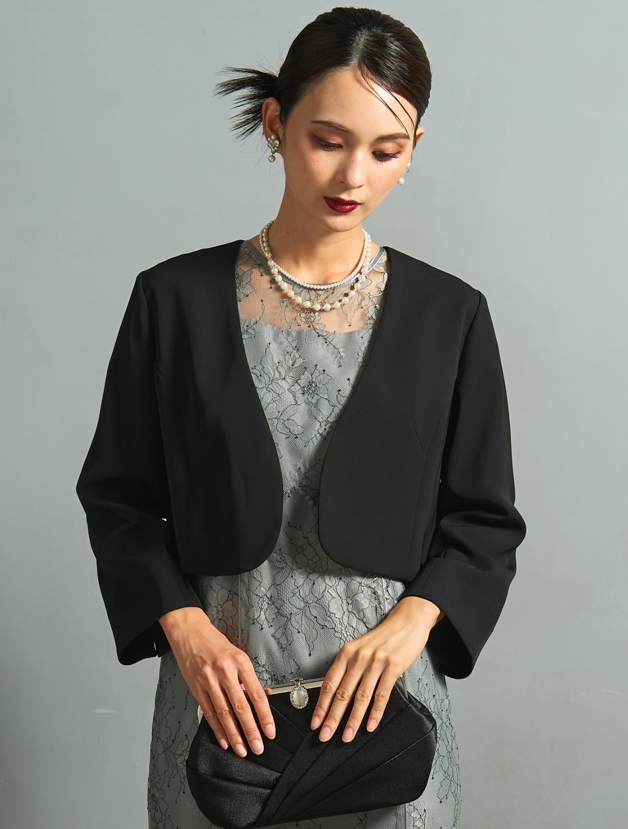 ノーカラーのすっきりしたジャケットを合わせた落ち着きのあるコーディネート。ブラックのジャケットは、カラードレスを控えめにコーディネートしてくれます。親族にもおすすめ。上品なサテン生地のシンプルなパーティーバッグは、程よい光沢感をプラス。様々なシーンや立場で活躍します。アクセサリーは上品な2連のネックレス。2種類の異なる粒のパールは、控えめながらもお顔周りを明るくしてくれます。