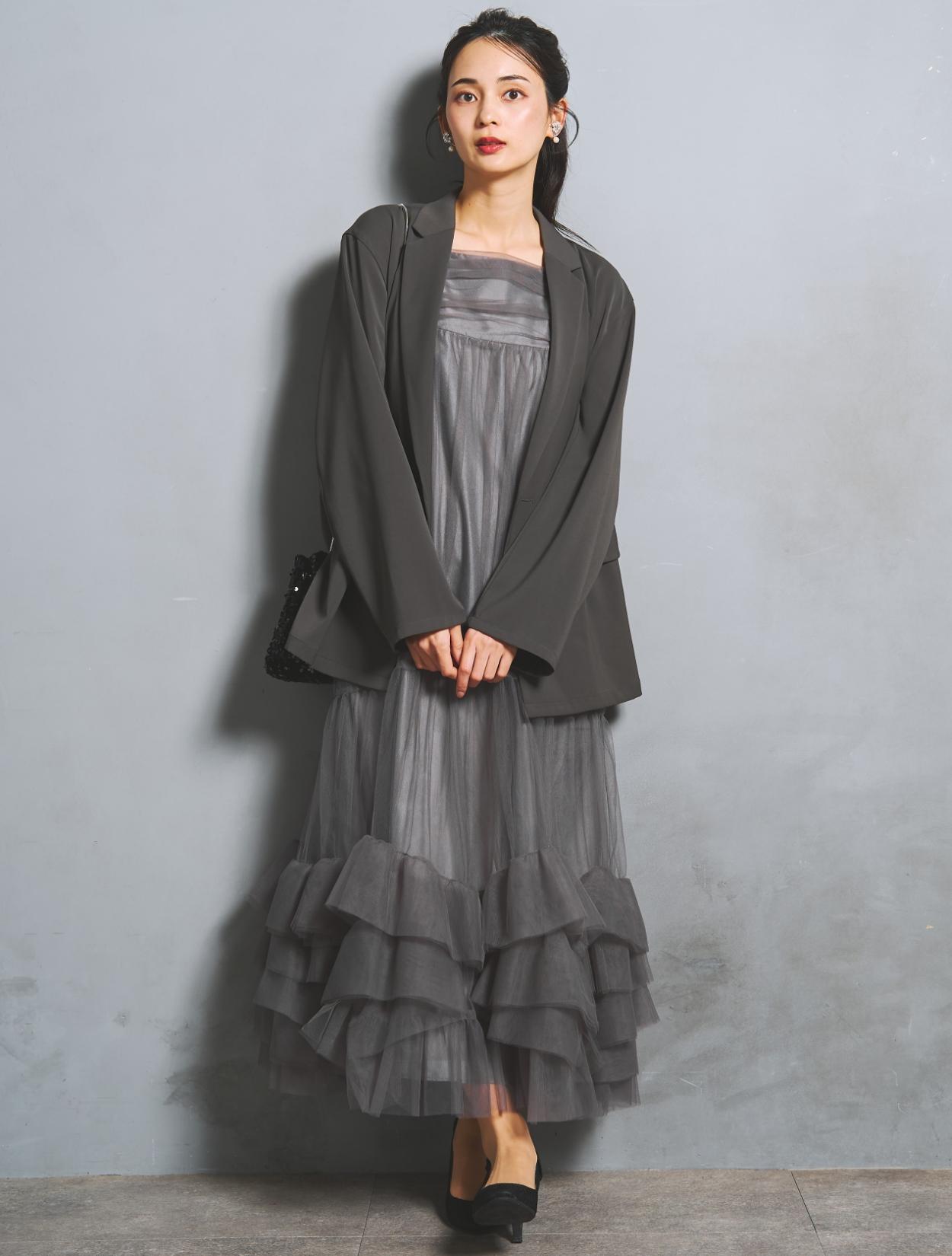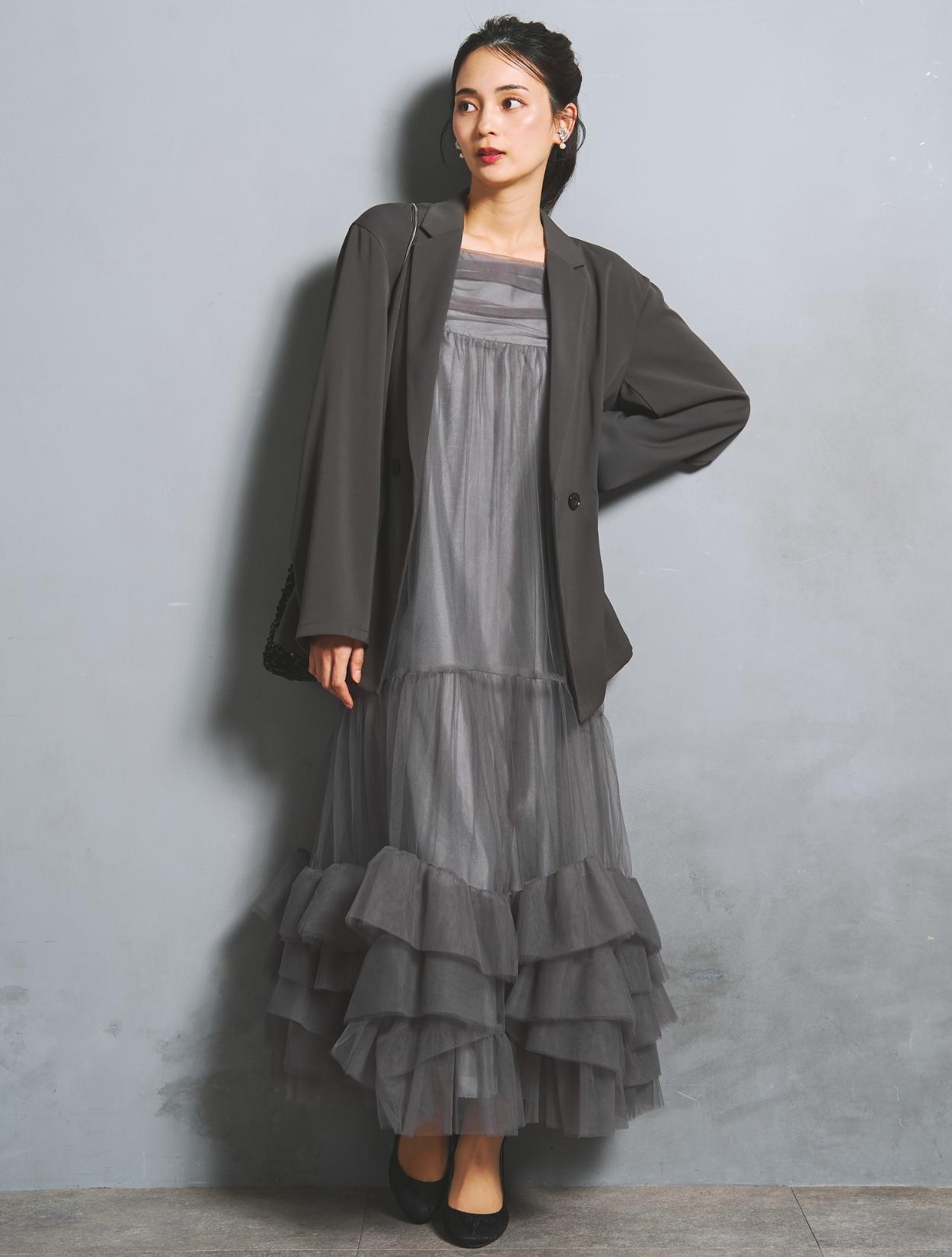 裾に大胆なフリルをあしらったチュールワンピースと、W仕立てジャケットがセットになった、こなれ感たっぷりのトレンドドレス。絶妙な甘辛バランスがおしゃれさんに人気です。