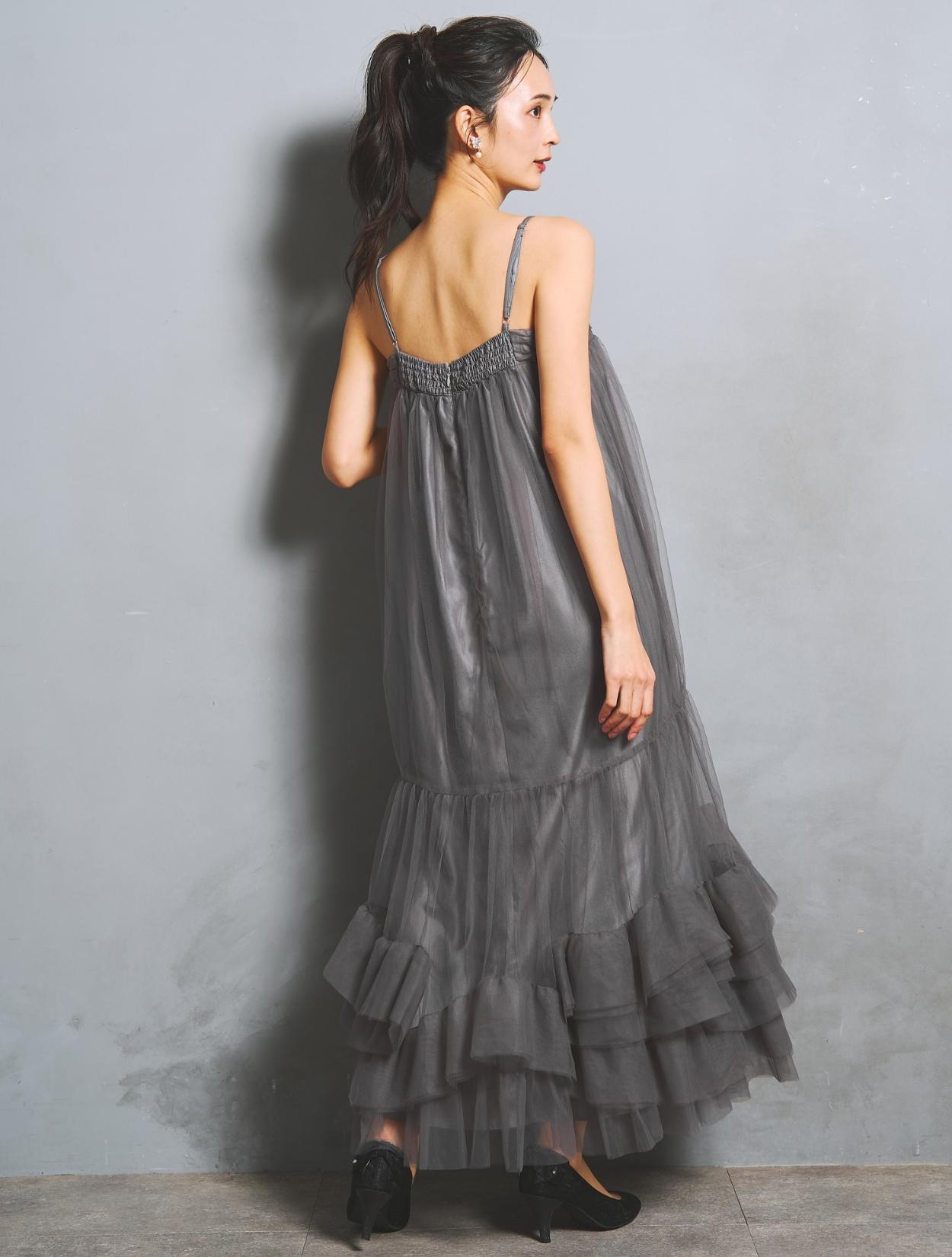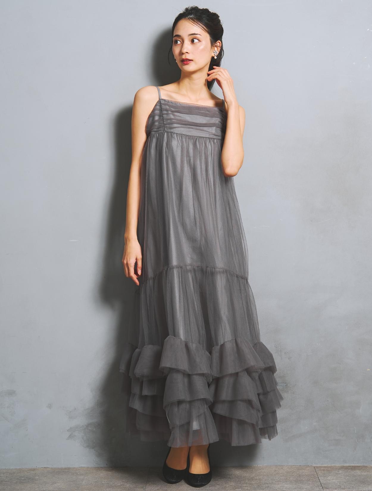 チャコールグレーのチュールからダークグレーの裏地が透ける、絶妙なグレーカラー。スカートのボリュームチュールフリルは、グレーを重ねて色味の濃さに変化があるのも◎。グレーは、ブラックより柔らかい雰囲気で着られるので人気のカラーです。