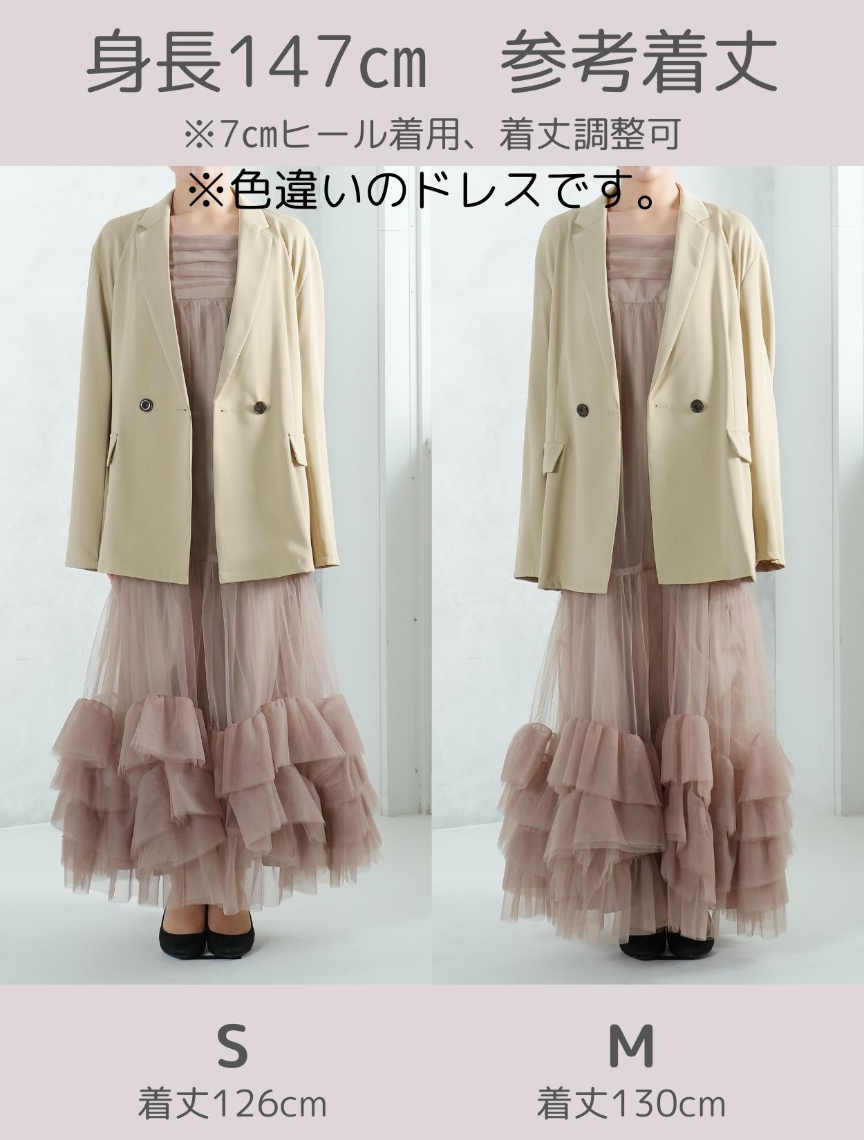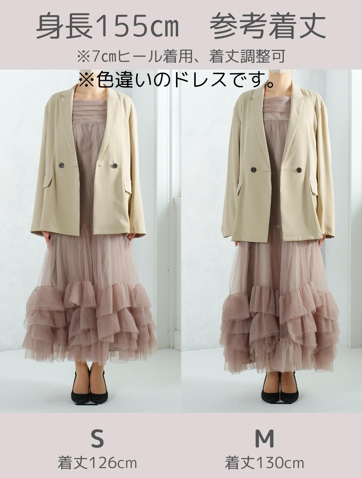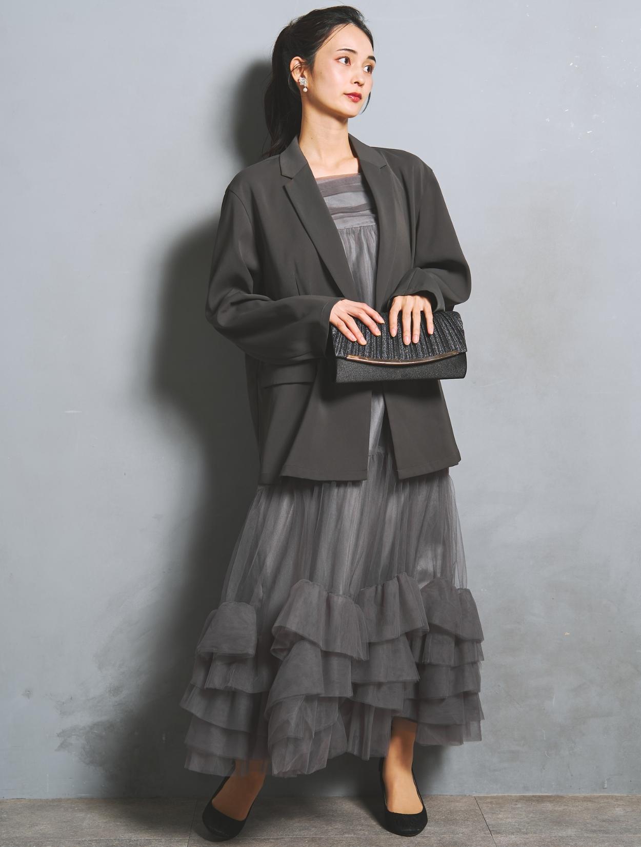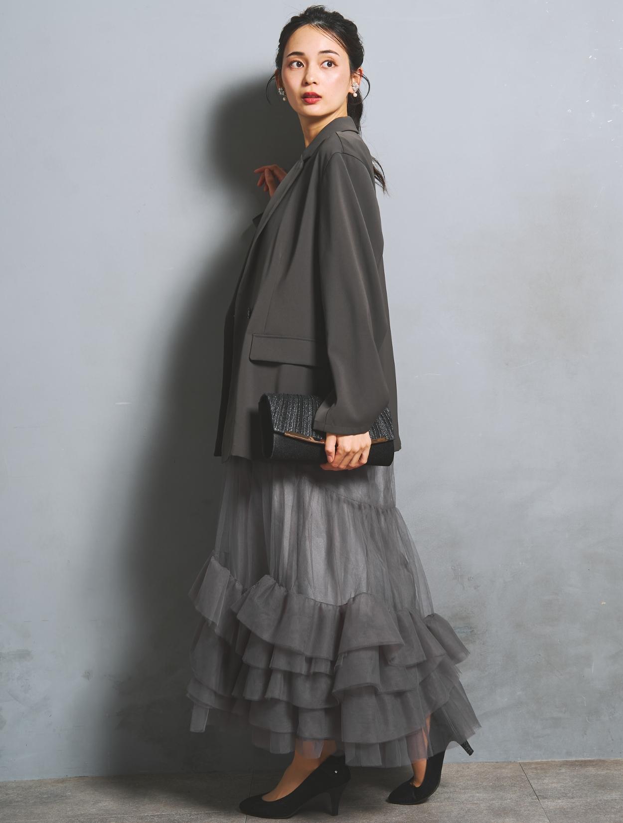裾に大胆なフリルをあしらったチュールワンピースと、W仕立てジャケットがセットになった、こなれ感たっぷりのトレンドドレス。絶妙な甘辛バランスがおしゃれさんに人気です。