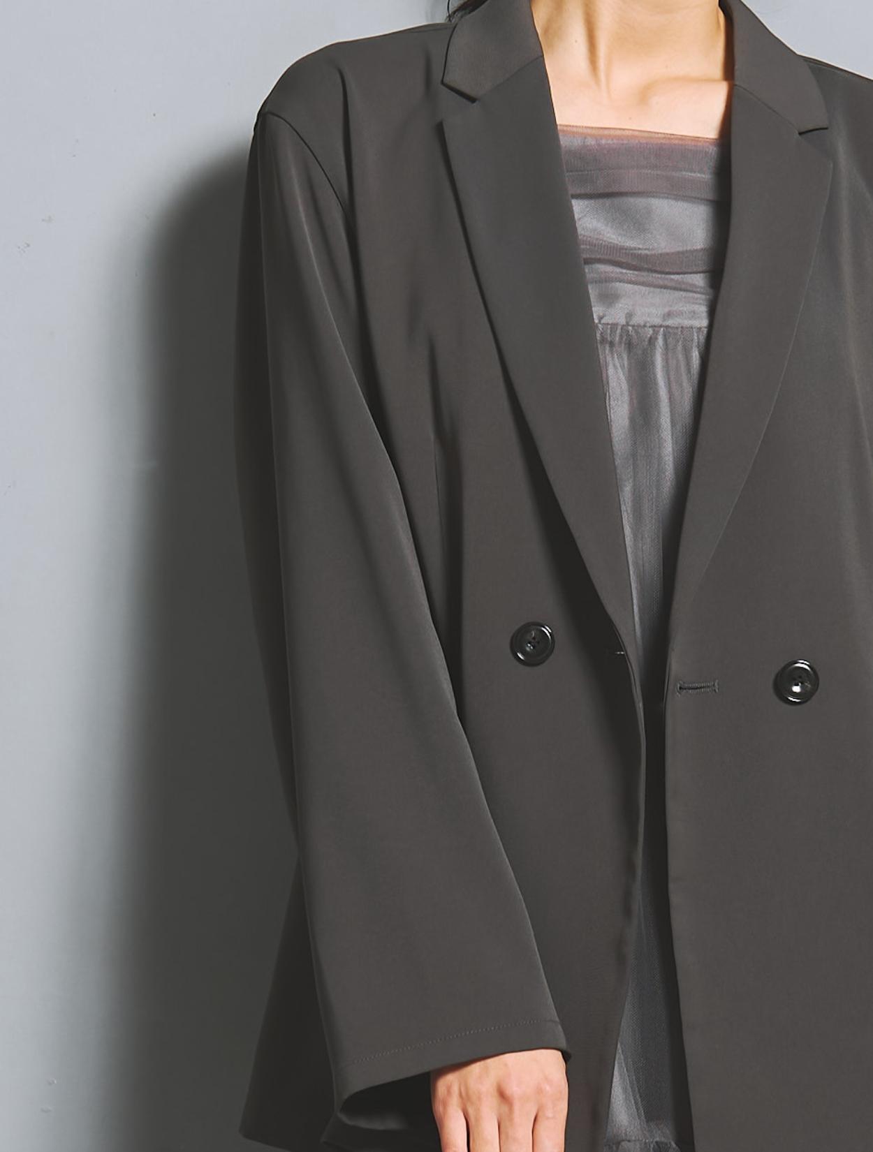 ジャケットはとろみのある生地で、落ち感が程よいリラックスムード。ゆとりを持たせたサイズ感で、サラッと羽織るだけでこなれたスタイリングに。華奢な方がざっくり着てもかっこいい着こなしになりますし、キャミワンピでは上半身の肉付きが気になる…という方にもカバー力抜群の強い味方のジャケットです。