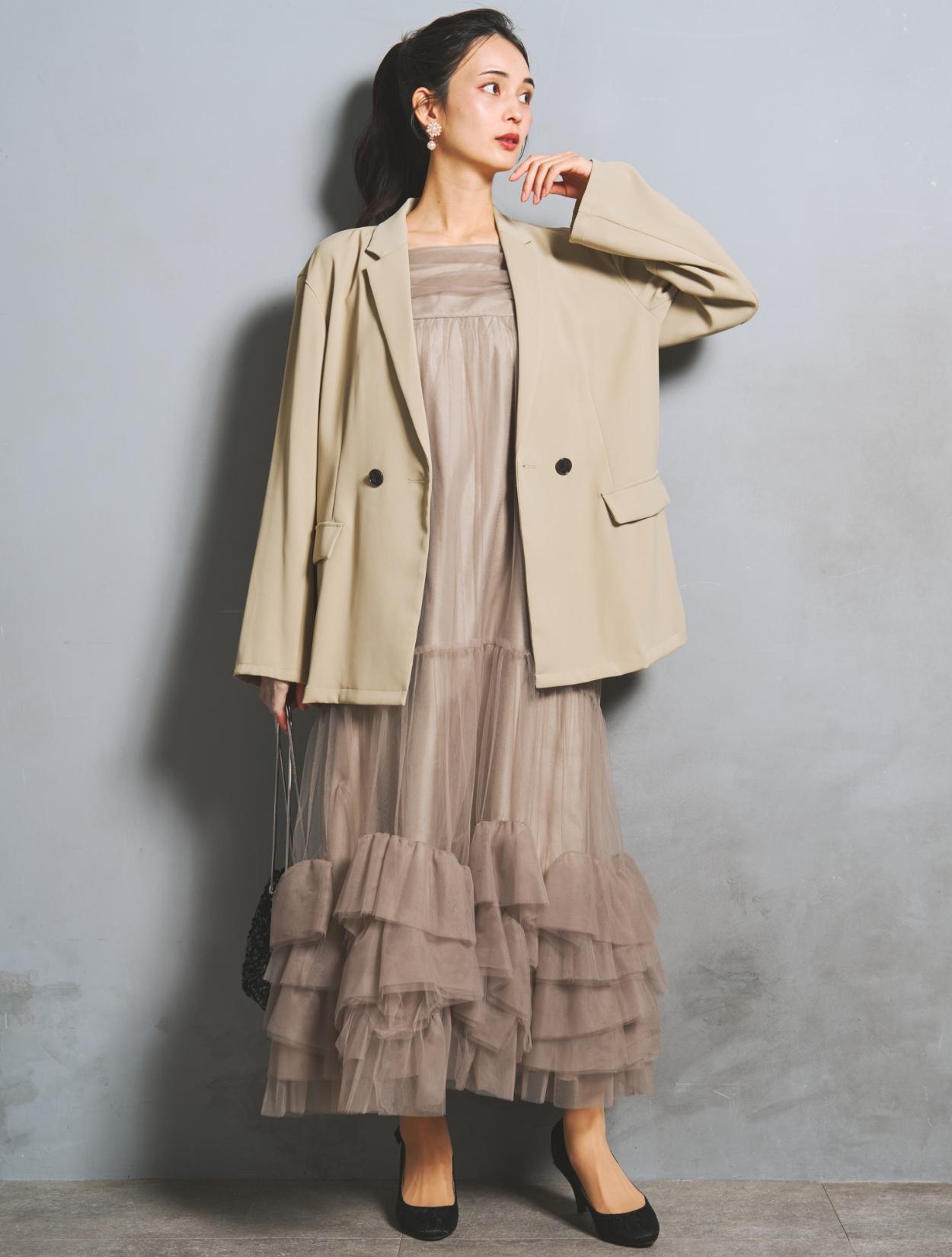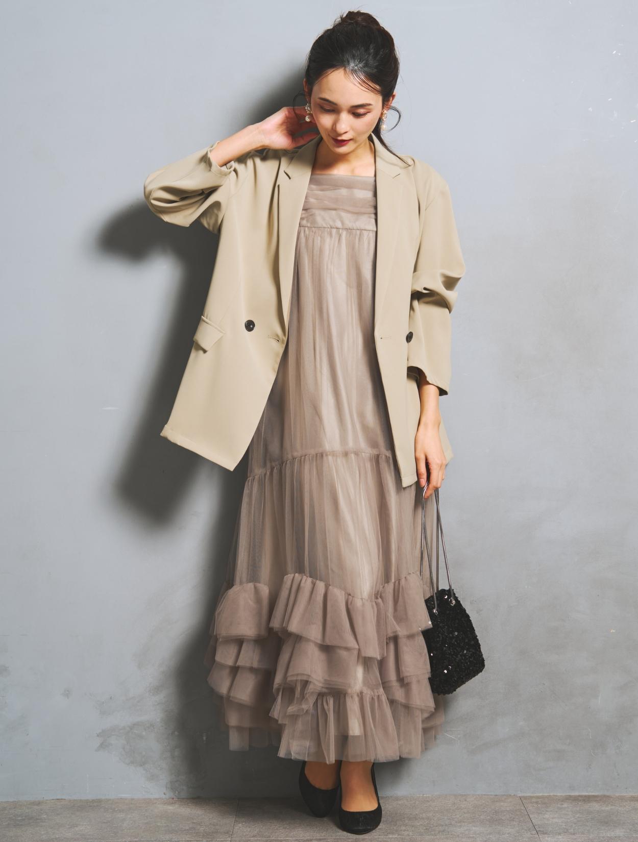 裾に大胆なフリルをあしらったチュールワンピースと、W仕立てジャケットがセットになった、こなれ感たっぷりのトレンドドレス。絶妙な甘辛バランスがおしゃれさんに人気です。