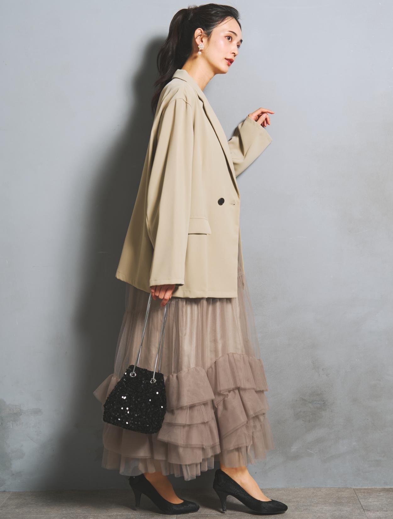 たっぷりのチュールフリルにトレンド感たっぷりのジャケットコーデは、20代30代におすすめです。