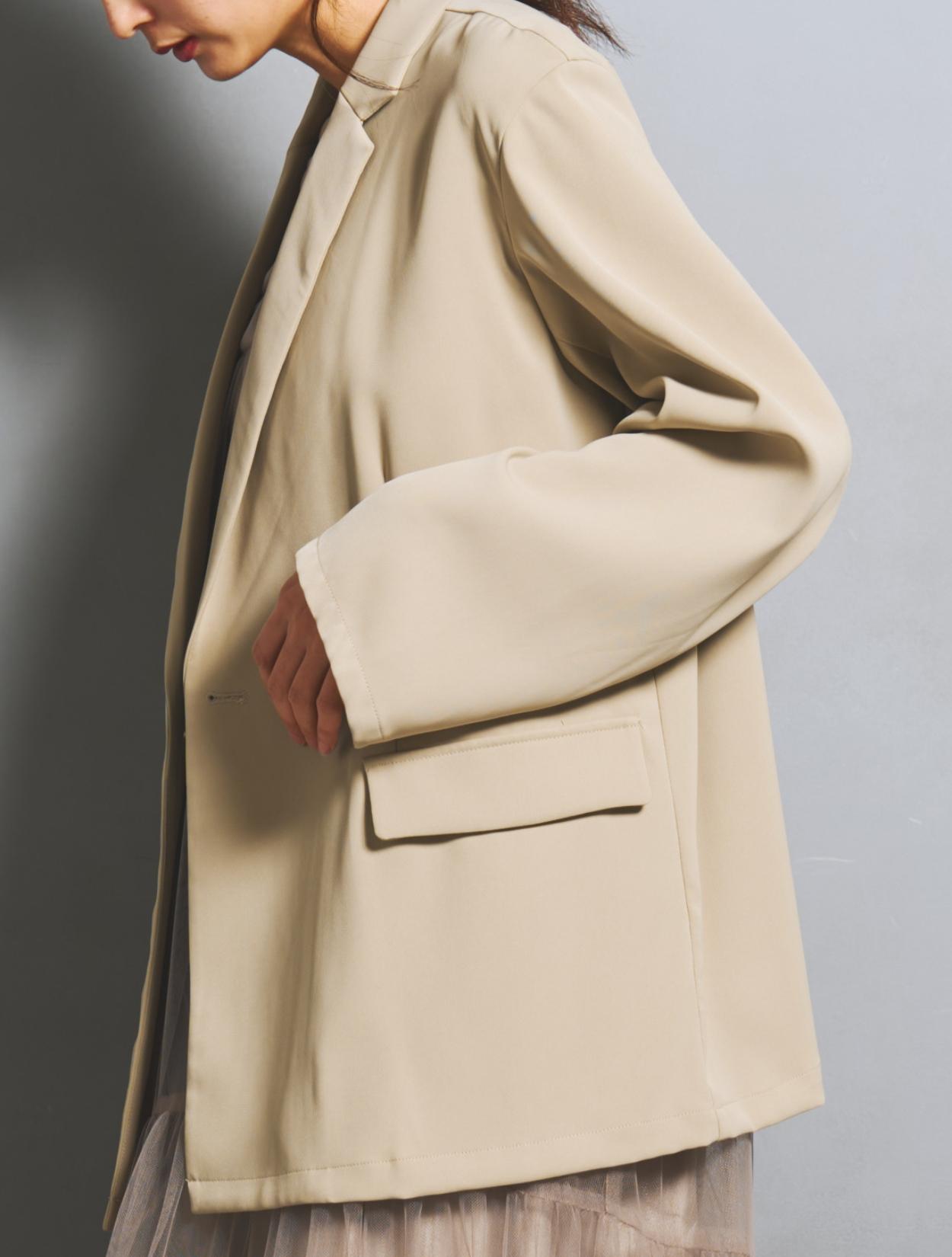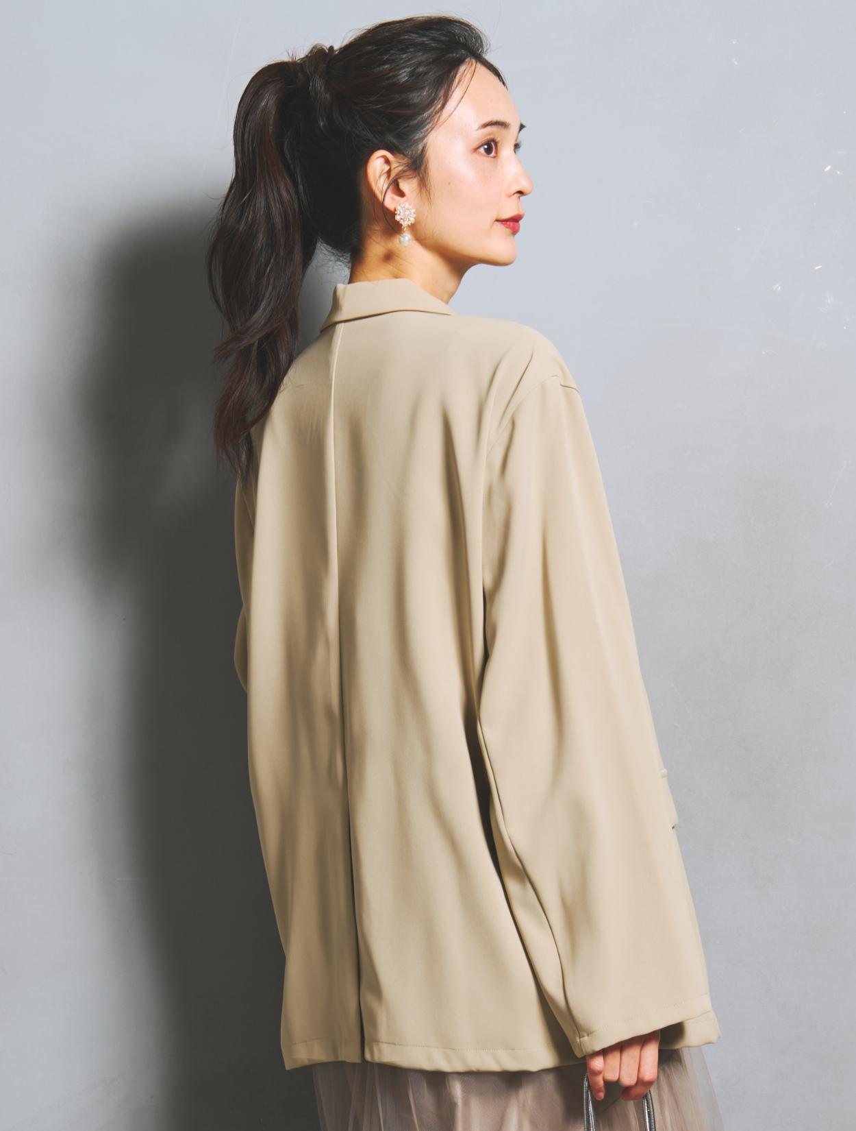 ジャケットはとろみのある生地で、落ち感が程よいリラックスムード。ゆとりを持たせたサイズ感で、サラッと羽織るだけでこなれたスタイリングに。華奢な方がざっくり着てもかっこいい着こなしになりますし、キャミワンピでは上半身の肉付きが気になる…という方にもカバー力抜群の強い味方のジャケットです。