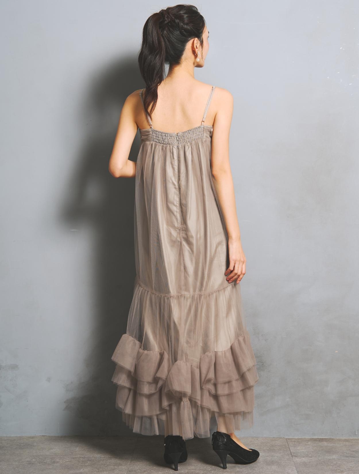 ワンピースはしっかりボリュームを持たせても、チュールの透け感でエアリーな雰囲気に。裏地が透けるのでダークカラーでも重たく見えません。ウエスト周りには切り替えがなく、ゆったり着られるのでマタニティ用のドレスとしてもおすすめ。