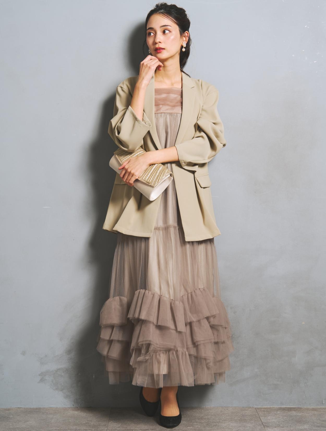 裾に大胆なフリルをあしらったチュールワンピースと、W仕立てジャケットがセットになった、こなれ感たっぷりのトレンドドレス。絶妙な甘辛バランスがおしゃれさんに人気です。