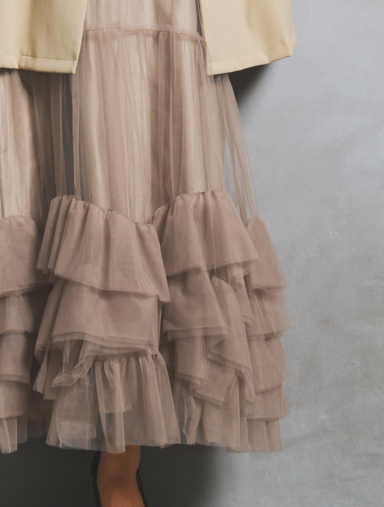 キャンワンピースのチュールは、優しいビスケットの様なベージュカラー。インナーの裏地は黄色味のあるベージュで、ベージュでもしっかり色味を感じます。ぼやっと地味見えしないのもポイント。