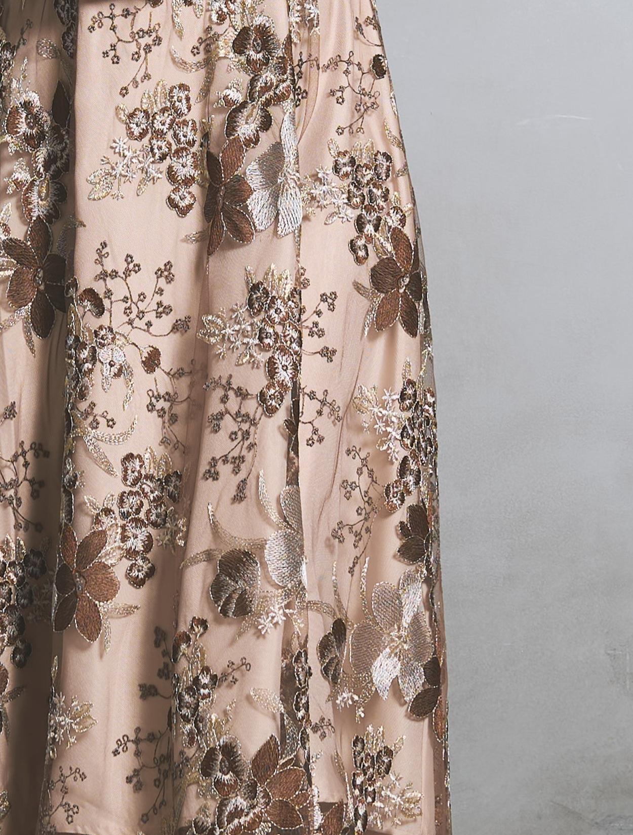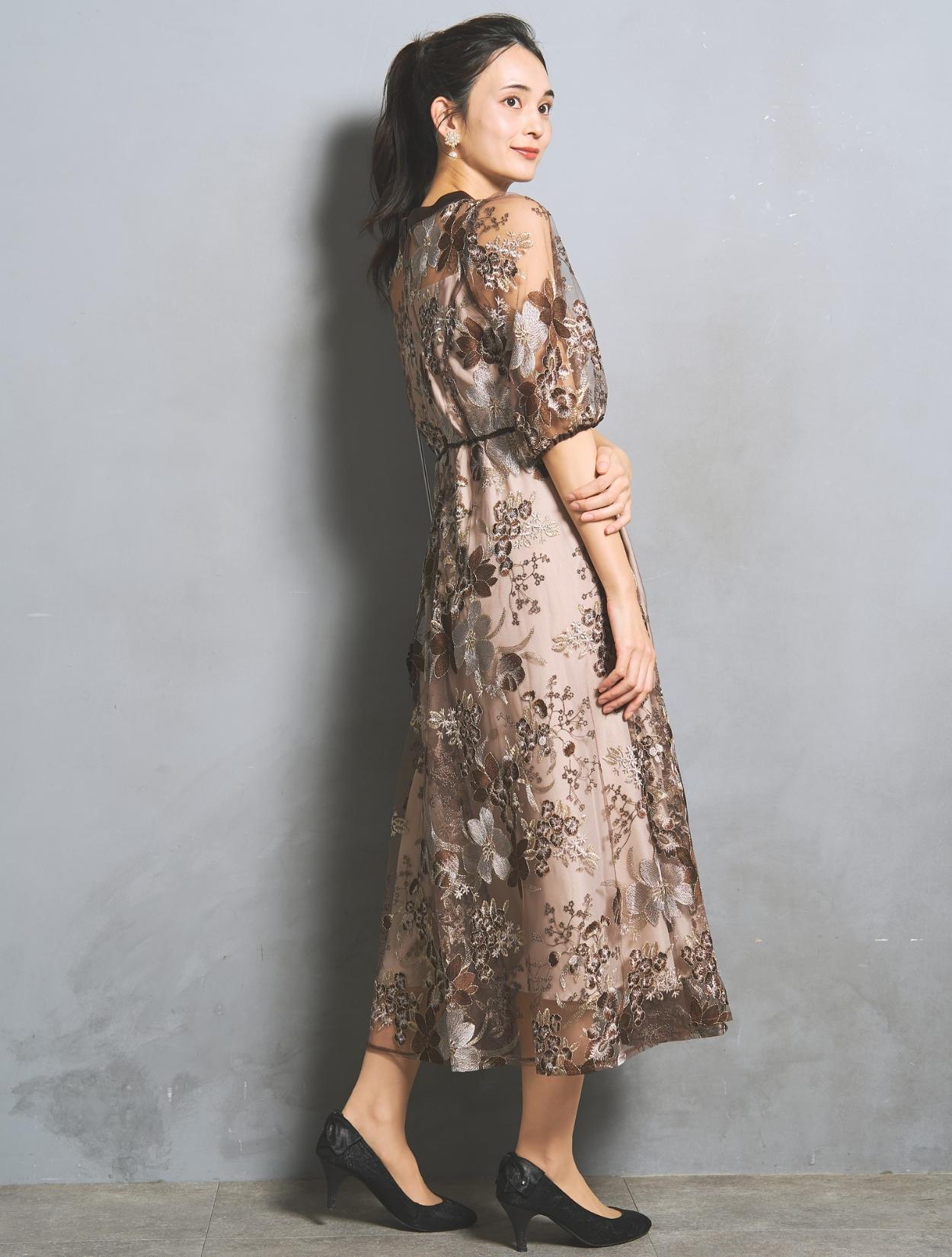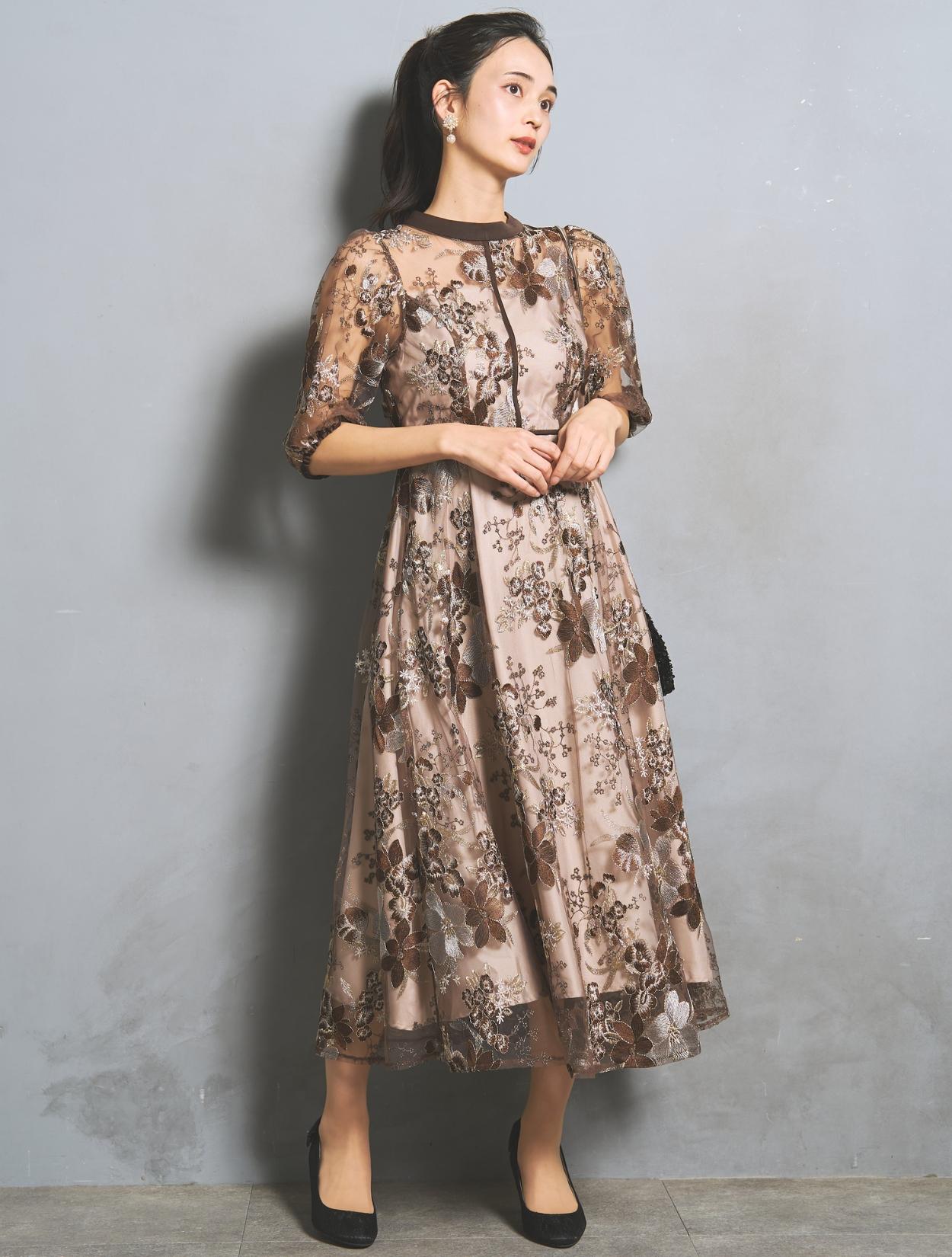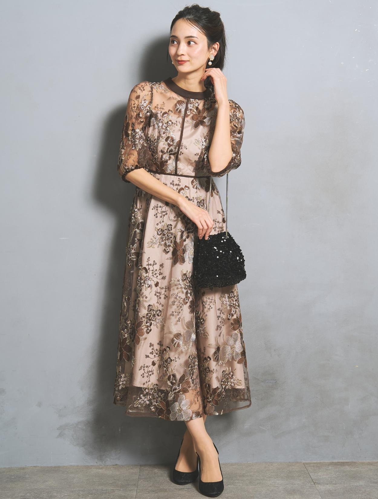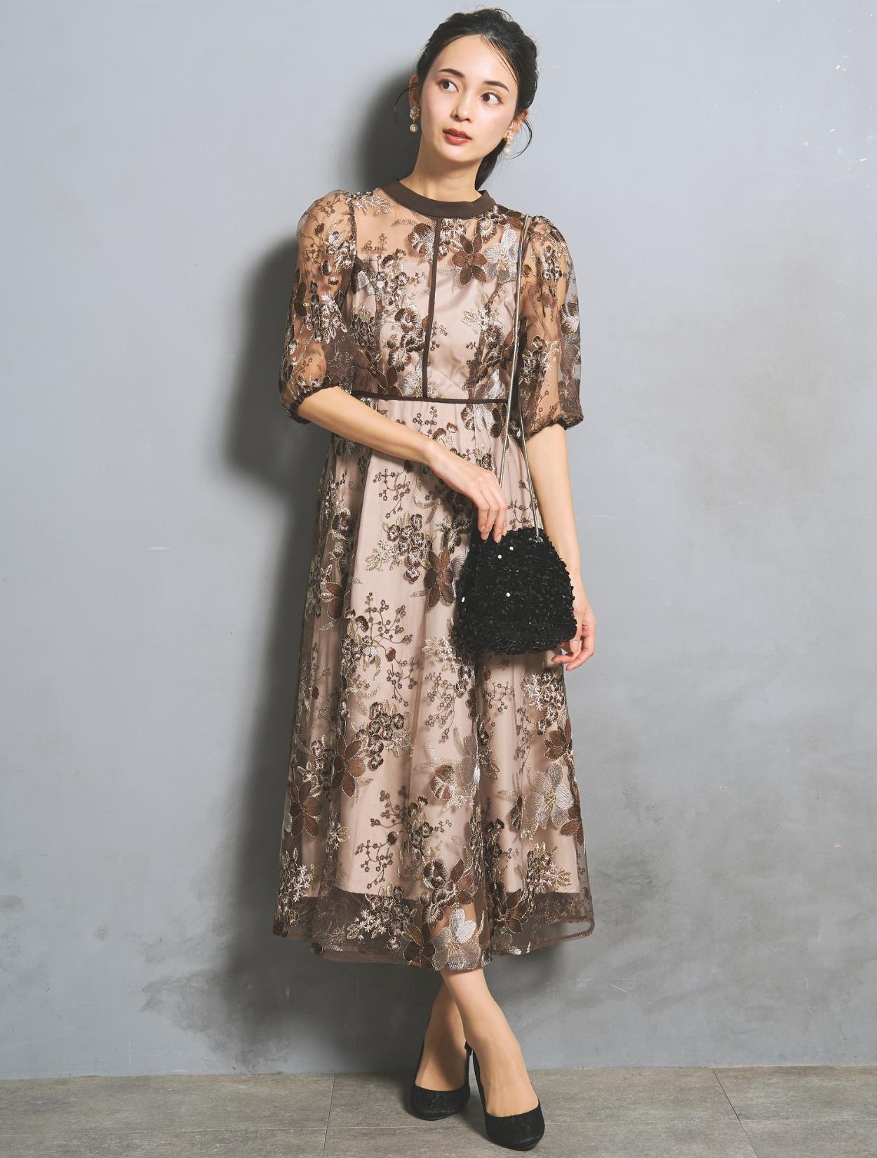 落ち着いたカラードレスとして人気のブラウンカラー。ダークブラウンのパイピングに、ブラウン・ベージュ系のフラワー刺繍。全体的に統一感のある配色はフォーマル度も高く見えます。