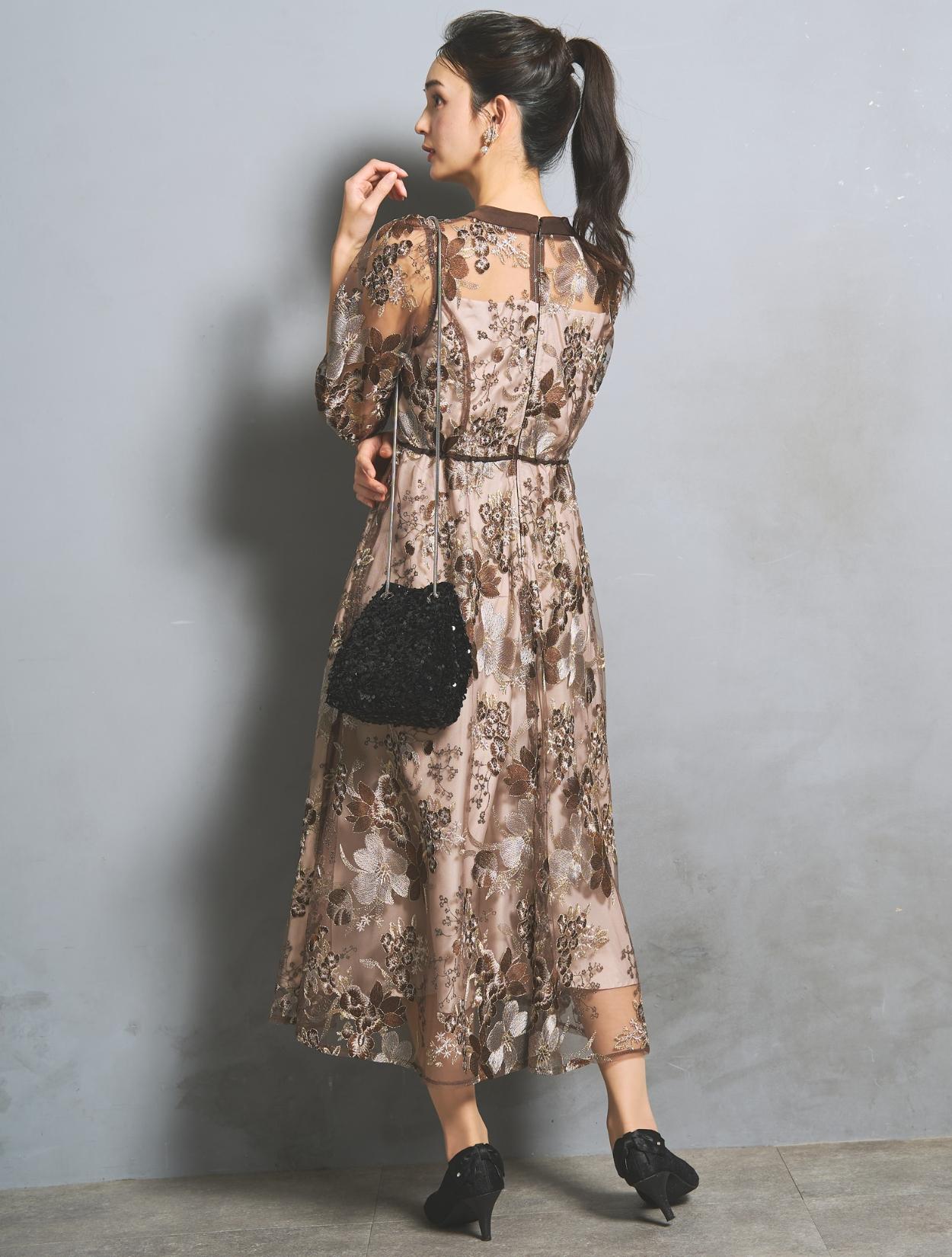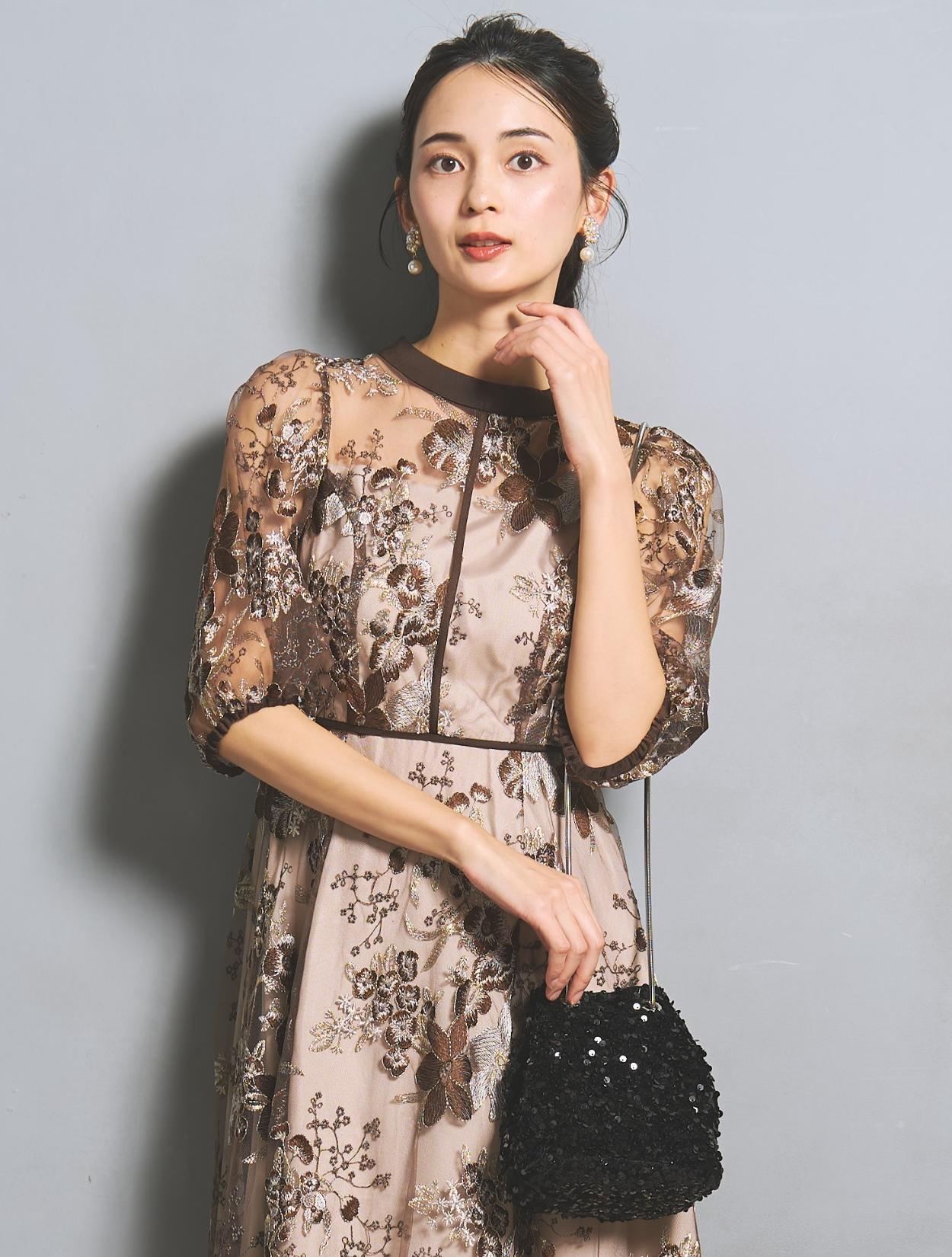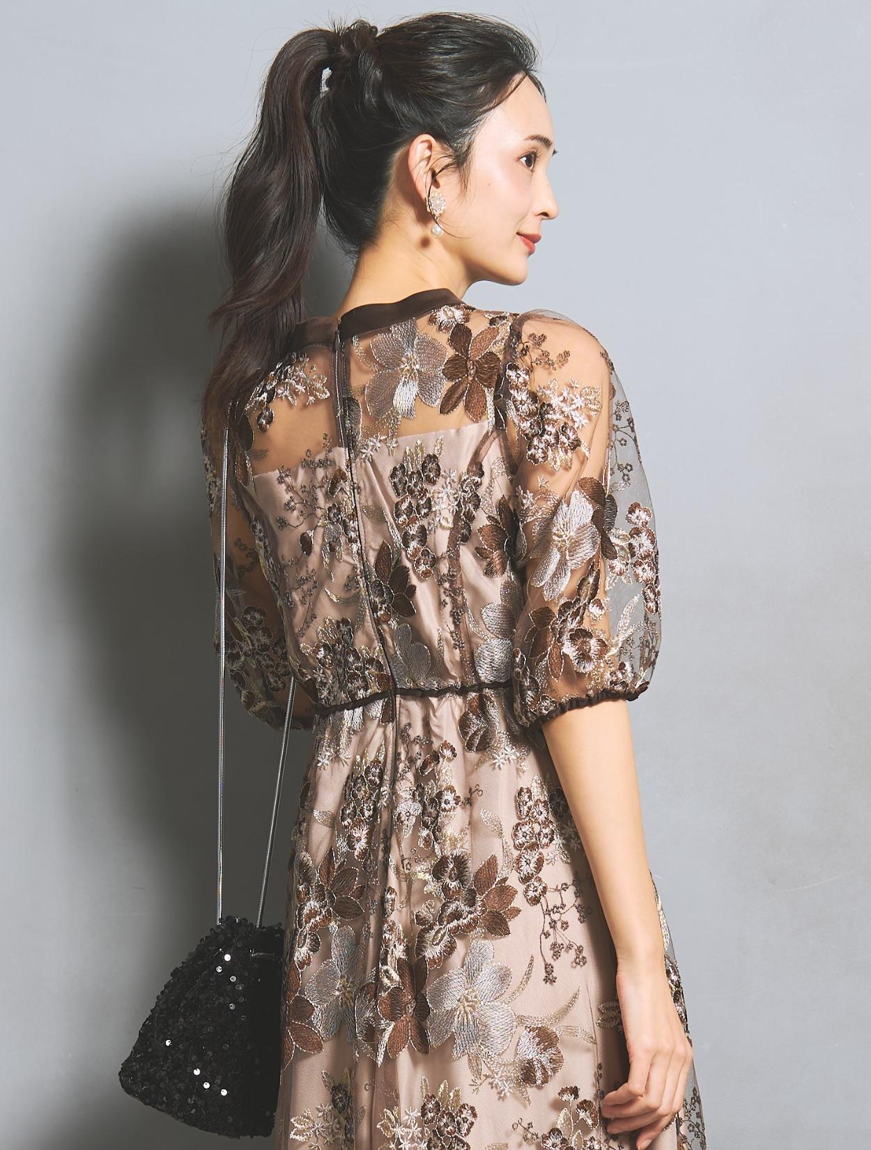 フラワー刺繍レースが華やかなオケージョンドレス。程よい大きさのフラワー柄は、上品な存在感もありパーティーシーンにもぴったりです。刺繍糸には光沢もあり、高級感があるのもポイント。着丈が長過ぎないミニマルなシルエットで、低身長さんにもおすすめのドレスです。
