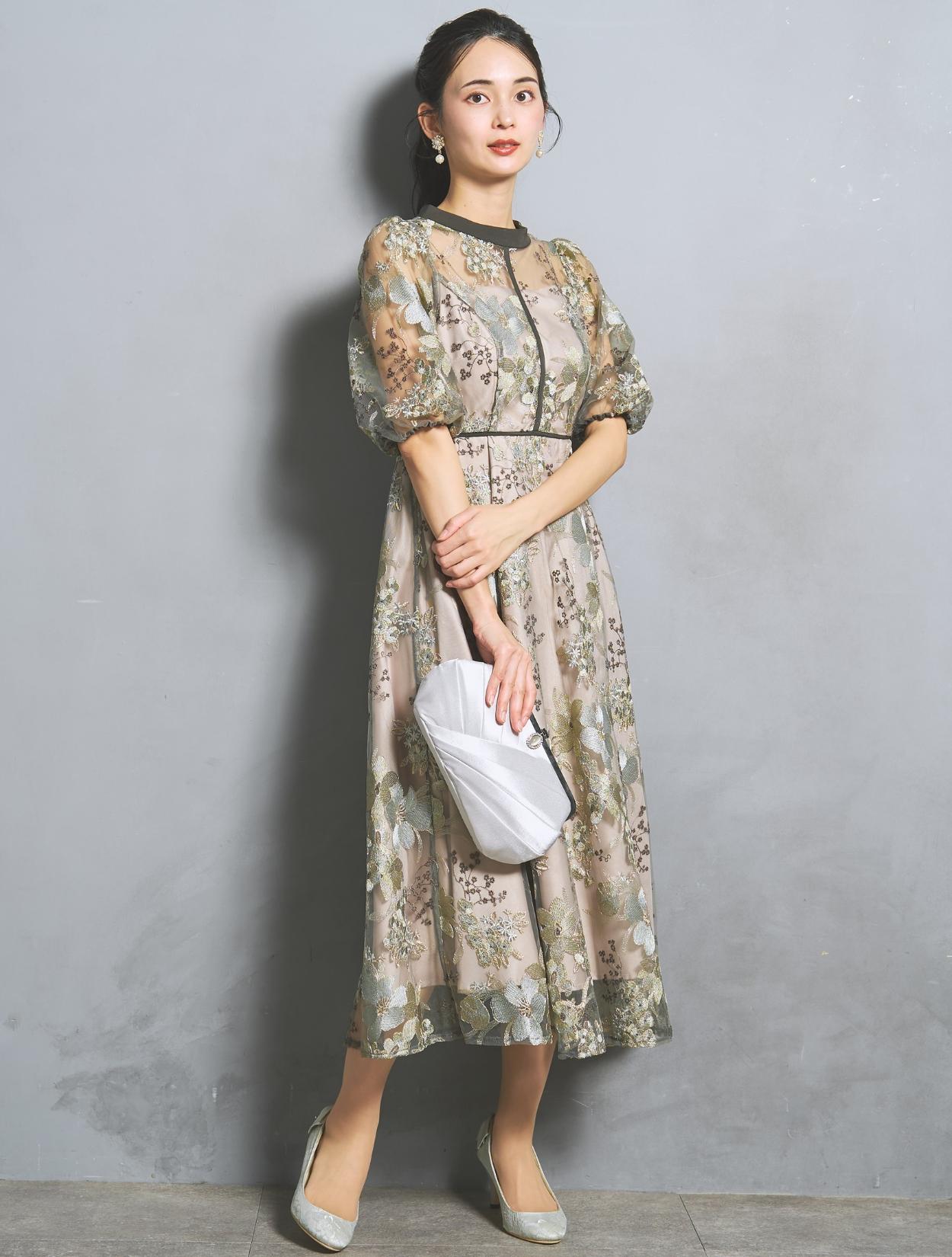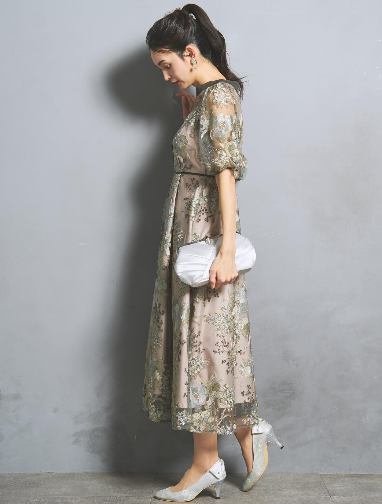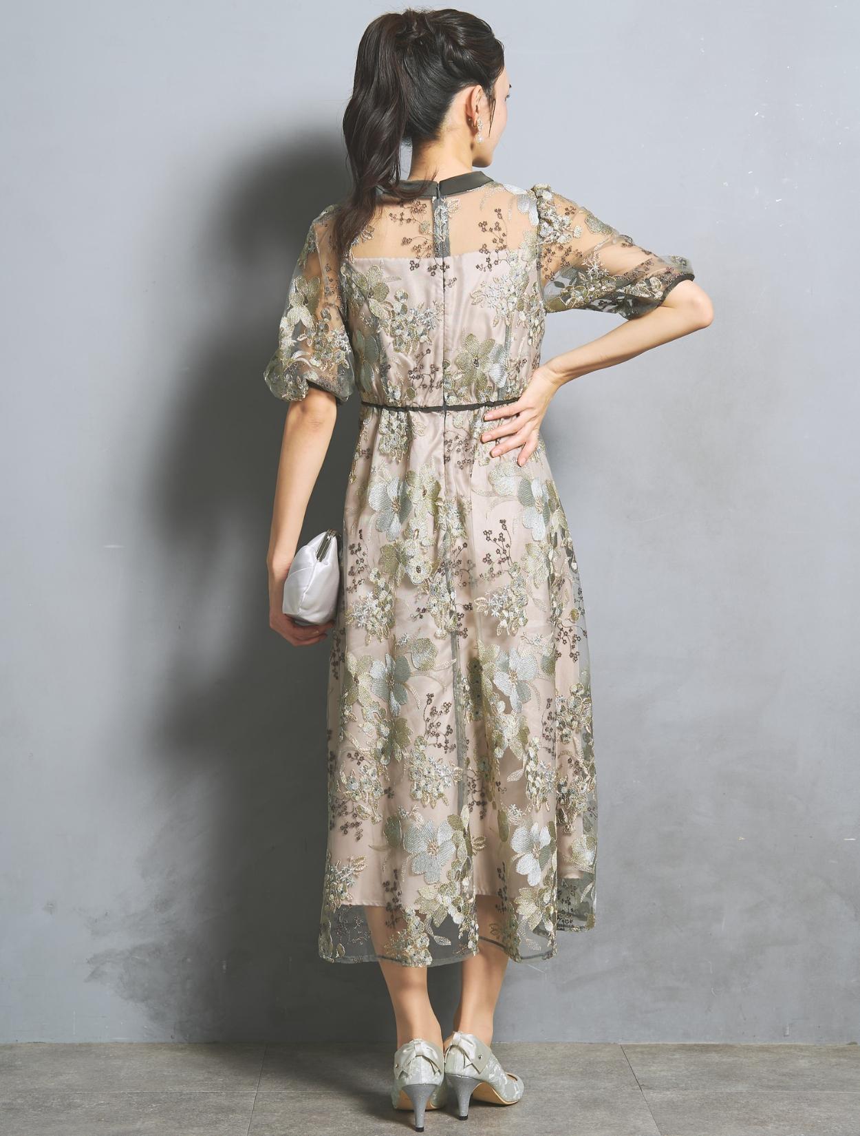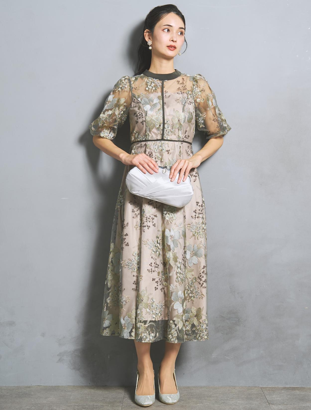 フラワー刺繍レースが華やかなオケージョンドレス。程よい大きさのフラワー柄は、上品な存在感もありパーティーシーンにもぴったりです。刺繍糸には光沢もあり、高級感があるのもポイント。着丈が長過ぎないミニマルなシルエットで、低身長さんにもおすすめのドレスです。