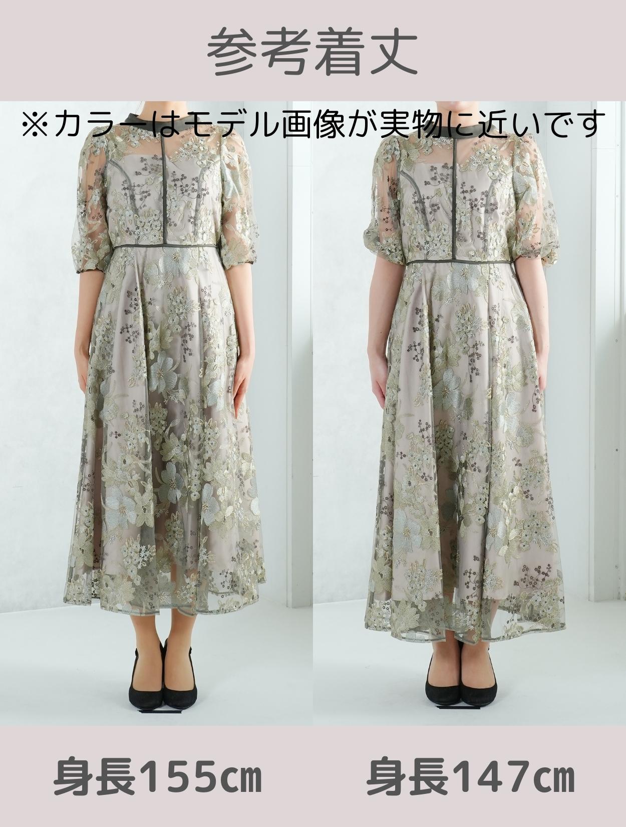フラワー刺繍レースが華やかなオケージョンドレス。程よい大きさのフラワー柄は、上品な存在感もありパーティーシーンにもぴったりです。刺繍糸には光沢もあり、高級感があるのもポイント。着丈が長過ぎないミニマルなシルエットで、低身長さんにもおすすめのドレスです。