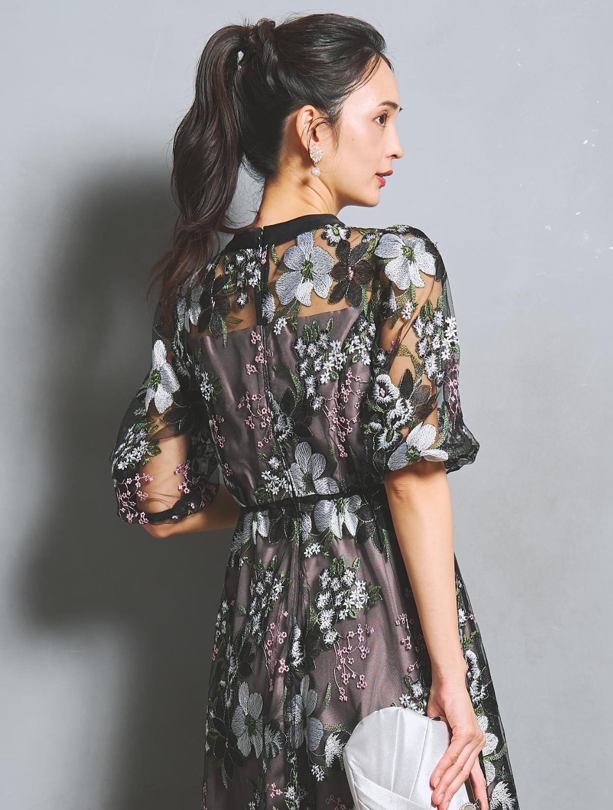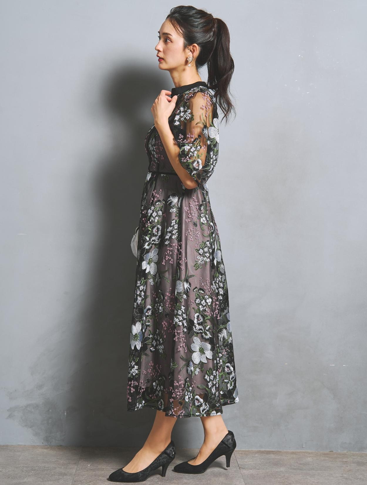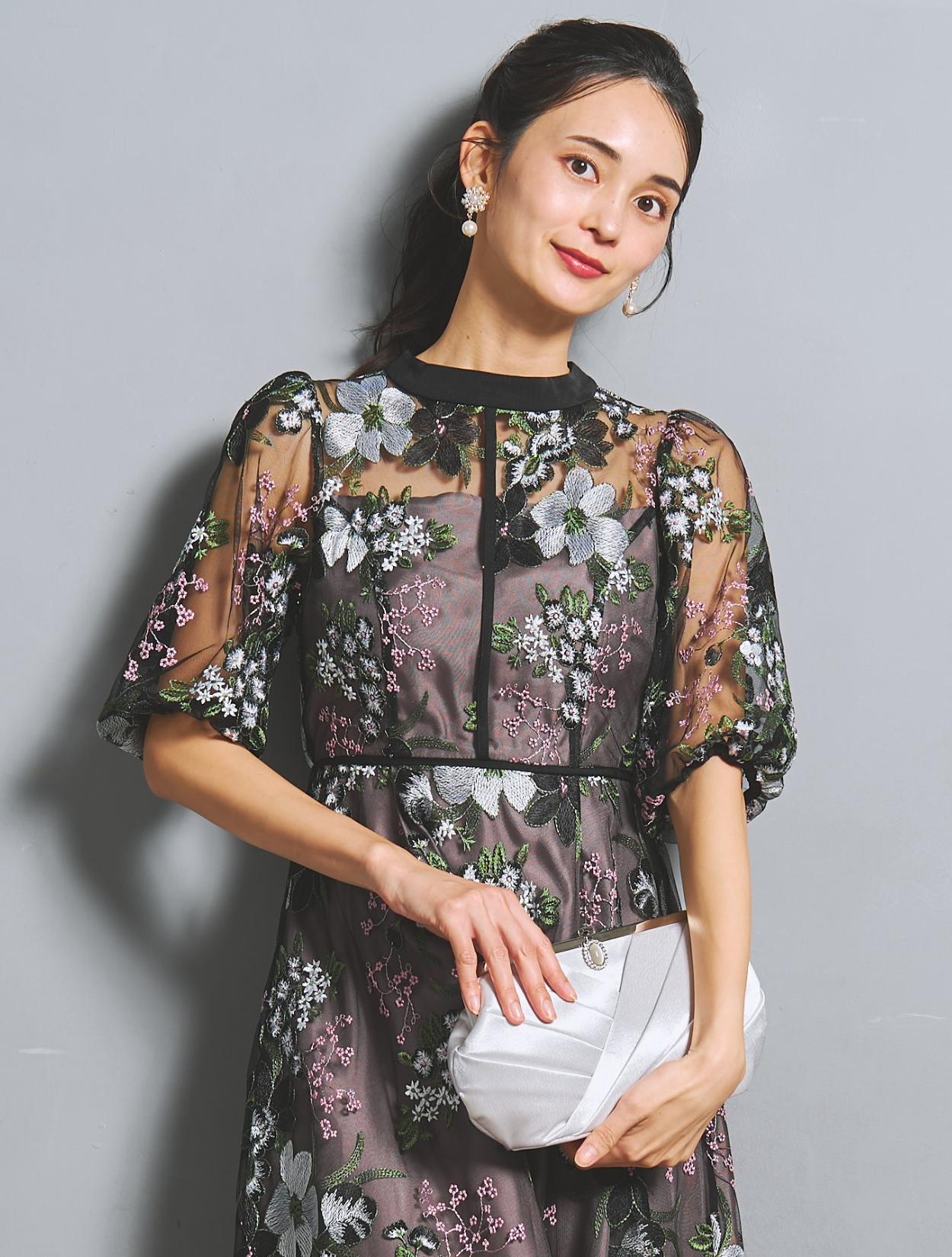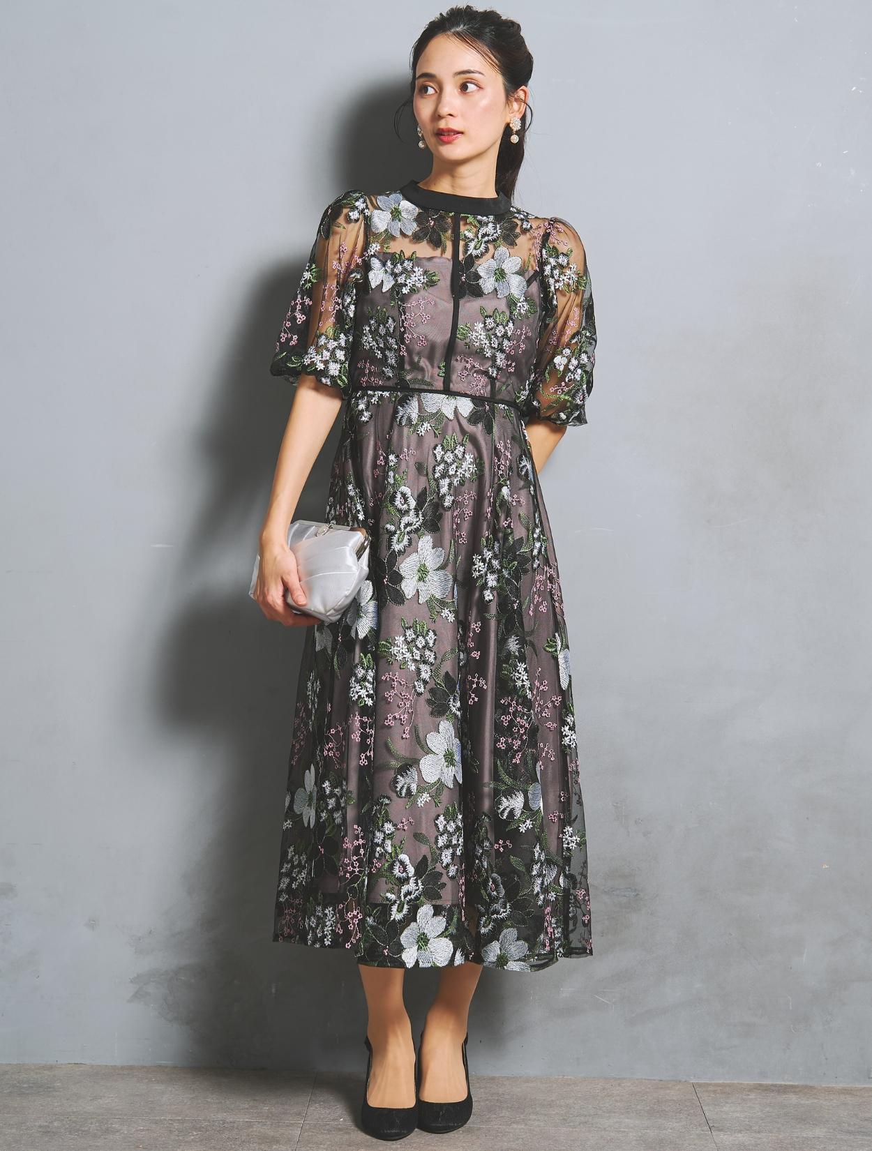 フラワー刺繍レースが華やかなオケージョンドレス。程よい大きさのフラワー柄は、上品な存在感もありパーティーシーンにもぴったりです。刺繍糸には光沢もあり、高級感があるのもポイント。着丈が長過ぎないミニマルなシルエットで、低身長さんにもおすすめのドレスです。