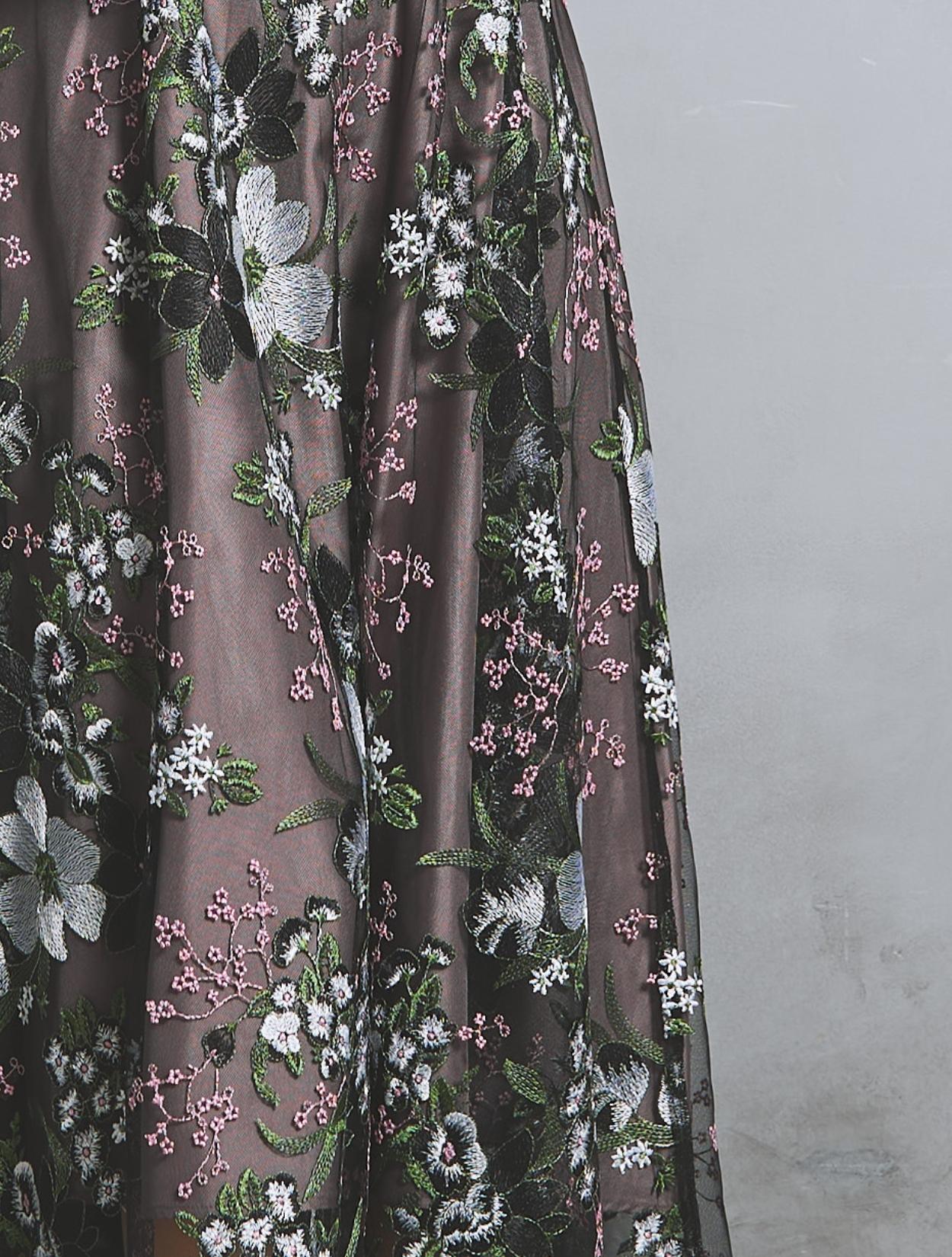 ブラックのチュールにピンクや白のフラワー刺繍。ブラックドレスでも華やかで軽さのある配色です。グリーンのリーフ刺繍がさり気ないカラーアクセントになります。