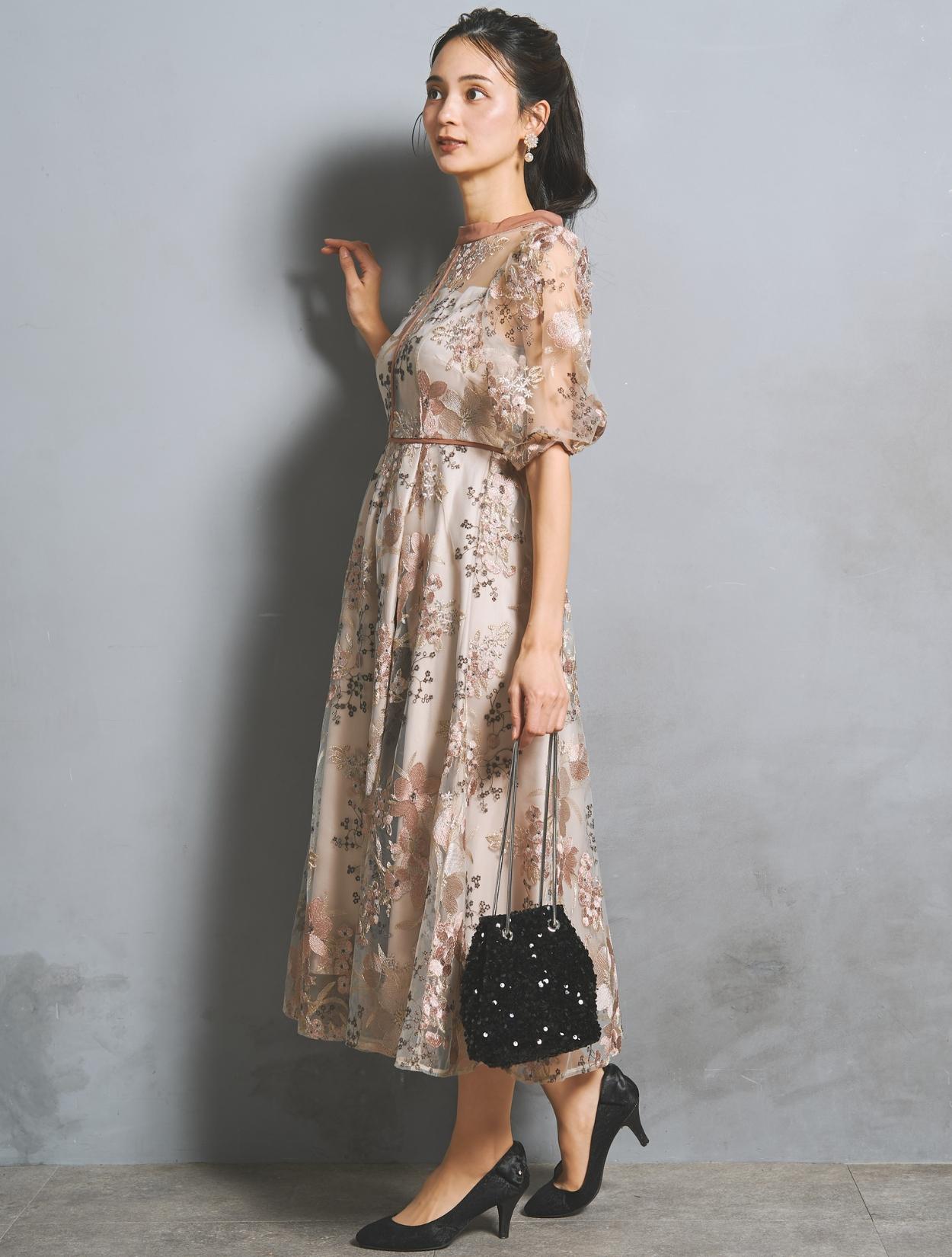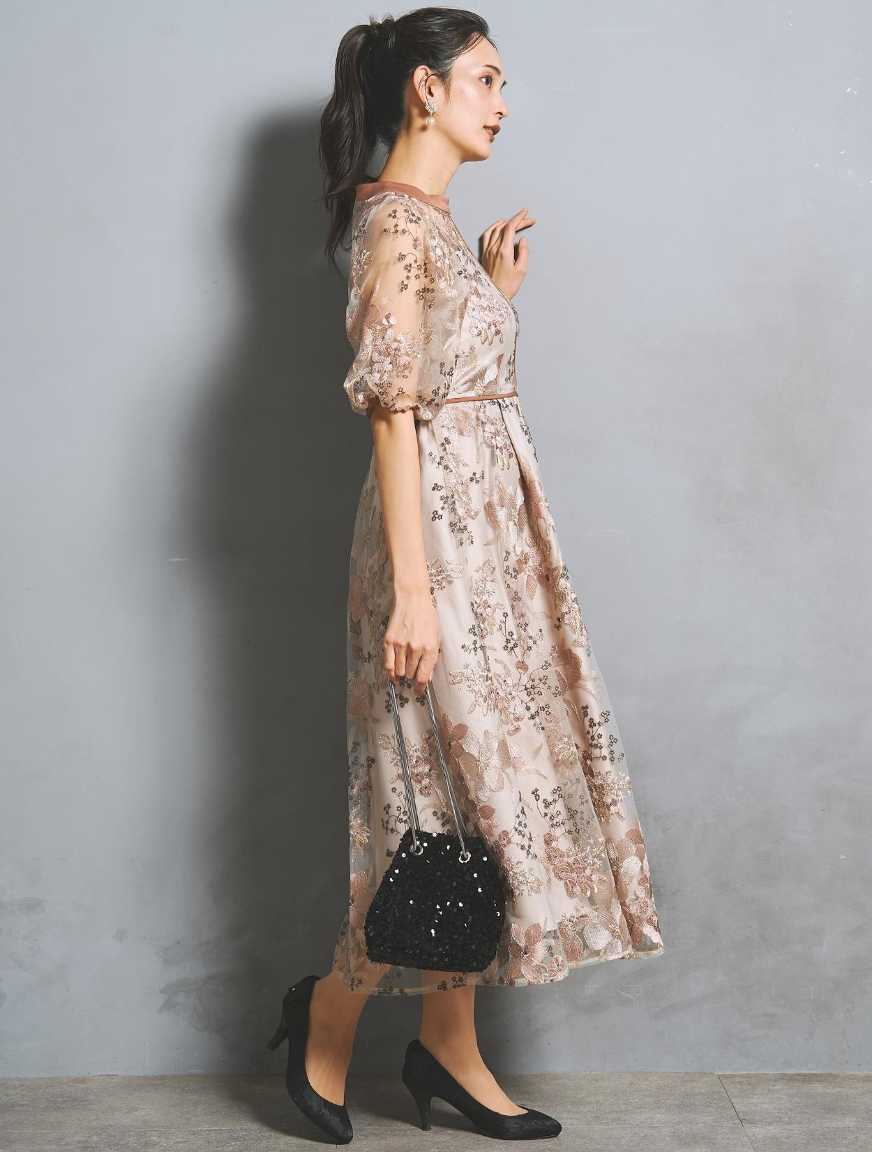 フラワー刺繍レースが華やかなオケージョンドレス。程よい大きさのフラワー柄は、上品な存在感もありパーティーシーンにもぴったりです。刺繍糸には光沢もあり、高級感があるのもポイント。着丈が長過ぎないミニマルなシルエットで、低身長さんにもおすすめのドレスです。