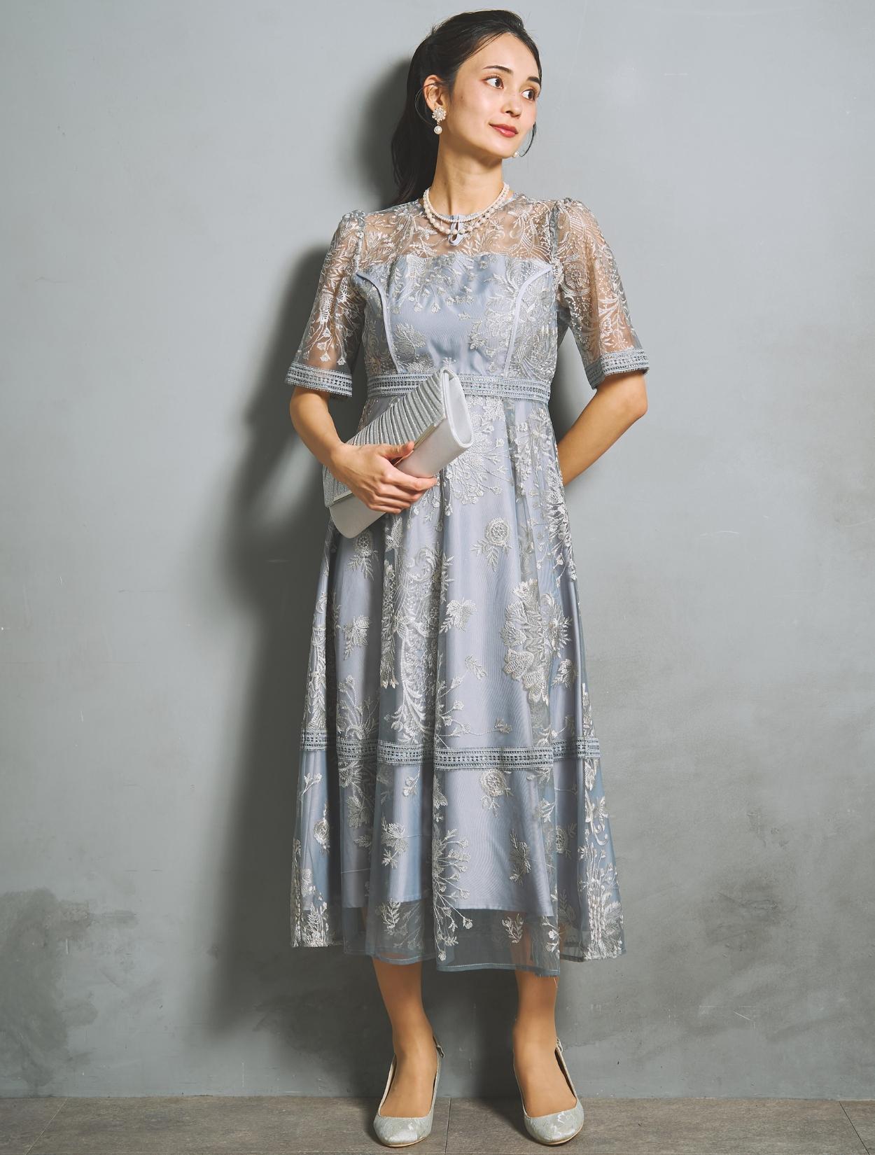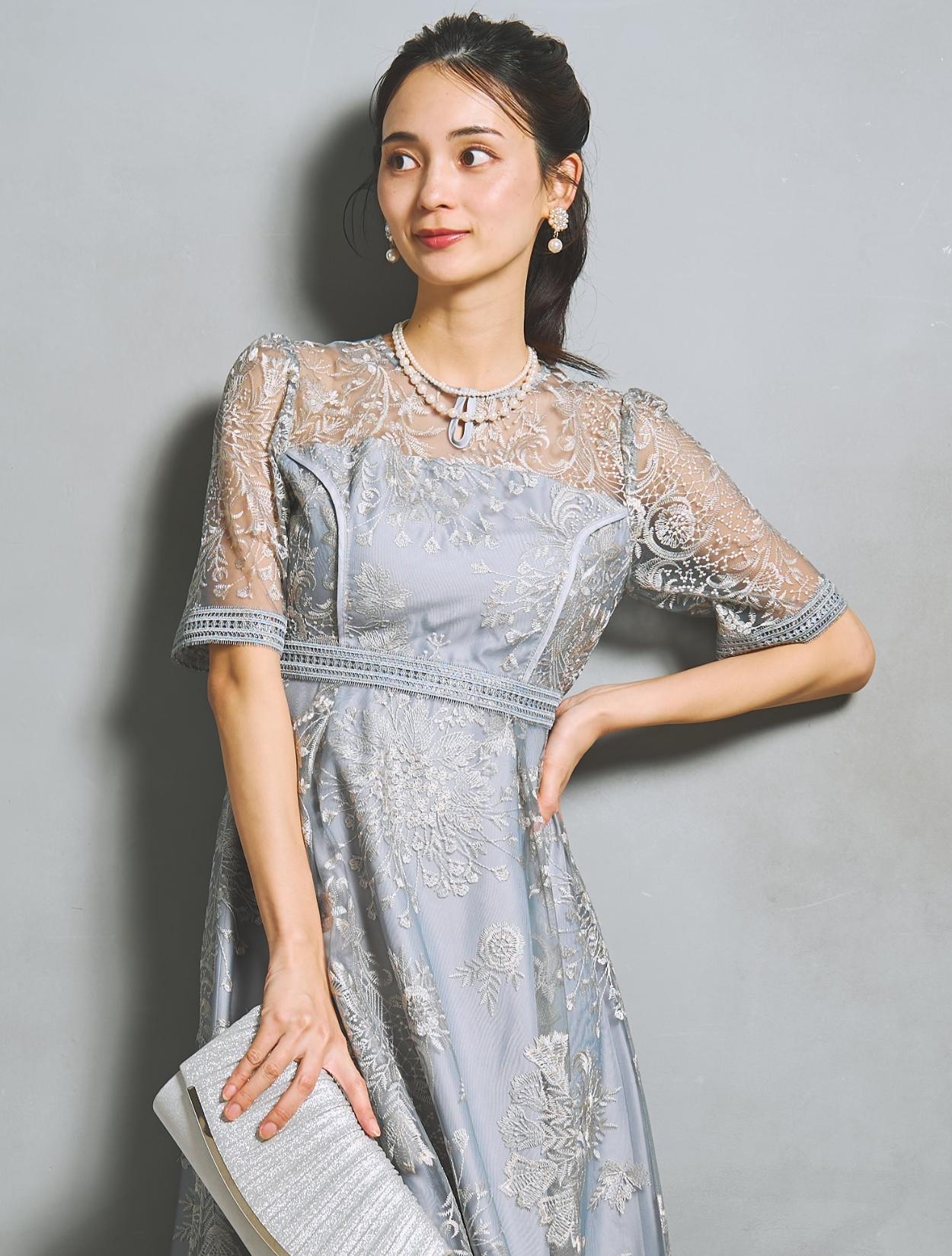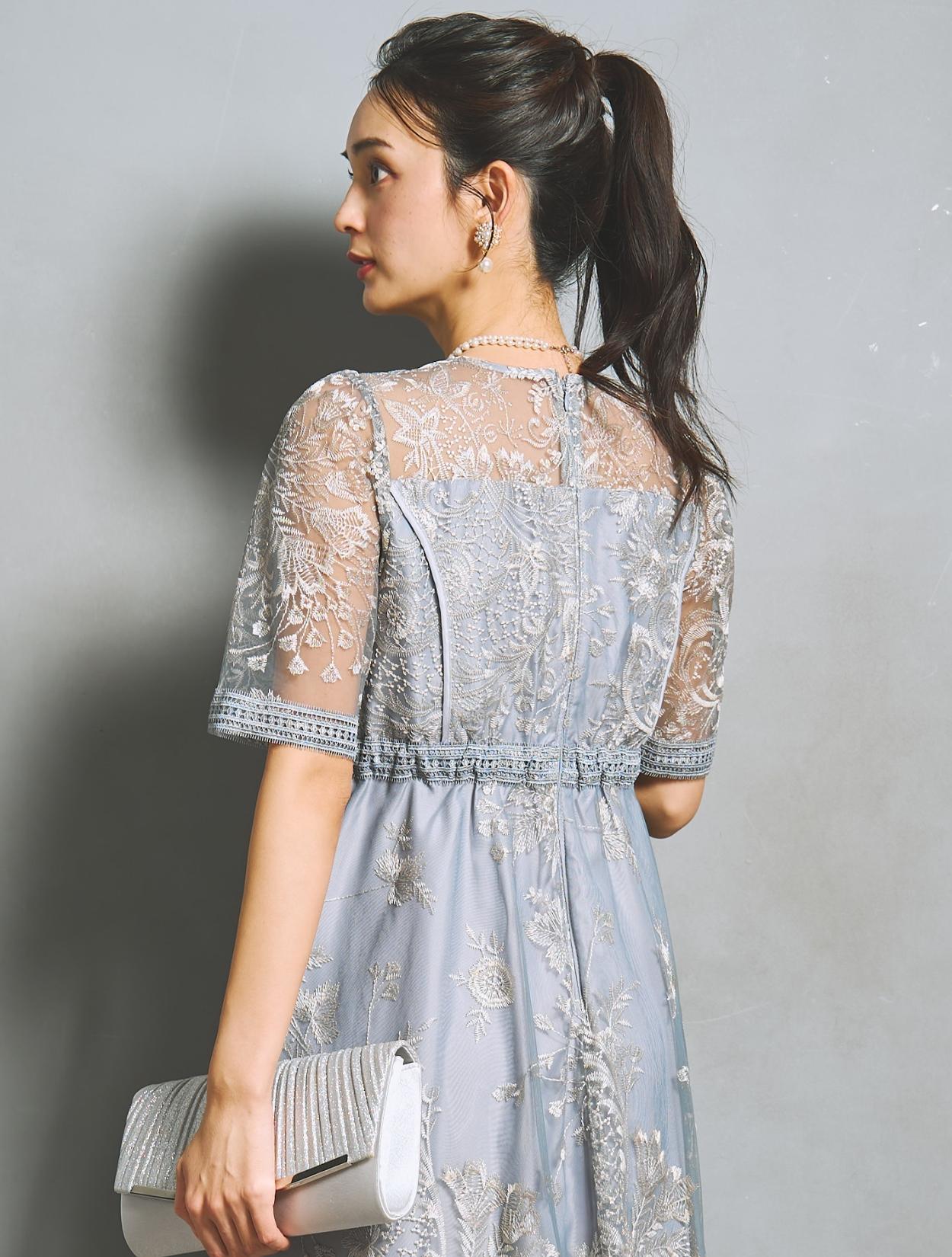 様々なフラワー柄の刺繍は、多色使いで華やかな雰囲気。単調にならない刺繍柄は立体感があり、パッと目を惹く褒められドレスです。総刺繍レースの生地をしっかり使用したスカートは、ふんわりフレアライン。軽やかなエアリー感もアップ。スカート裾には透け感があり、足元も重たく見えません。