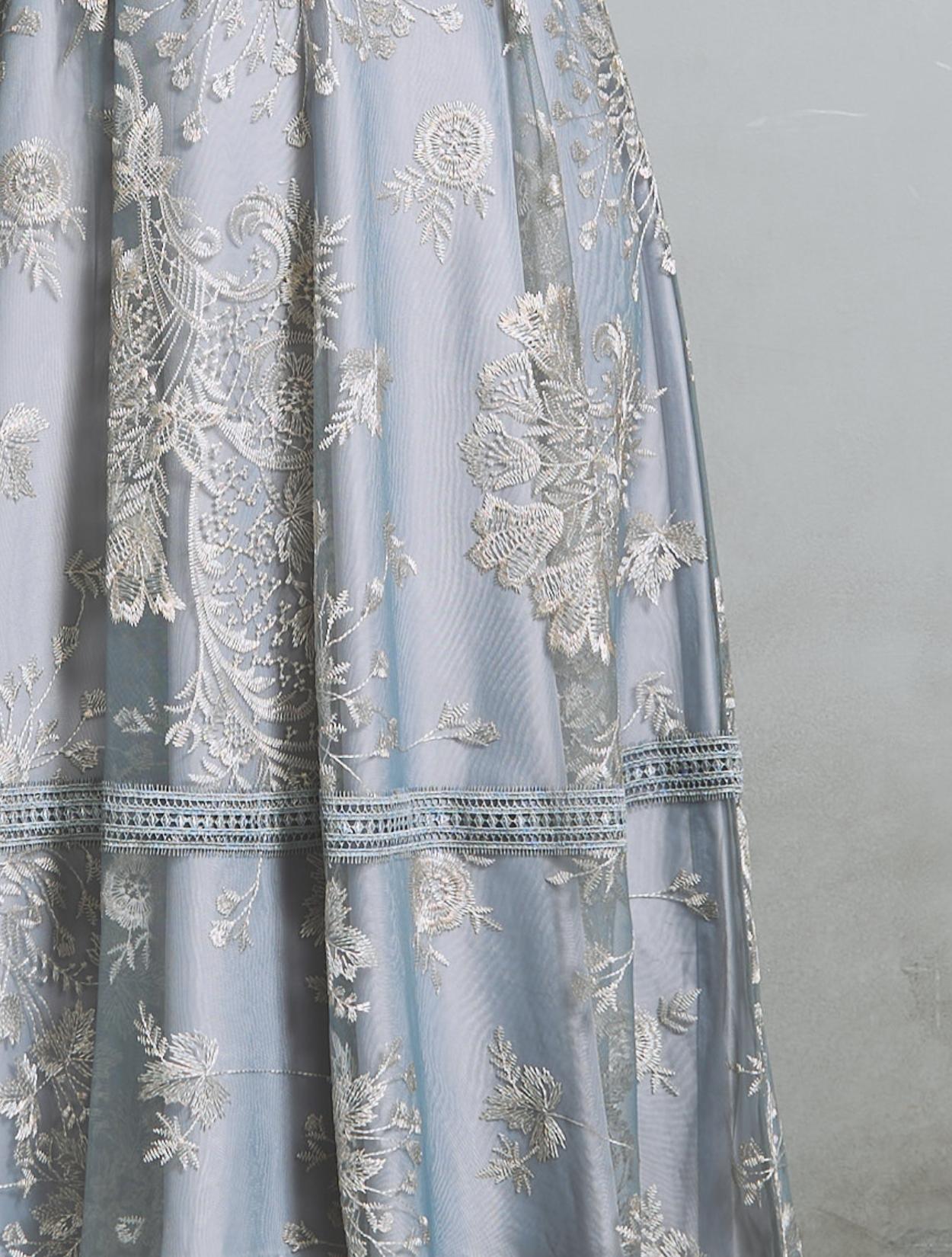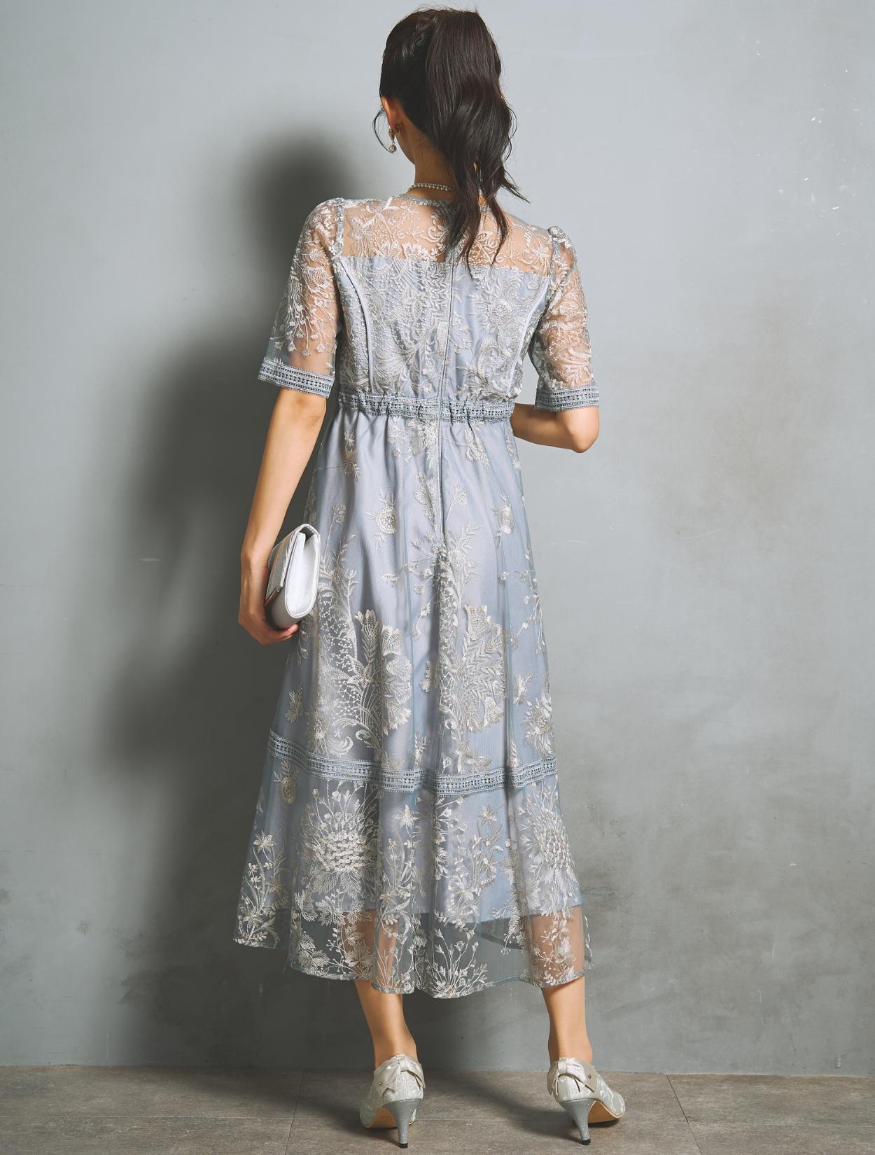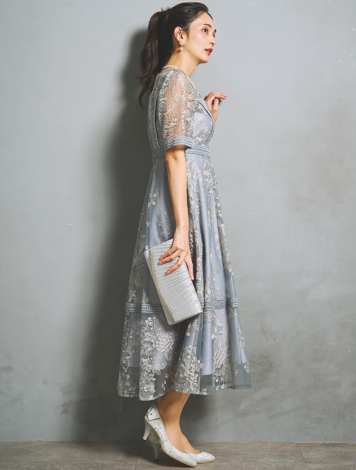 様々なフラワー柄の刺繍は、多色使いで華やかな雰囲気。単調にならない刺繍柄は立体感があり、パッと目を惹く褒められドレスです。総刺繍レースの生地をしっかり使用したスカートは、ふんわりフレアライン。軽やかなエアリー感もアップ。スカート裾には透け感があり、足元も重たく見えません。