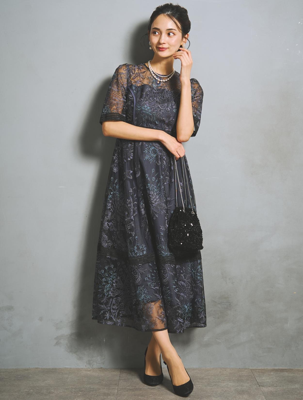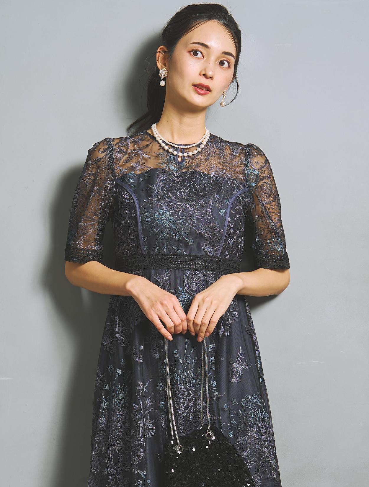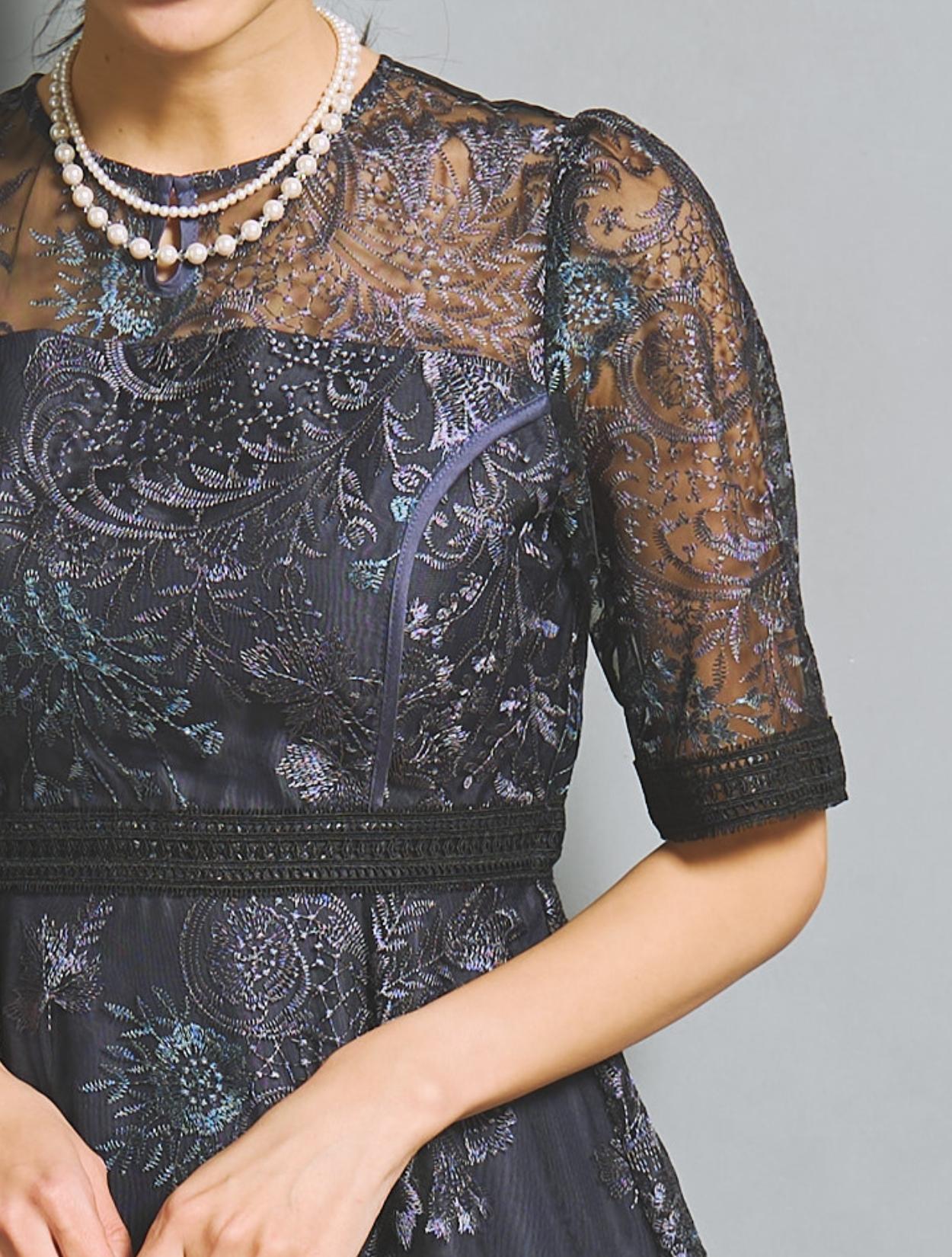 パープルやブルーなど青味系の刺繍レースが、ネイビードレスを華やかにアップデート。裏地のネイビーも濃くはっきりした色味で、地味見えしません。ブラックのレースパイピングがアクセントになります。