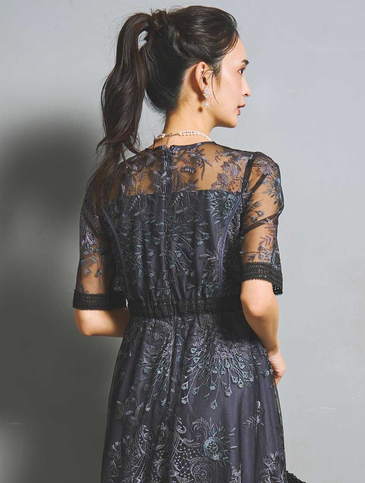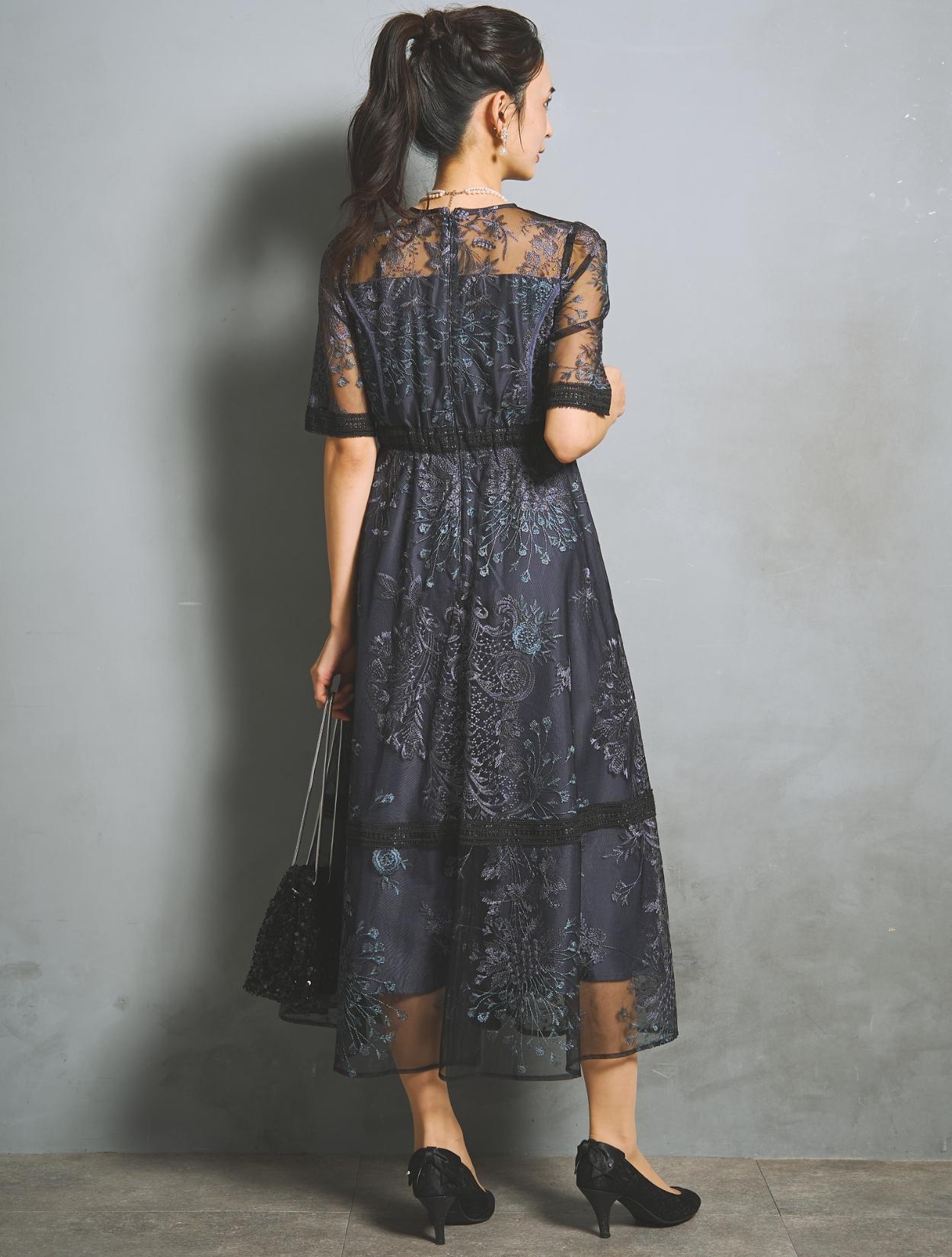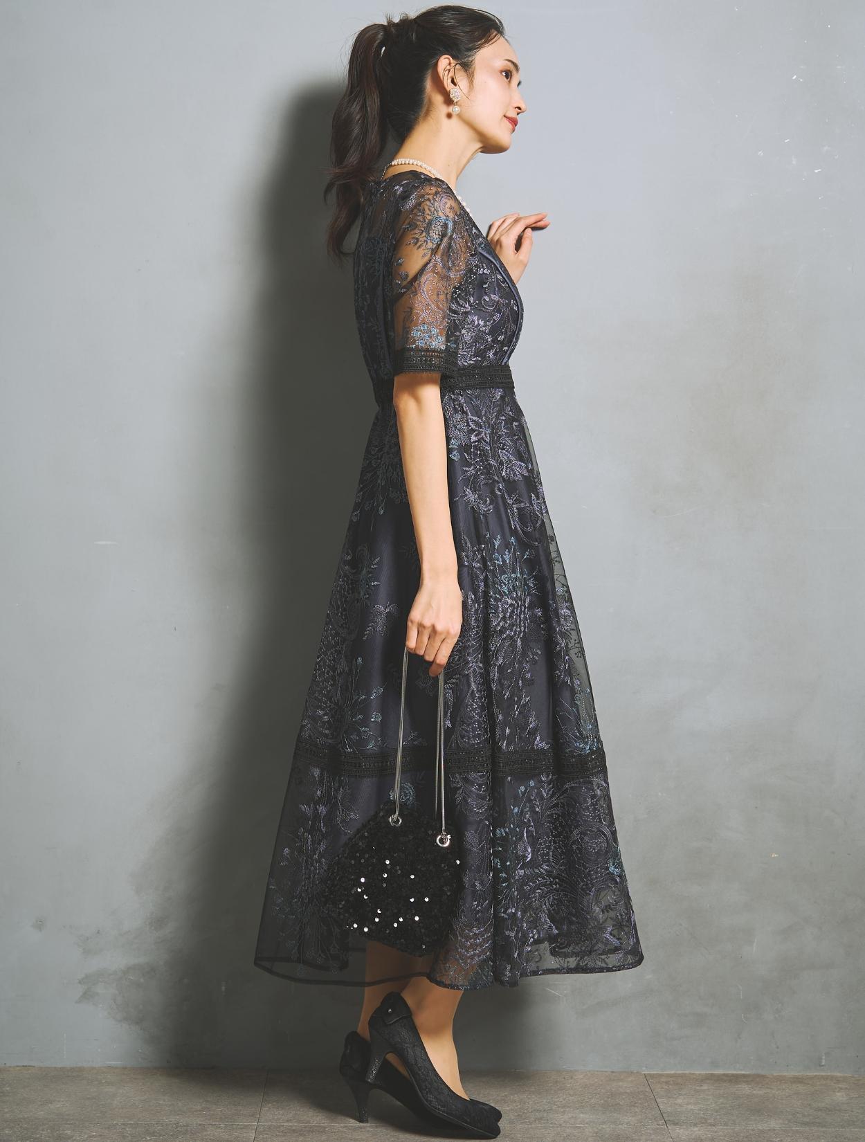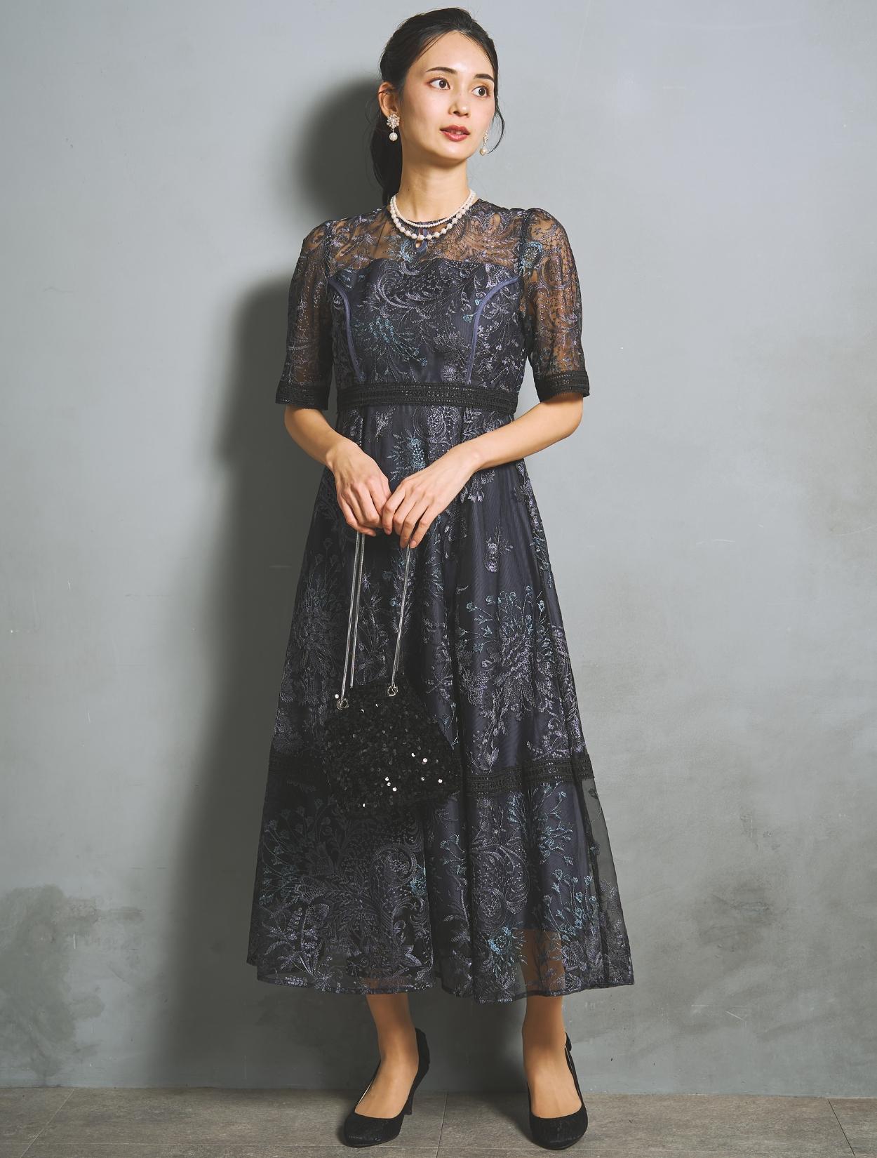 パープルやブルーなど青味系の刺繍レースが、ネイビードレスを華やかにアップデート。裏地のネイビーも濃くはっきりした色味で、地味見えしません。ブラックのレースパイピングがアクセントになります。