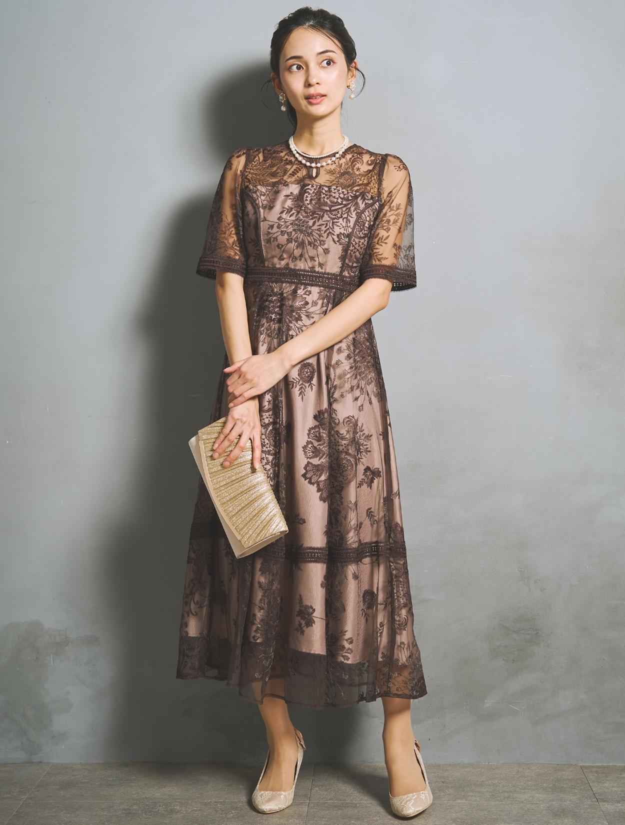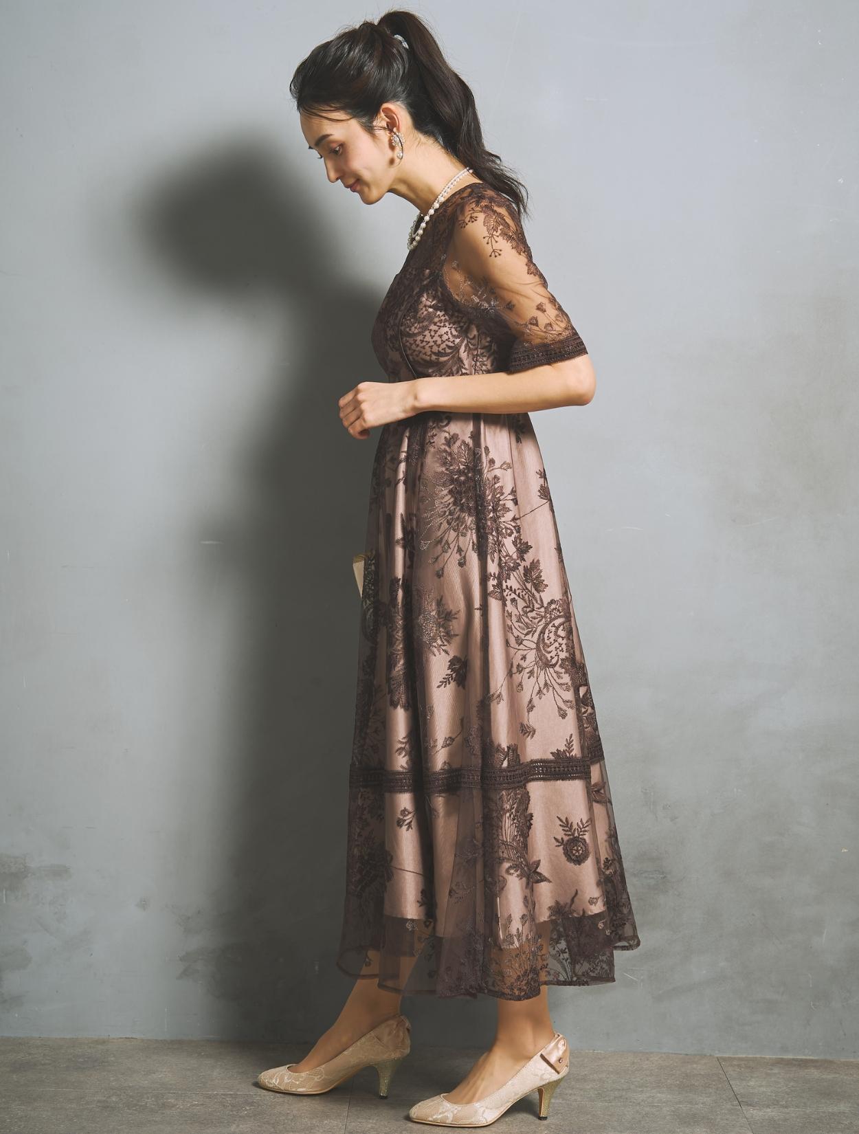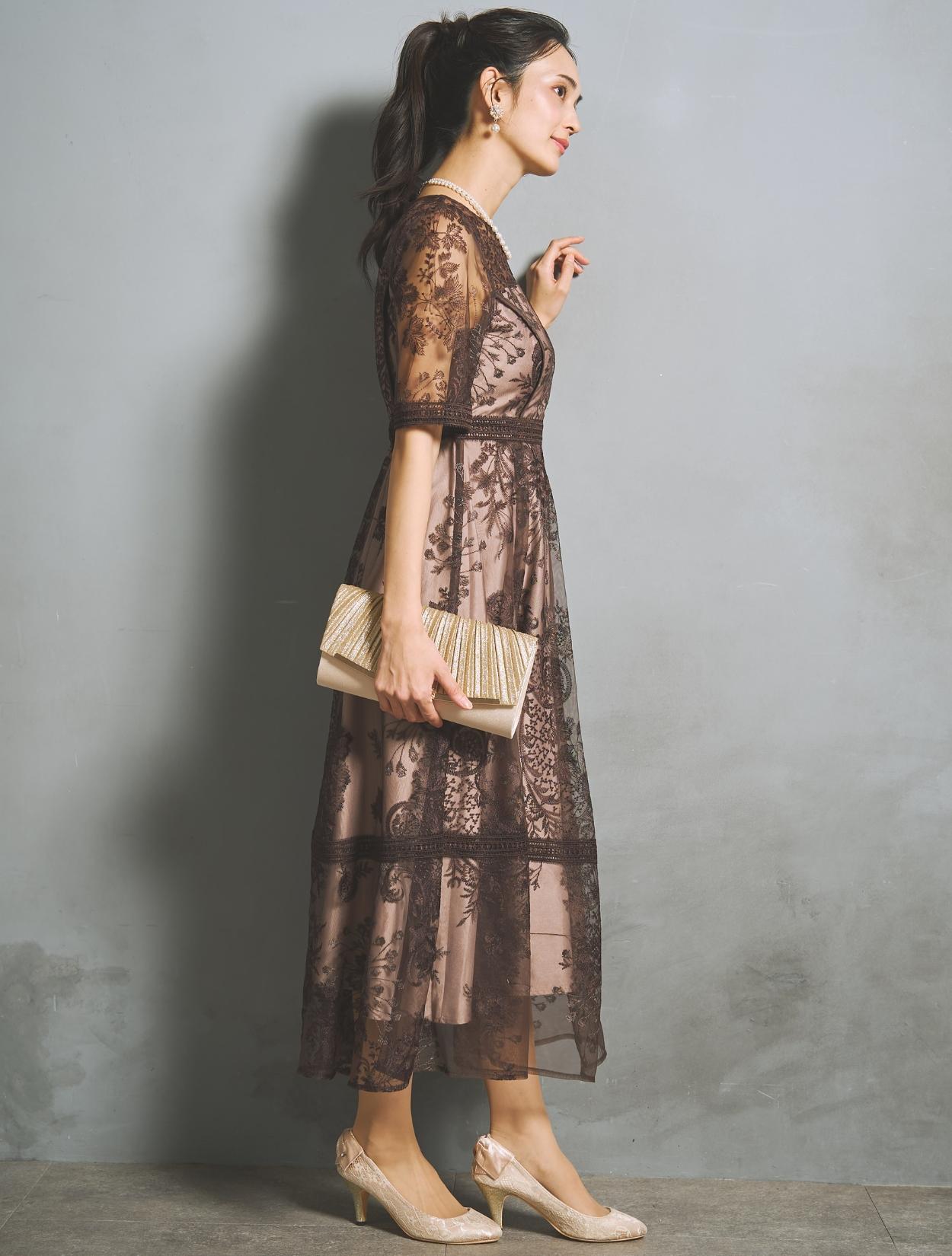刺繍レースとレースパイピングは同色のブラウンで、落ち着いたフォーマル見えするカラー。裏地は明るいベージュ系のカラーで、レースの柄をしっかり引き立ててくれます。