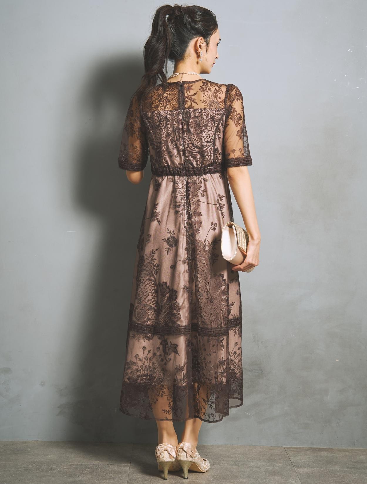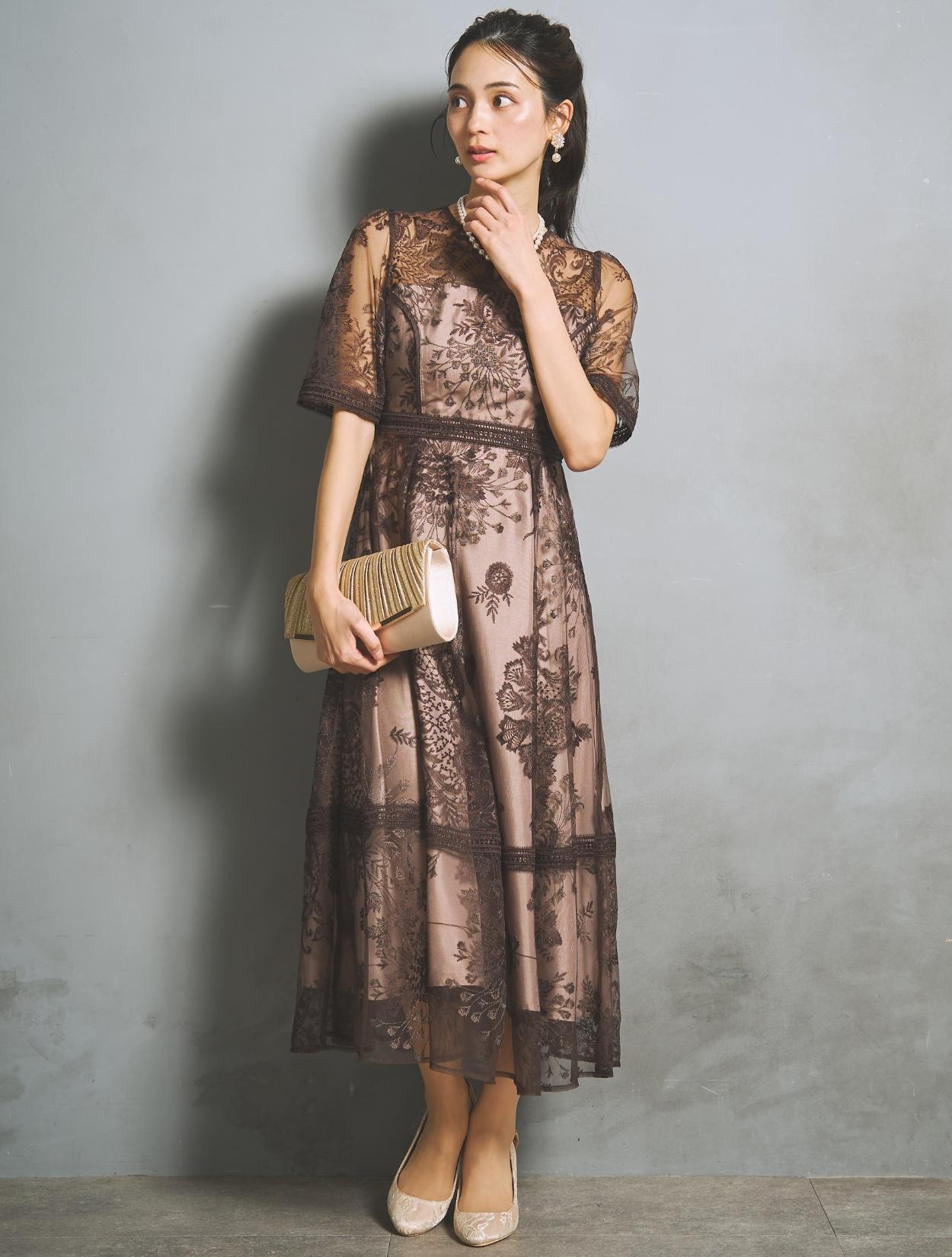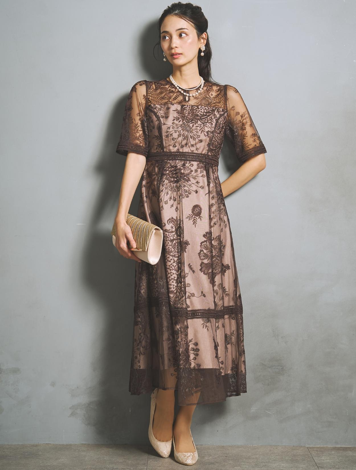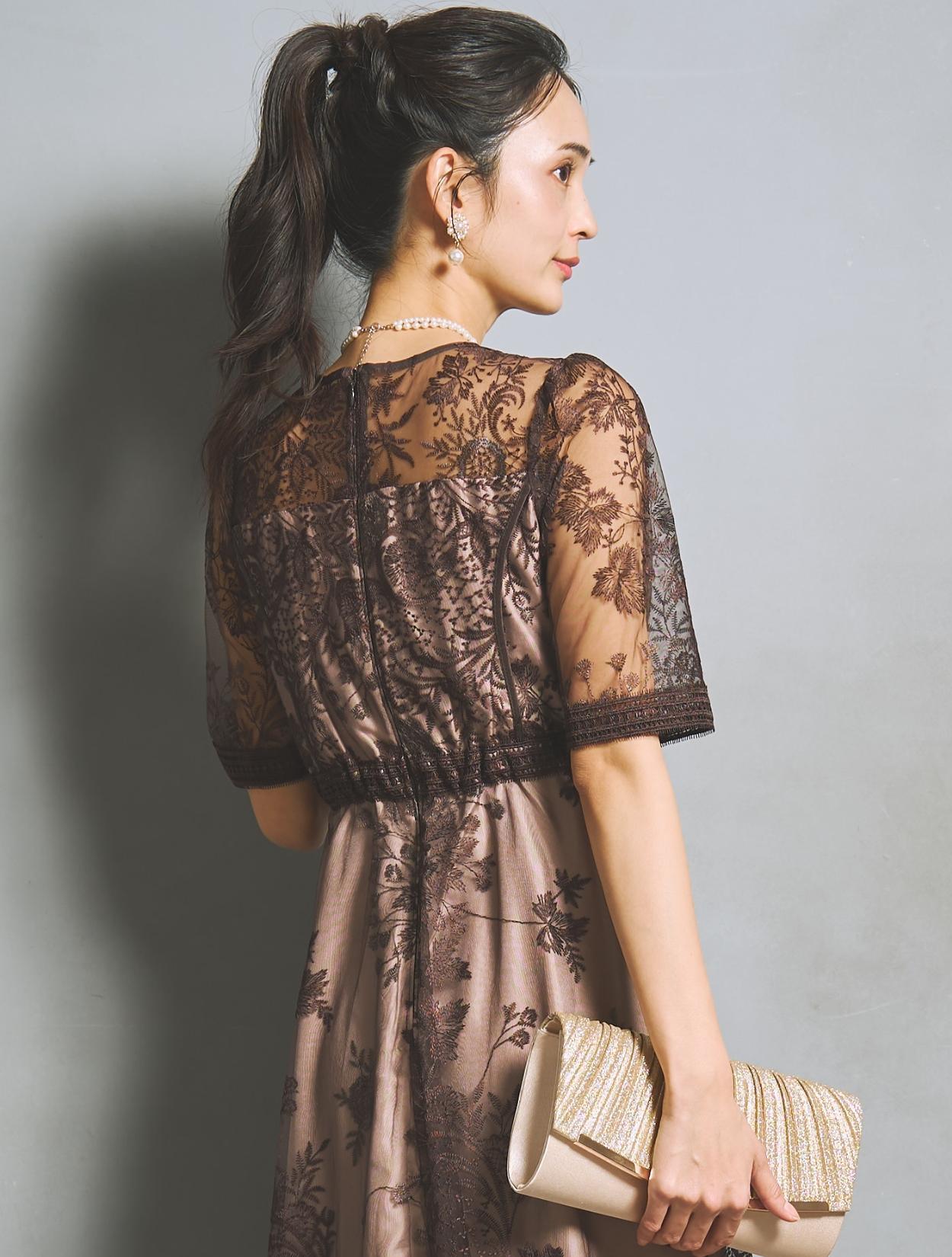 刺繍レースとレースパイピングは同色のブラウンで、落ち着いたフォーマル見えするカラー。裏地は明るいベージュ系のカラーで、レースの柄をしっかり引き立ててくれます。