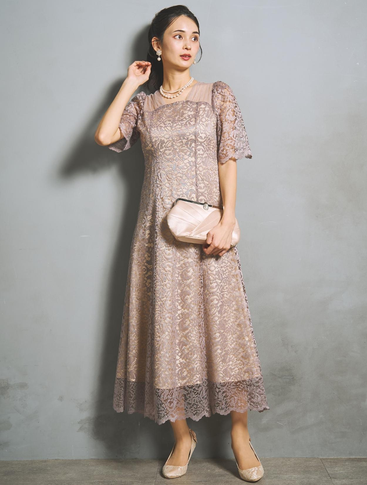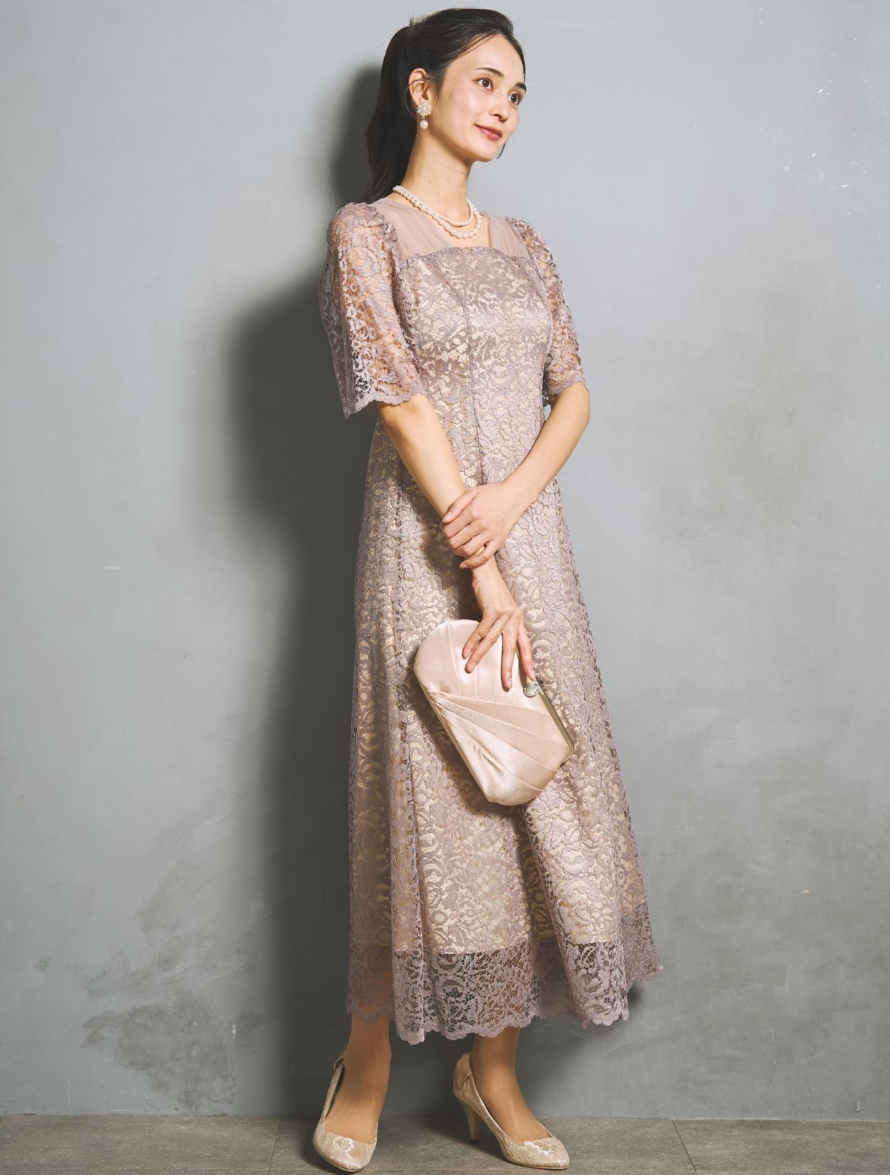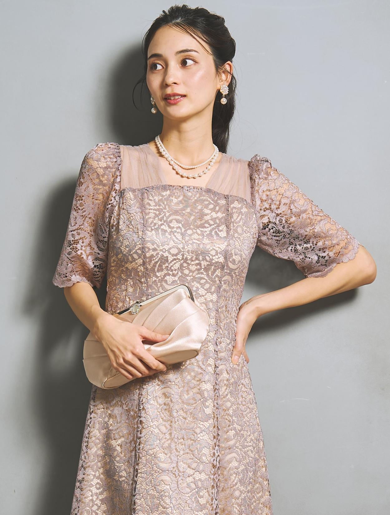 上品に露出を抑えつつも首元をスッキリ見せてくれるスクエアネックのドレス。ネックレスが映えるデザインでもあります。レースと裏地のコントラストで柄が引き立ち、華やかな結婚式やパーティーシーンにぴったりです。
