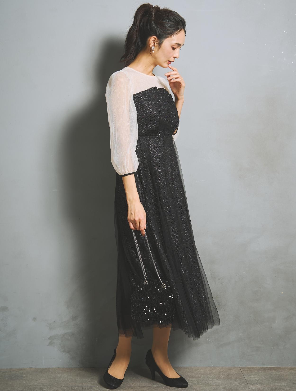ビスチェ風のデザインにハイウエスト切り替えで、スタイルにメリハリが出ます。ビスチェデザインは立体感があり、上半身が華奢な方でも上品に盛れて◎。フワッとした七分袖は、気になる二の腕をカバーしつつ、手首を覗かせて華奢見えします。袖部分のシアー感で抜け感もあり。