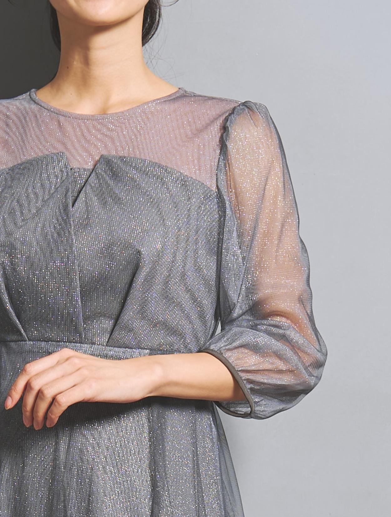 ラメチュールと無地チュールを重ねた、華やかでエアリー感たっぷりのドレス。歩くたびスカートがフワッと揺れて、軽やかに広がります。